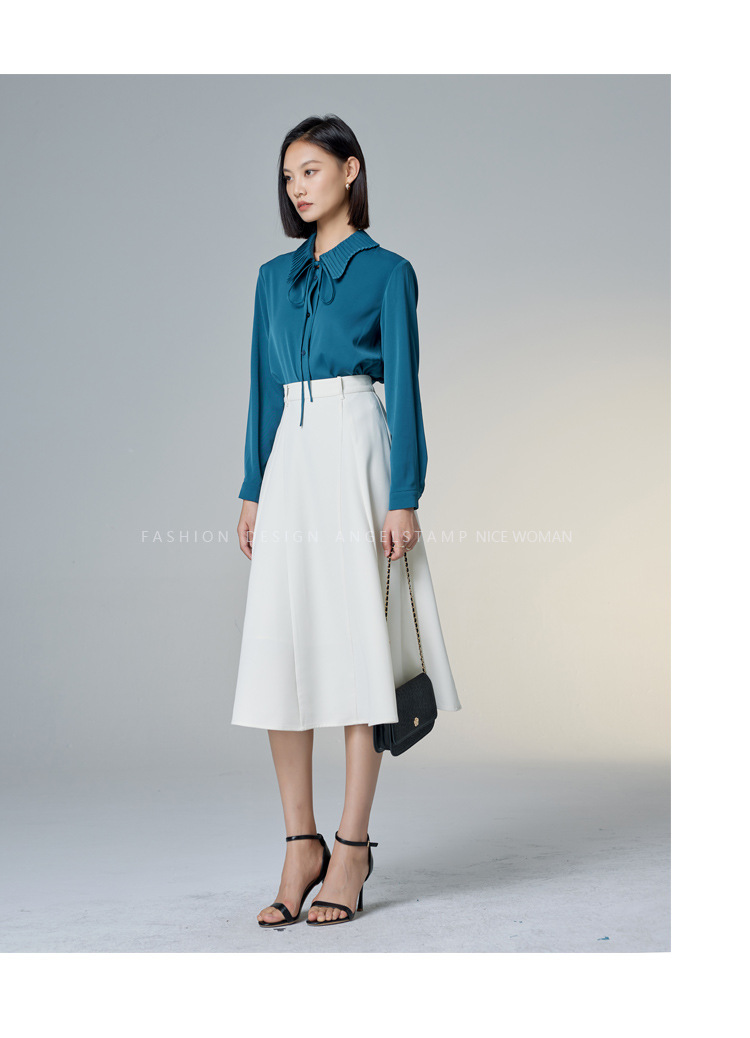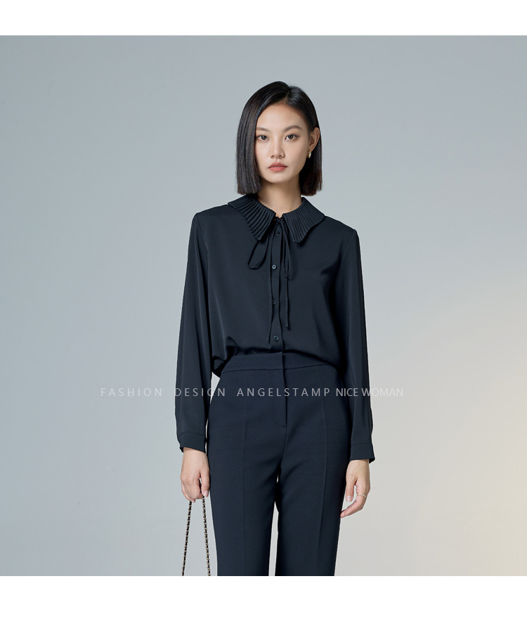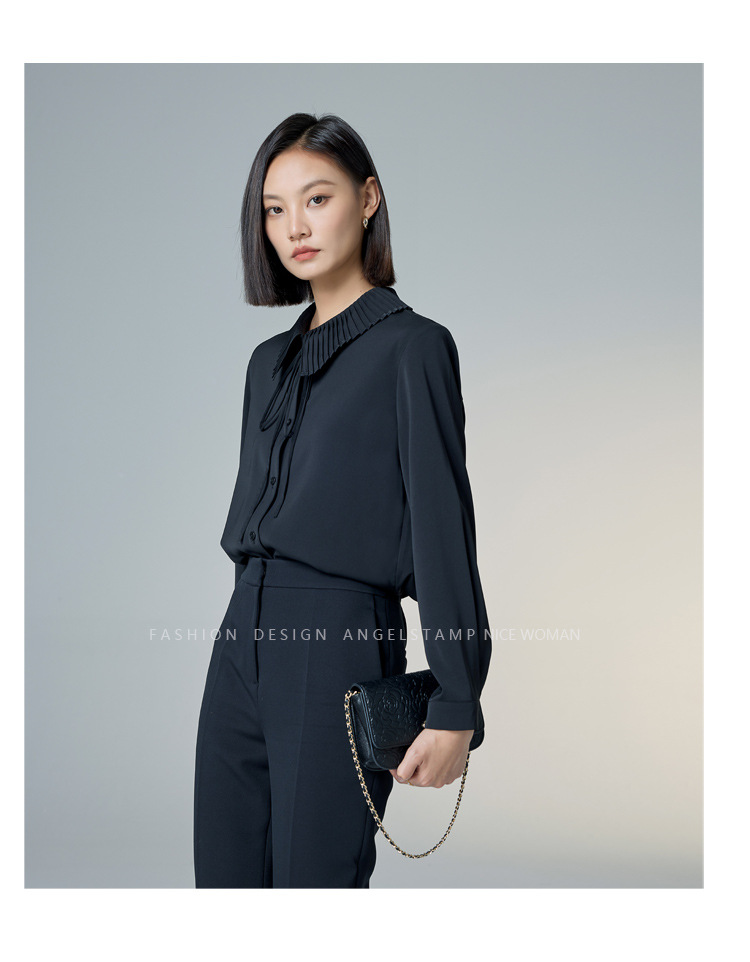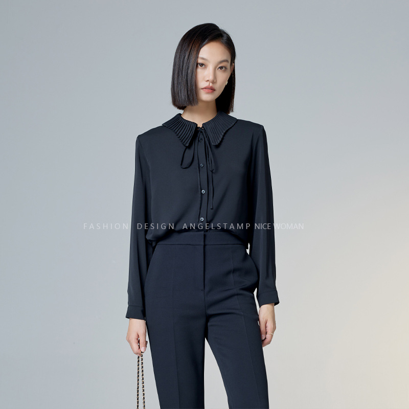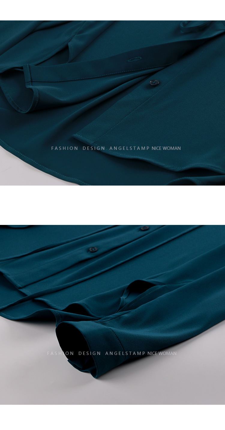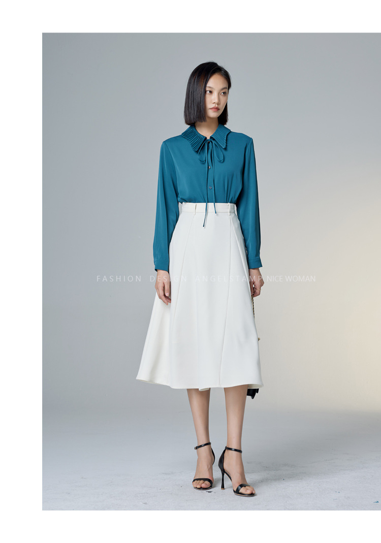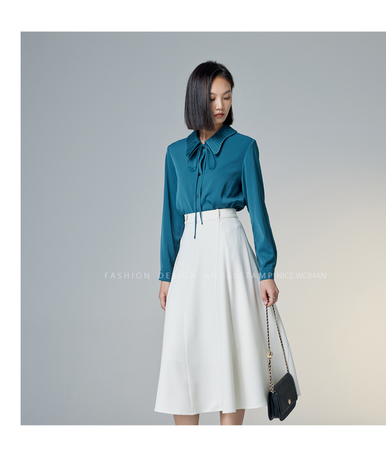 2025 새로운 틈새 디자인 불규칙한 오르간 칼라 레이스 업 공작 블루 긴팔 여성용 전문 셔츠