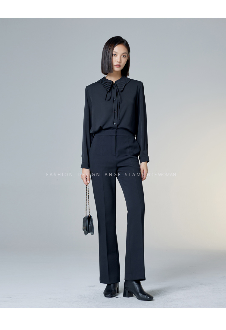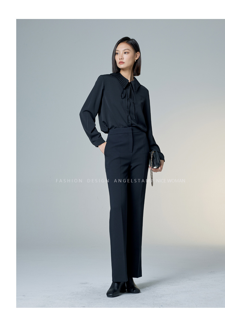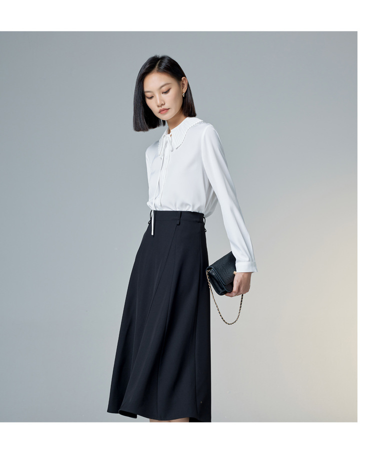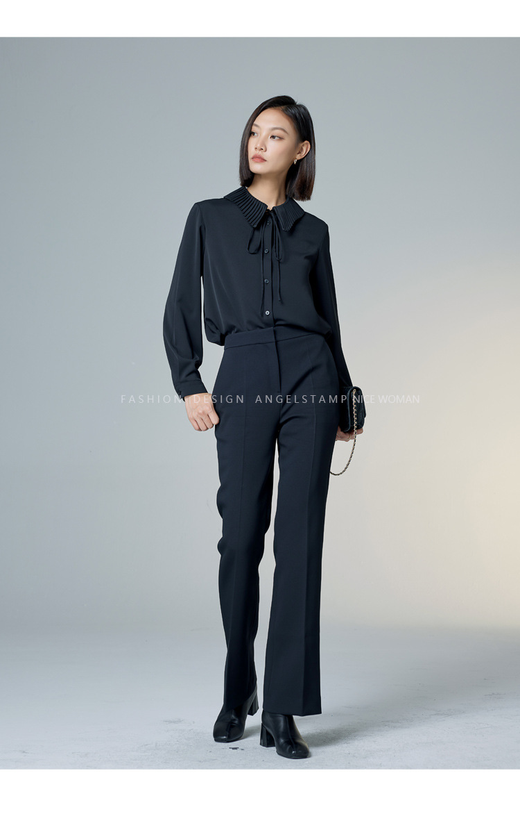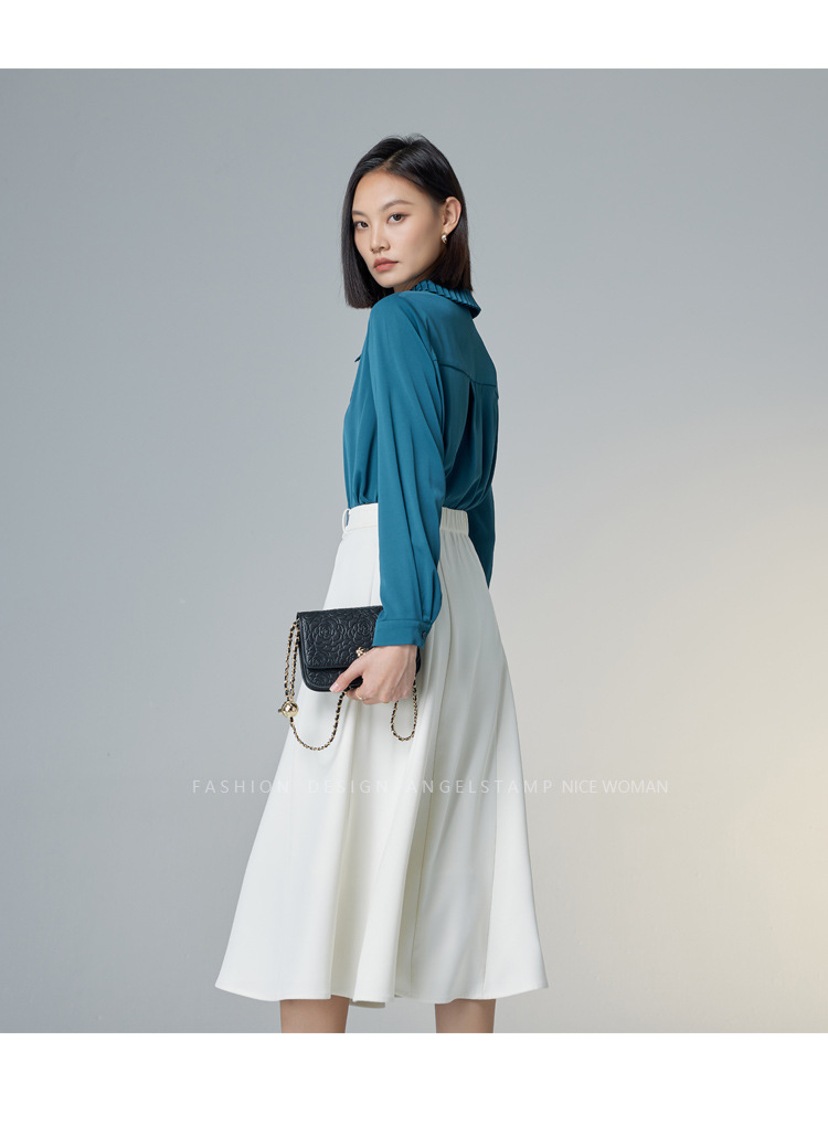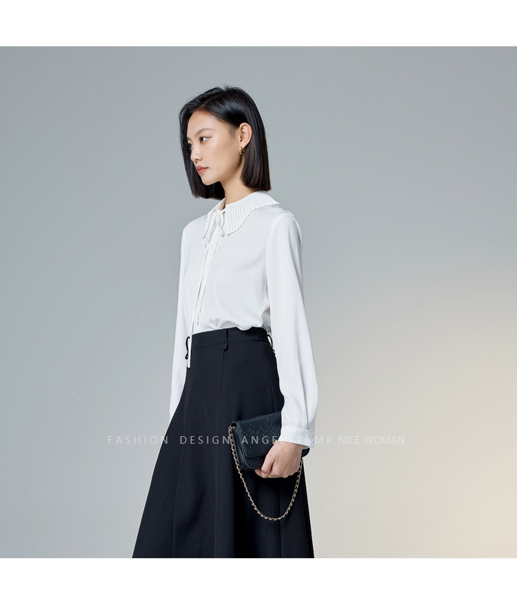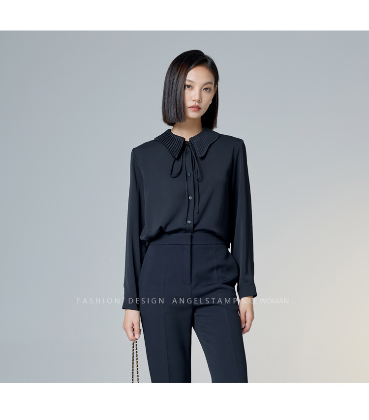 2025 새로운 틈새 디자인 불규칙한 오르간 칼라 레이스 업 공작 블루 긴팔 여성용 전문 셔츠