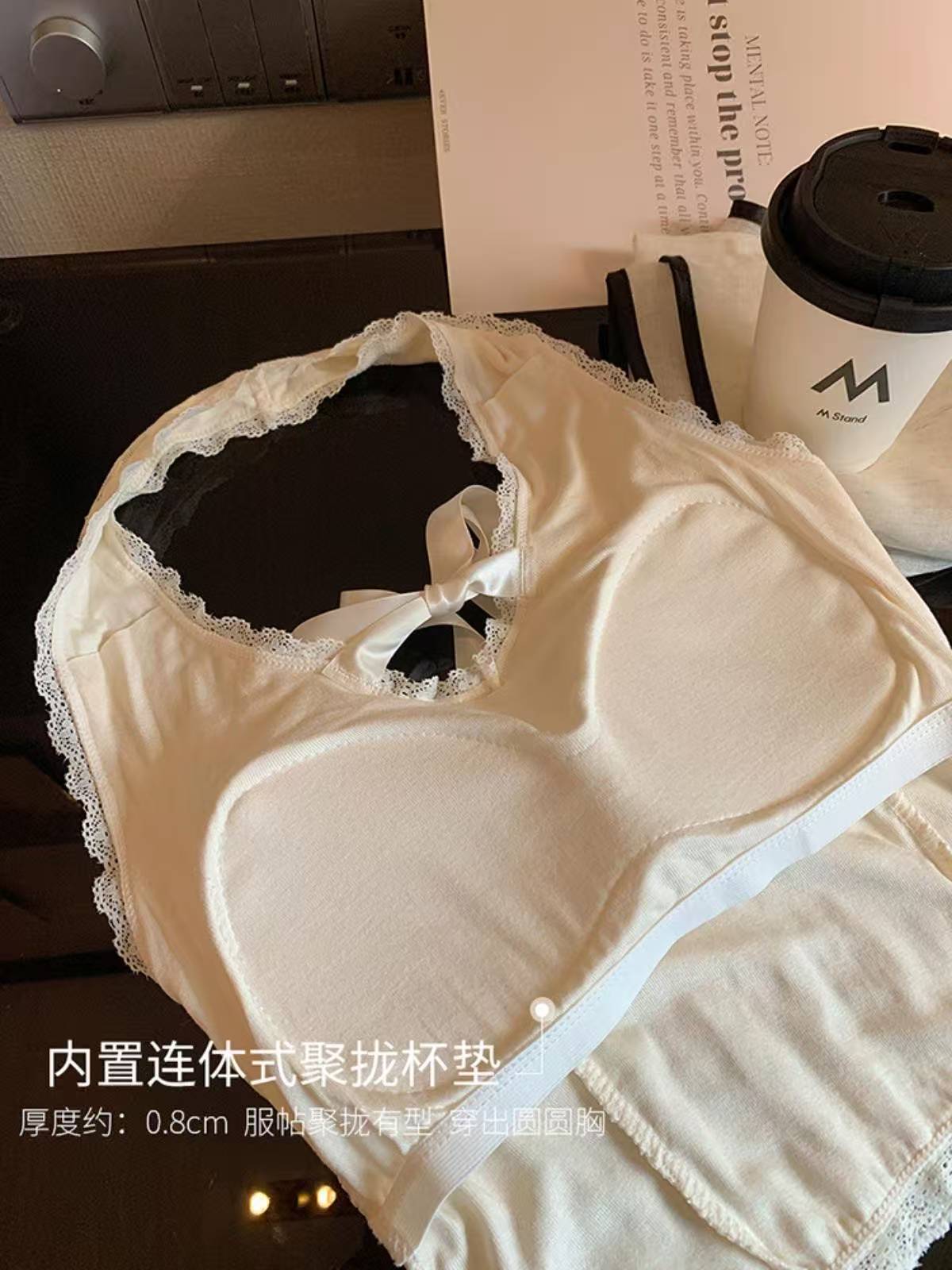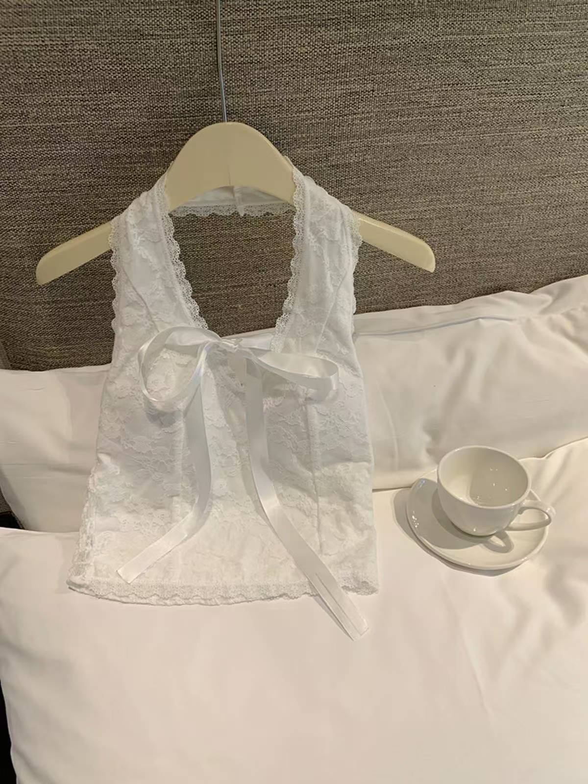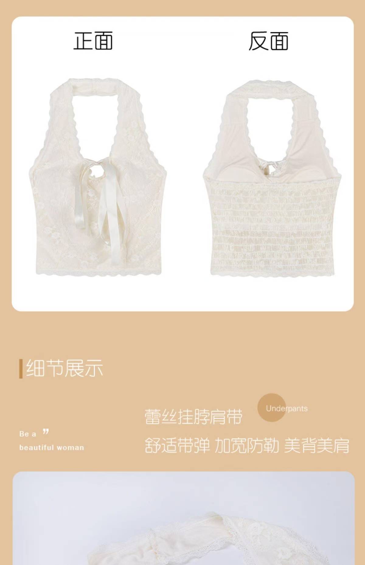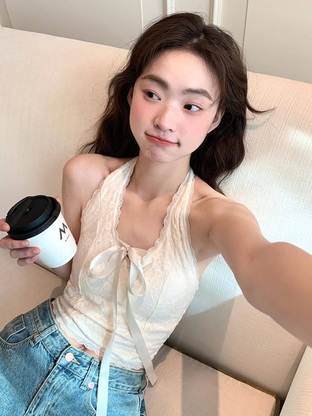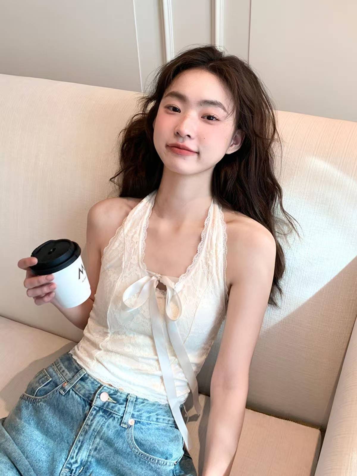 여름에 매듭이 달린 여성용 순수한 욕망 레이스 홀터넥 조끼, 아름다운 등, 달콤하고 매운 소녀, 내부 및 외부 착용, 가슴 패드 탑