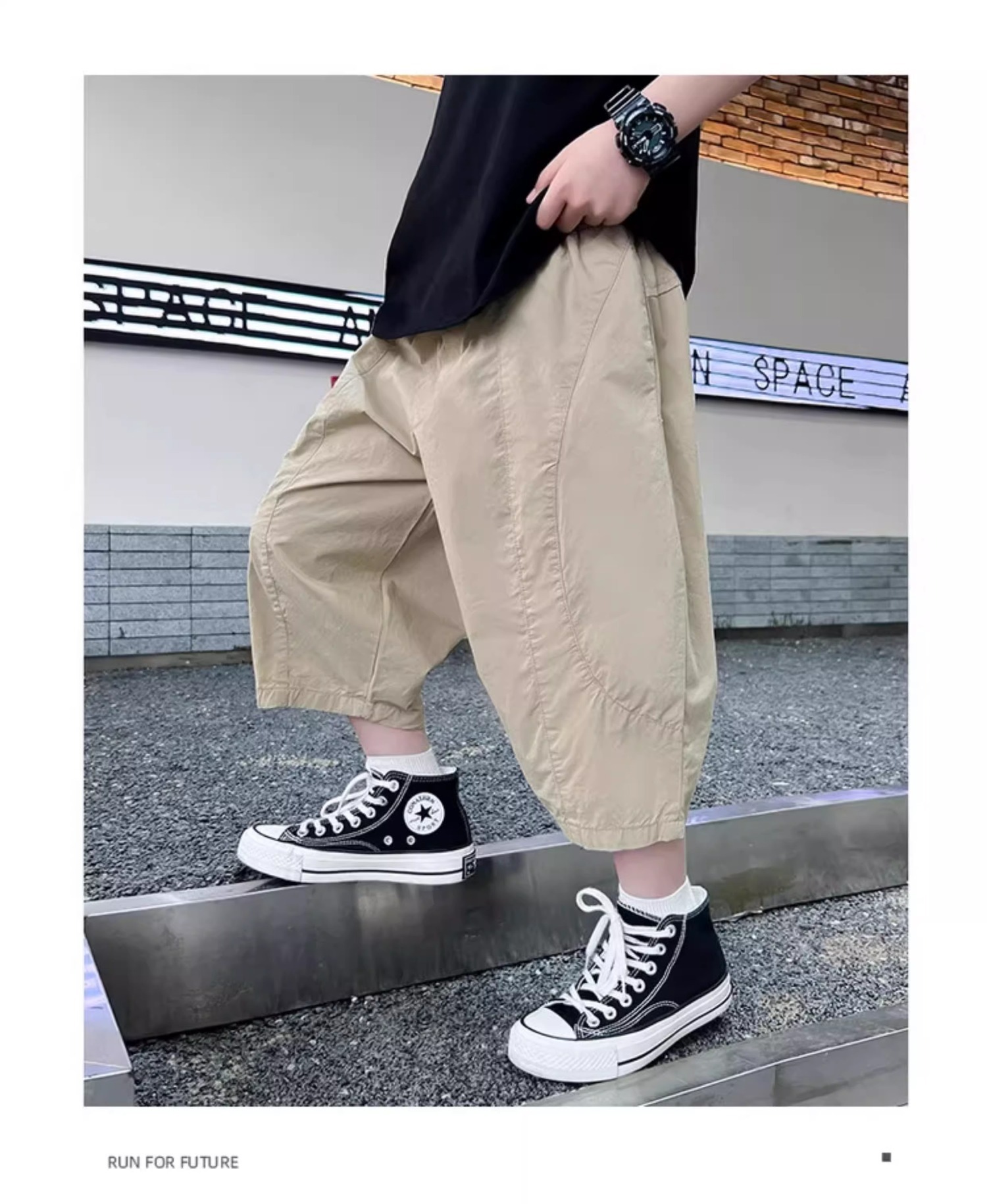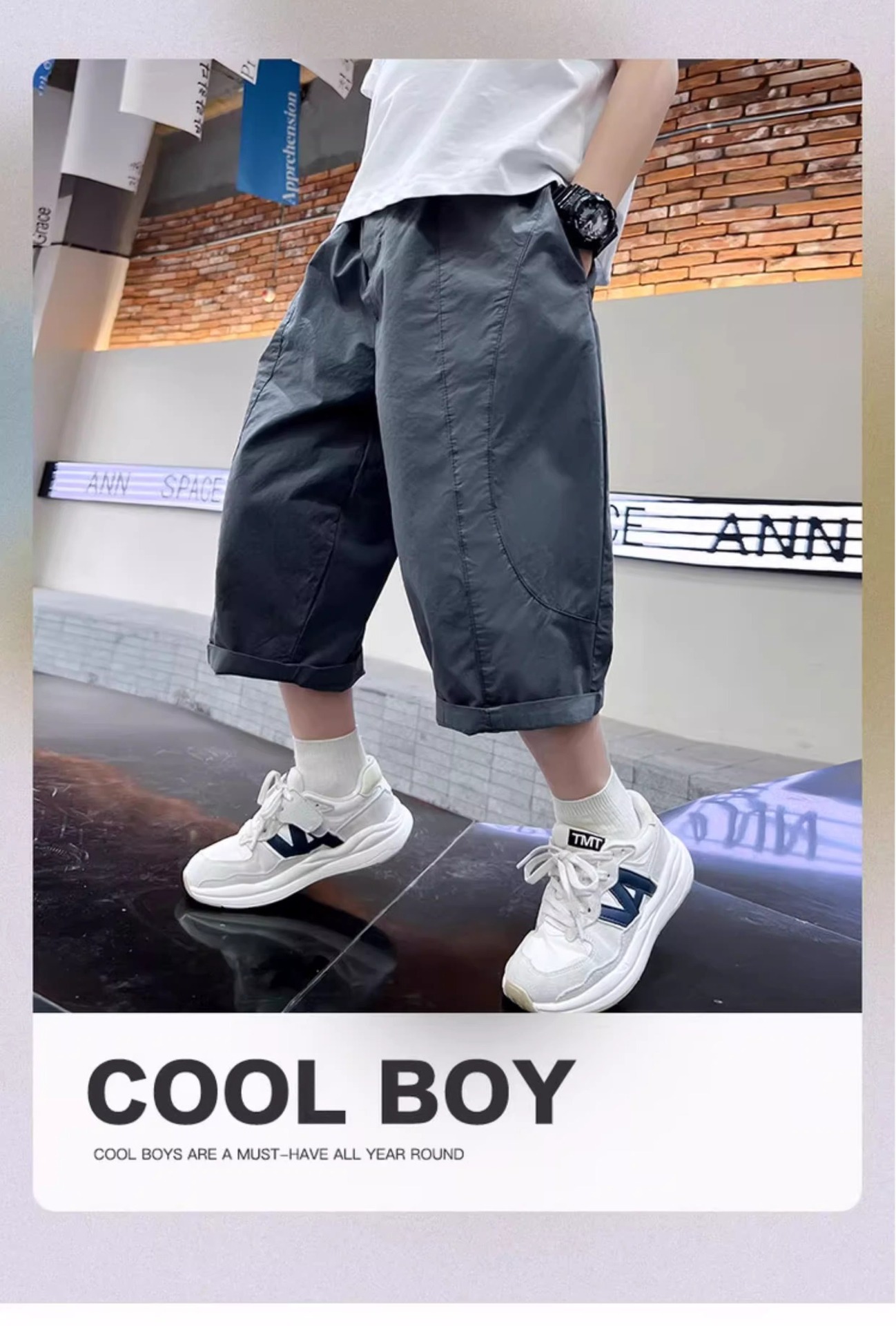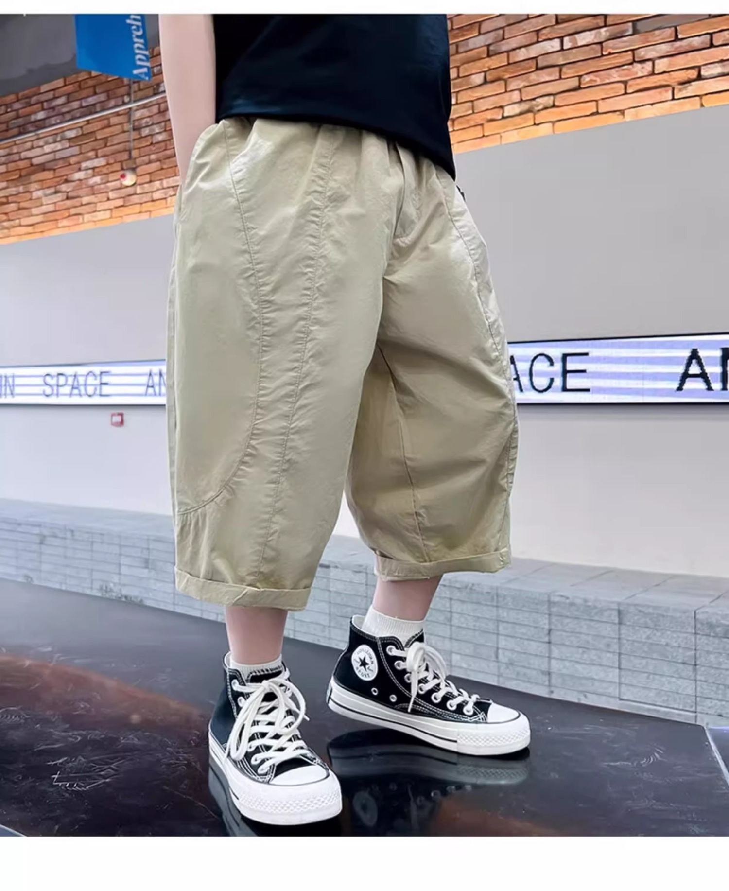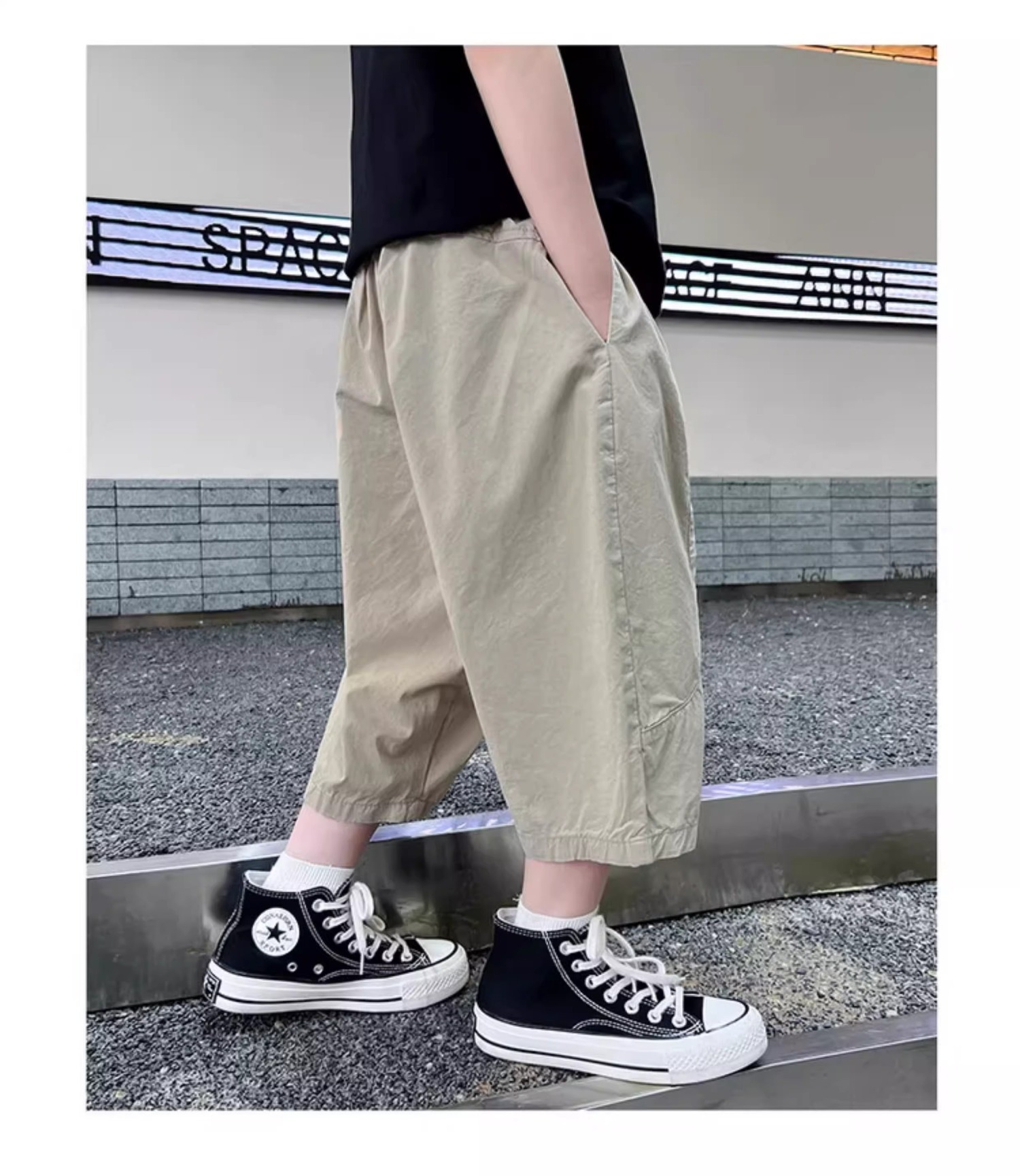남아용 여름 루즈 캐주얼 크롭 팬츠, 와이드 레그 반바지, 주름 디자인, 스포츠 니치, 중대형 어린이를 위한 다용도 스타일