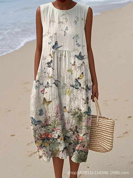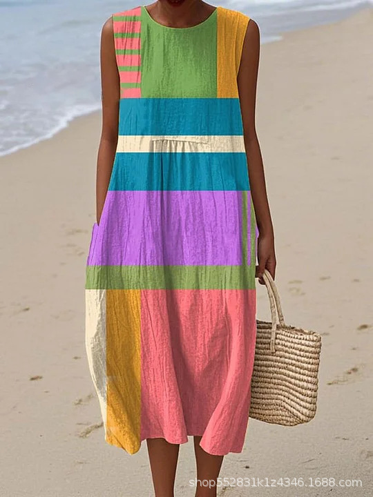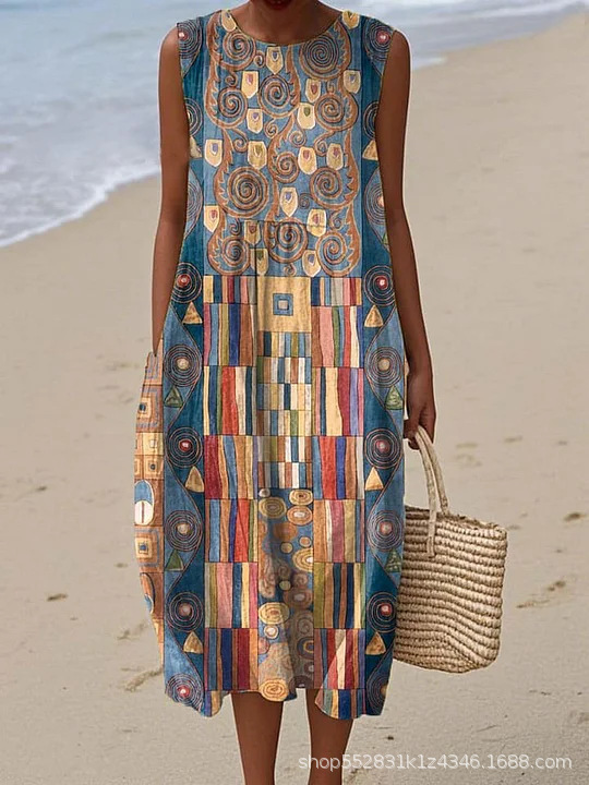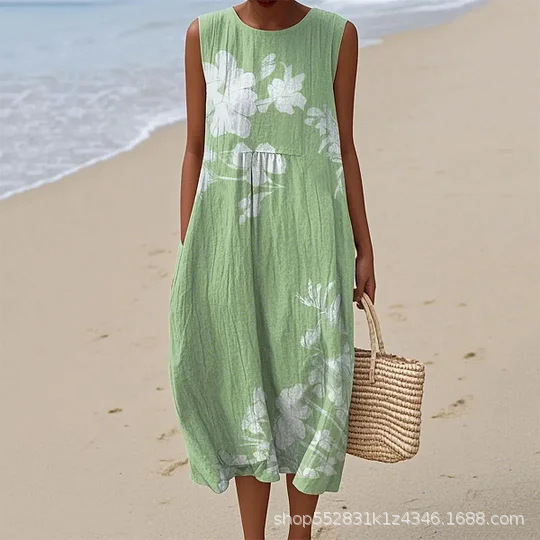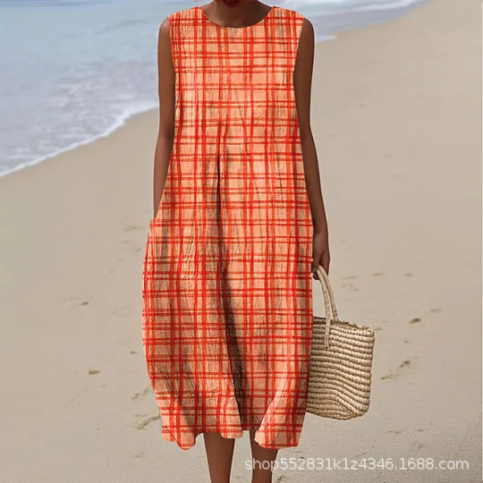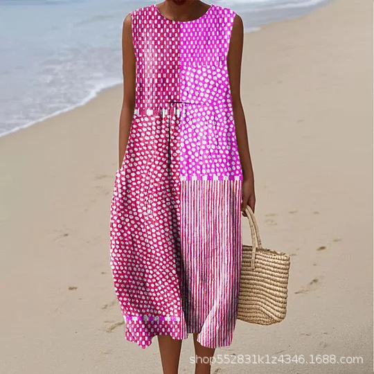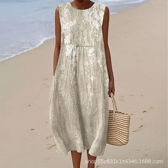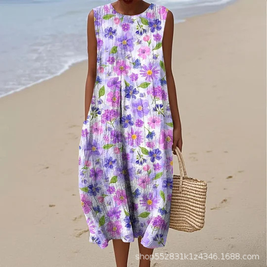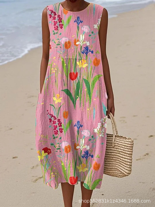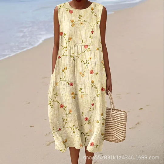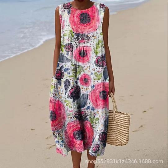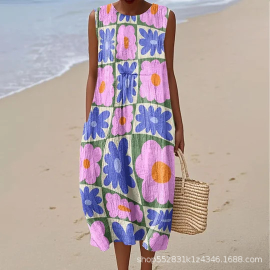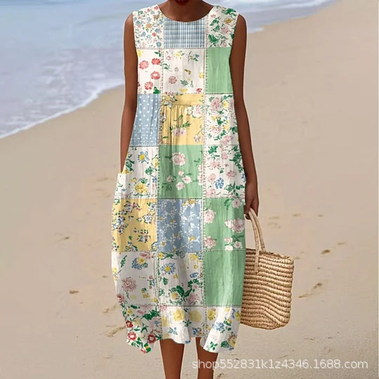 2025 유럽과 미국의 봄 여름 새로운 스타일 민소매 캐주얼 프린트 기질 롱 스커트 드레스 슬림하고 신선한 캐주얼 스커트스토어 가기