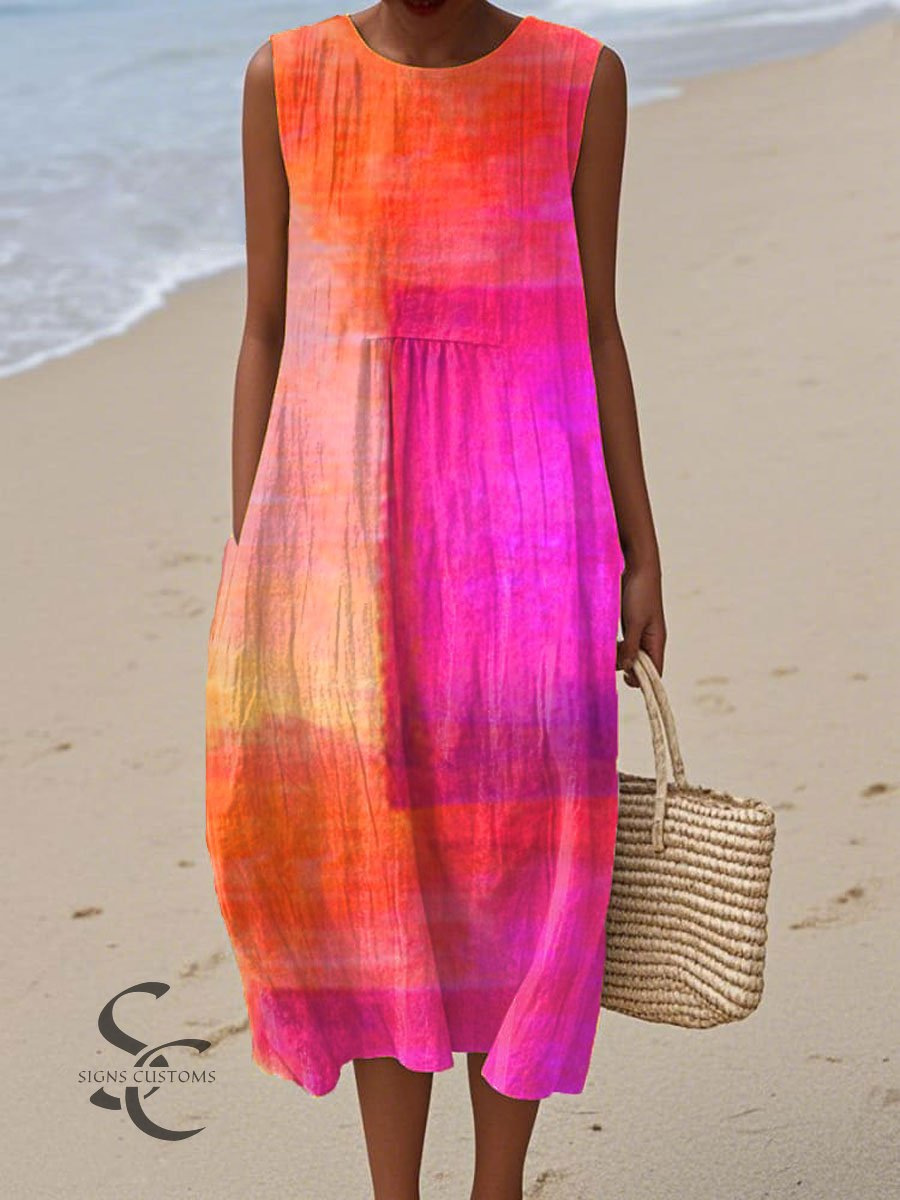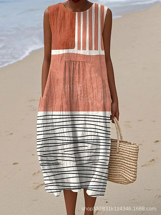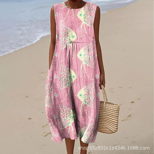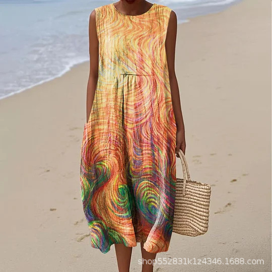 2025 유럽과 미국의 봄 여름 새로운 스타일 민소매 캐주얼 프린트 기질 롱 스커트 드레스 슬림하고 신선한 캐주얼 스커트