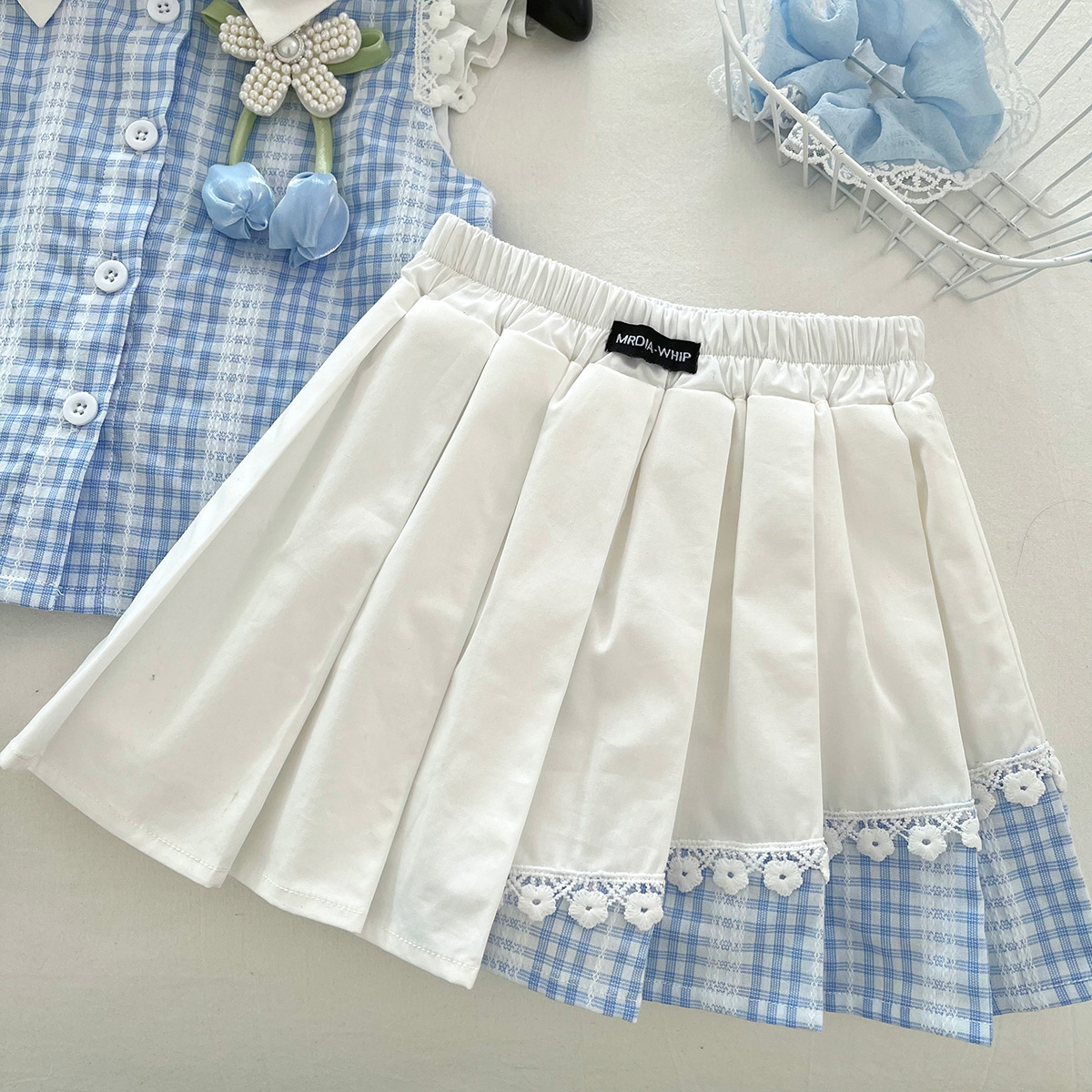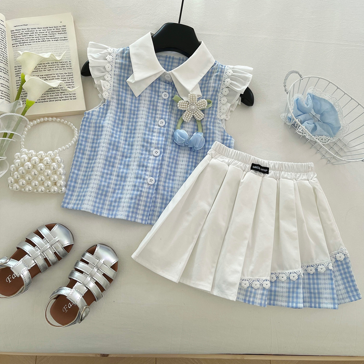 신상 아동복, 여아를 위한 새로운 한국 스타일 패셔너블한 플라잉 슬리브 셔츠 + 플리츠 스커트, 달콤한 투피스 세트스토어 가기