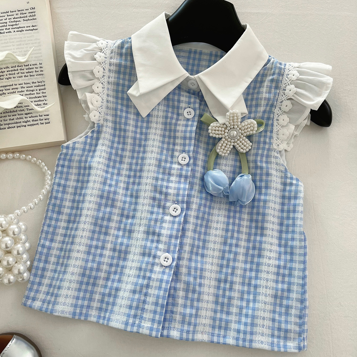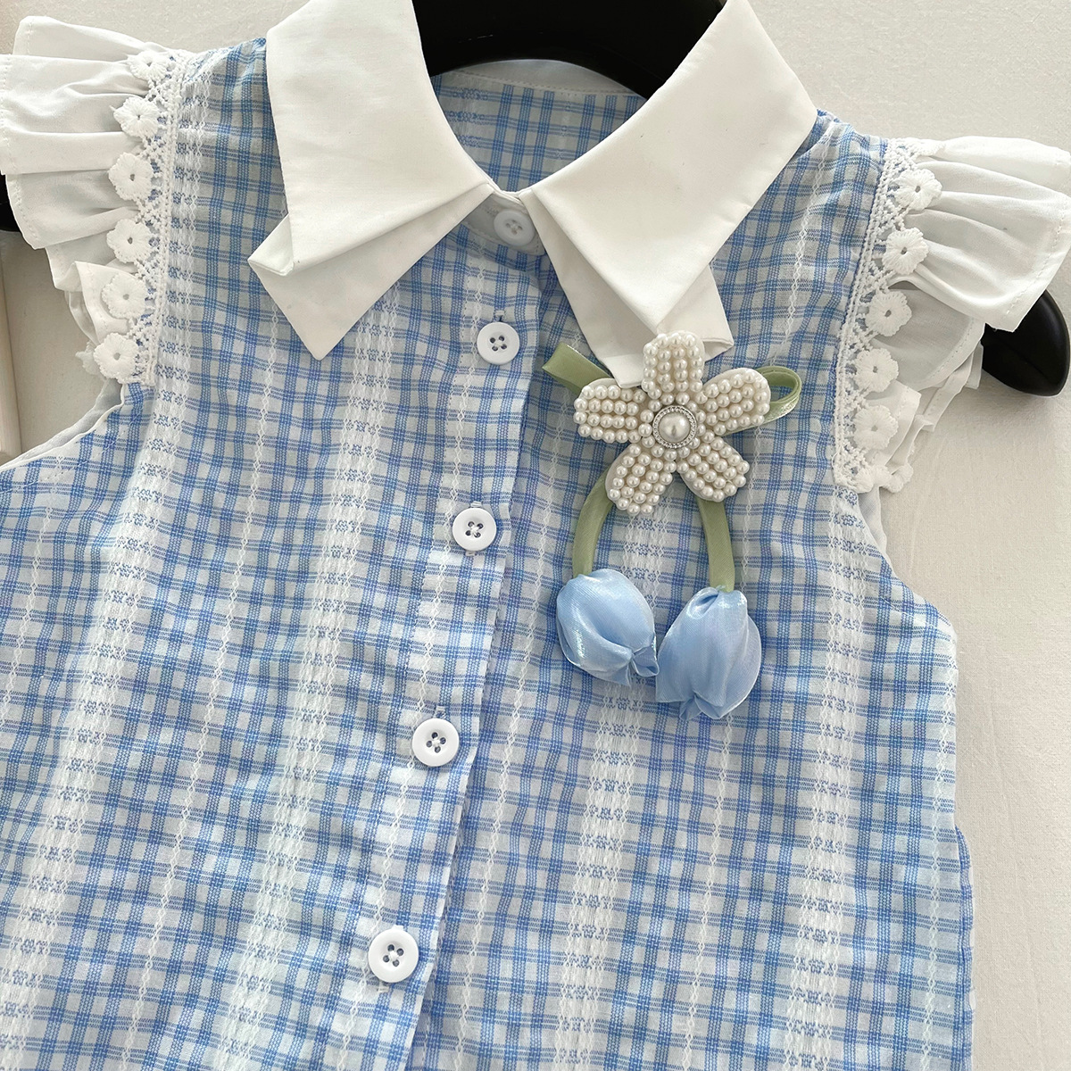 신상 아동복, 여아를 위한 새로운 한국 스타일 패셔너블한 플라잉 슬리브 셔츠 + 플리츠 스커트, 달콤한 투피스 세트