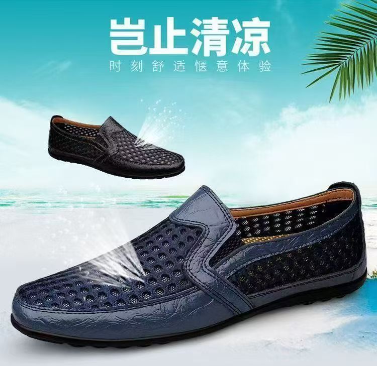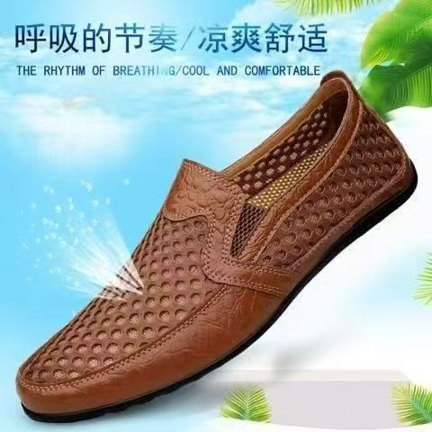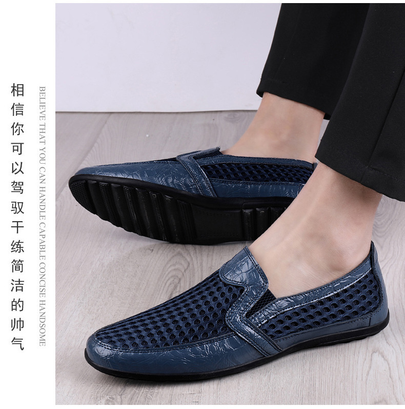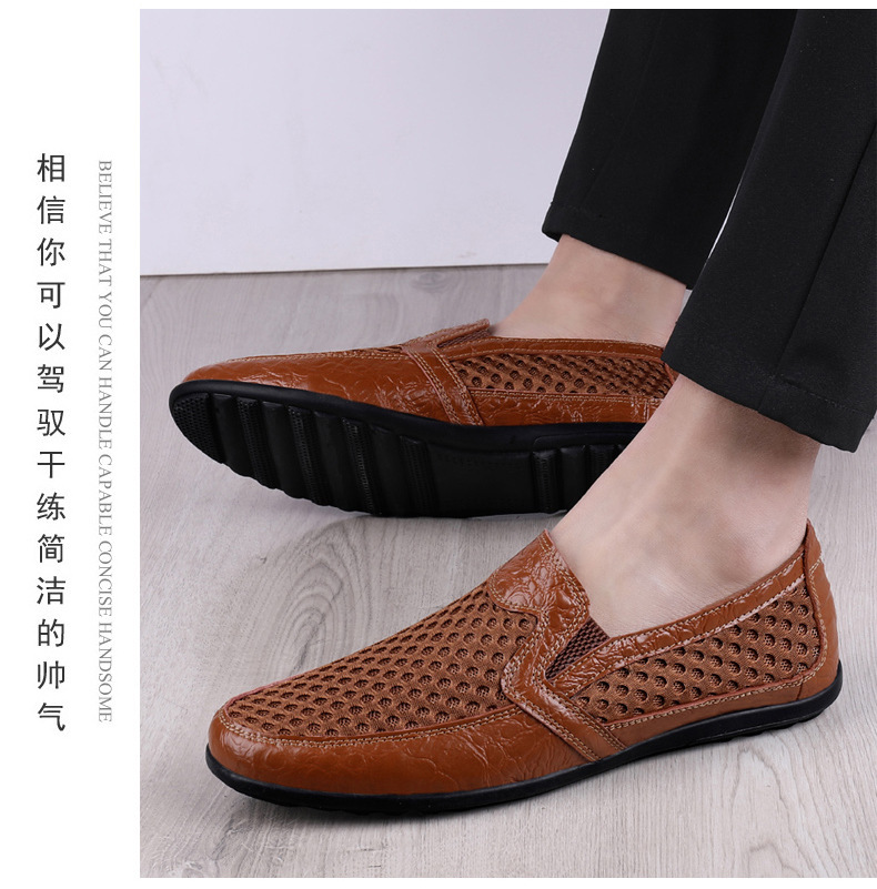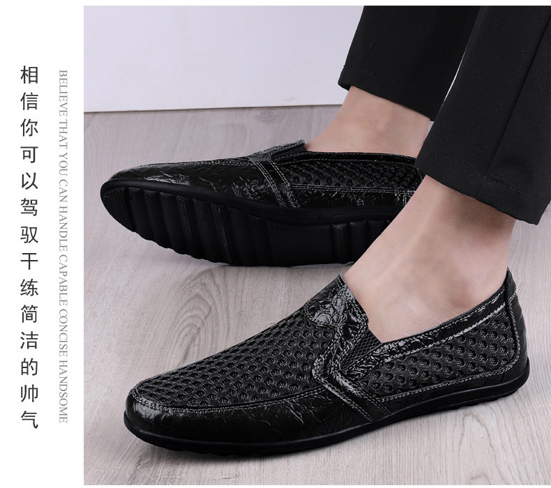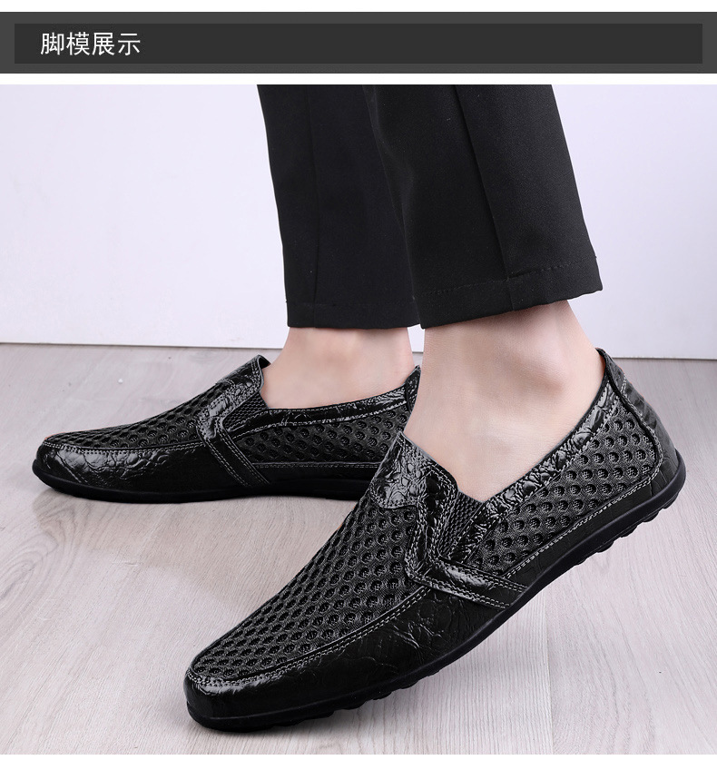 새로운 남성 부드러운 가죽 얇은 메쉬 캐주얼 신발 패션 중공 슬립 온 남성 신발 미끄럼 방지 캐주얼 비니 신발 도매