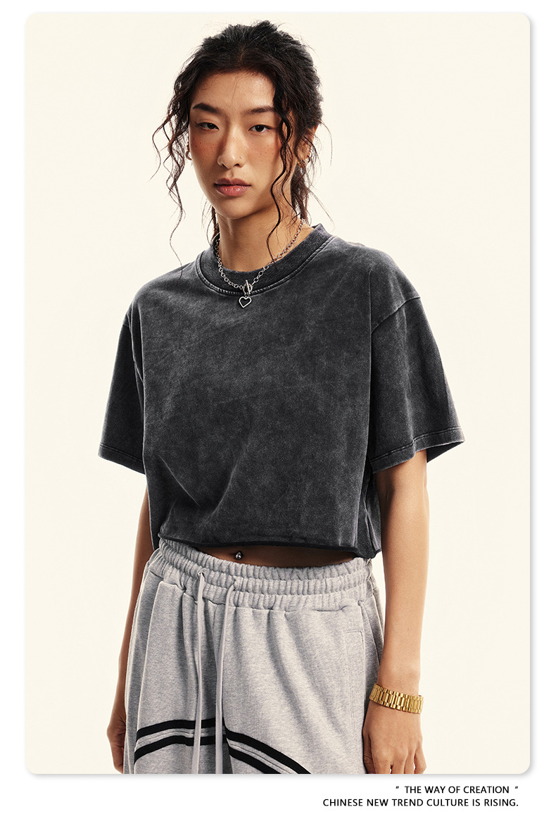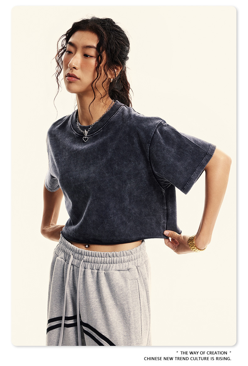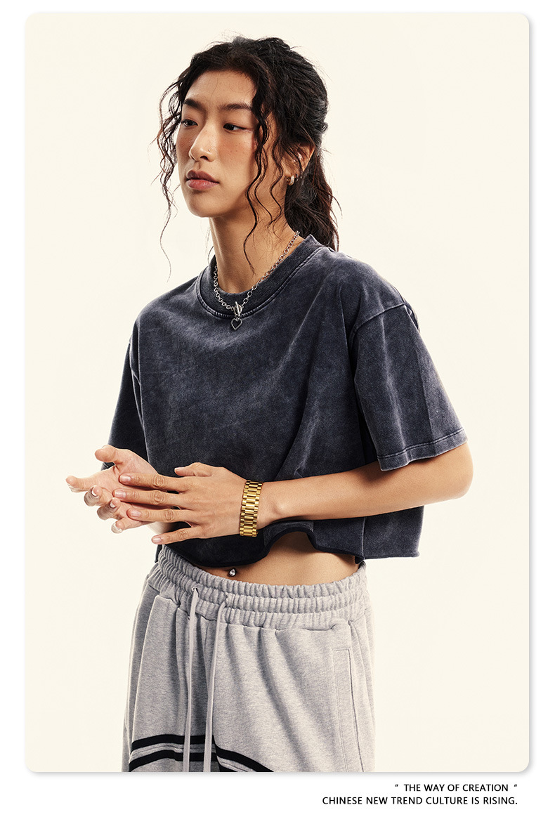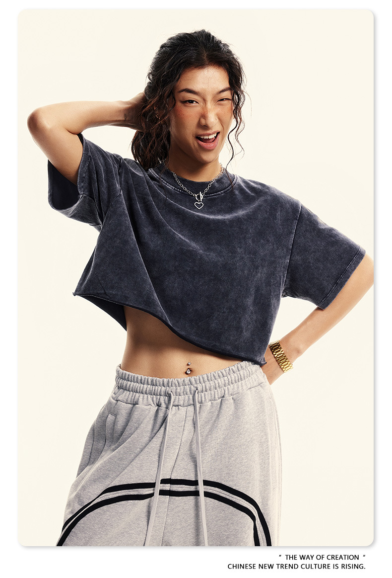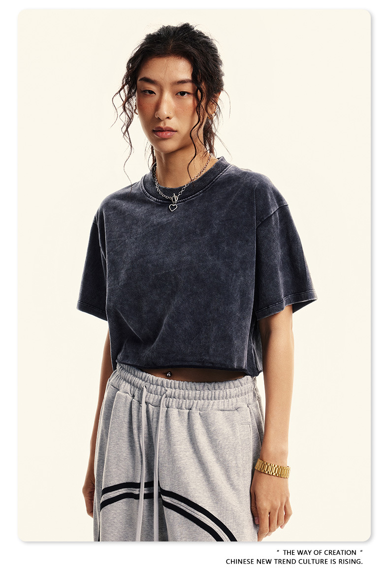 스트리트 드라이 | 유럽과 미국의 트렌디한 브랜드 핫걸 새로운 라운드 넥 올드 워시 브러시 반팔 티셔츠 여성용 짧은 배꼽 노출 여성용스토어 가기