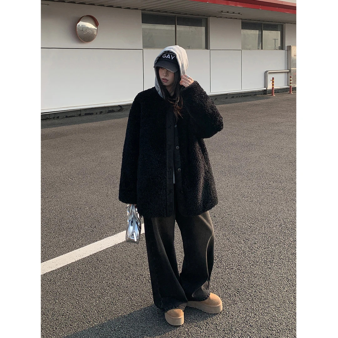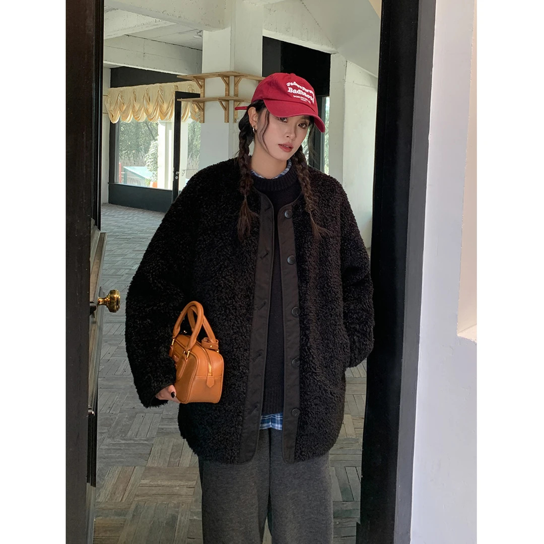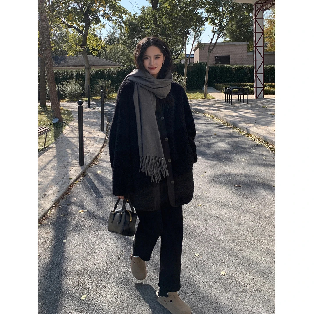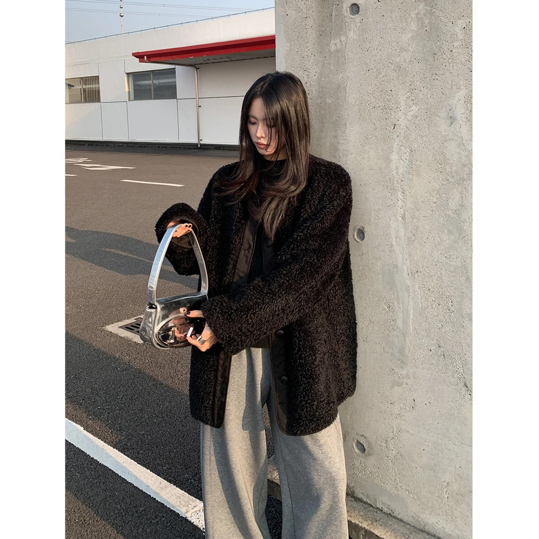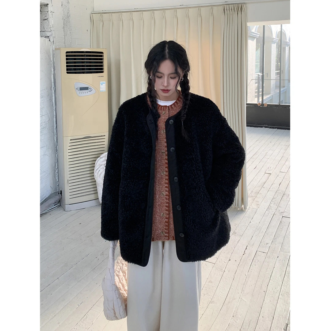 2732 # 파리 미드나잇 블랙 램스울 모피 코트 여성 가을, 겨울 따뜻한 루즈 자켓 코튼 탑