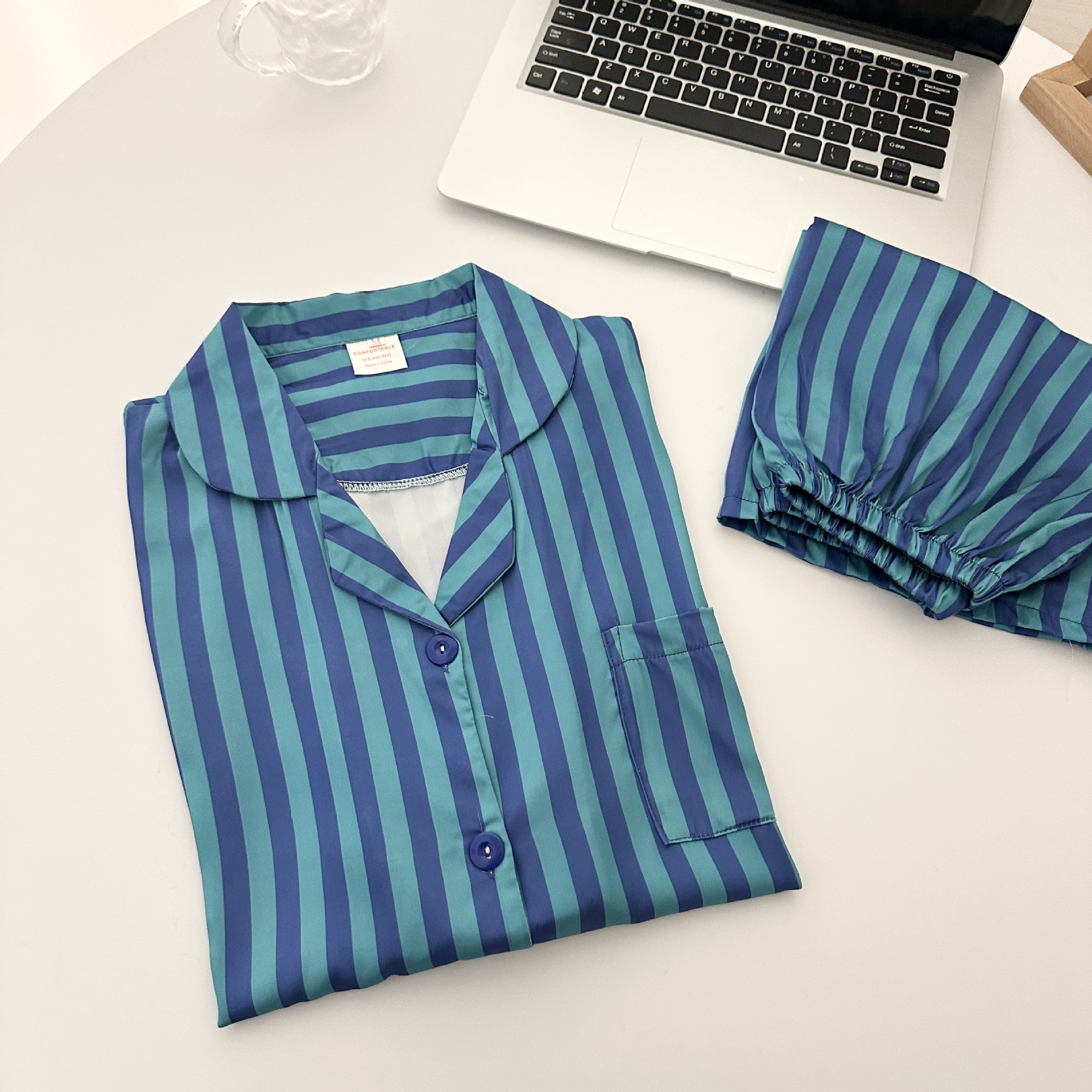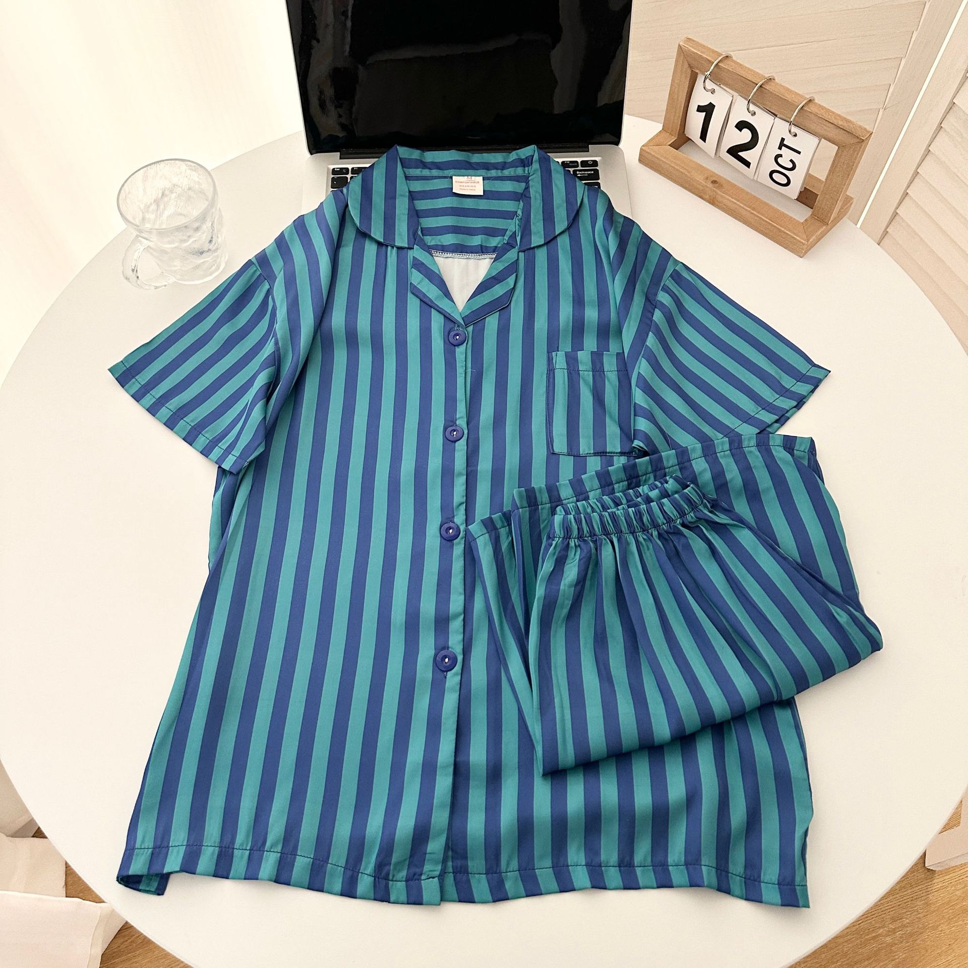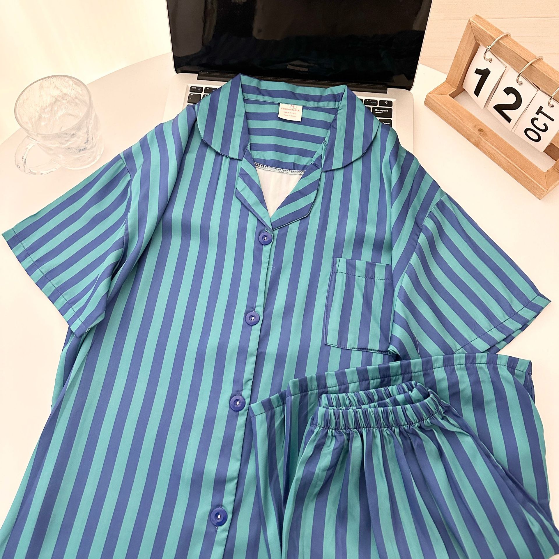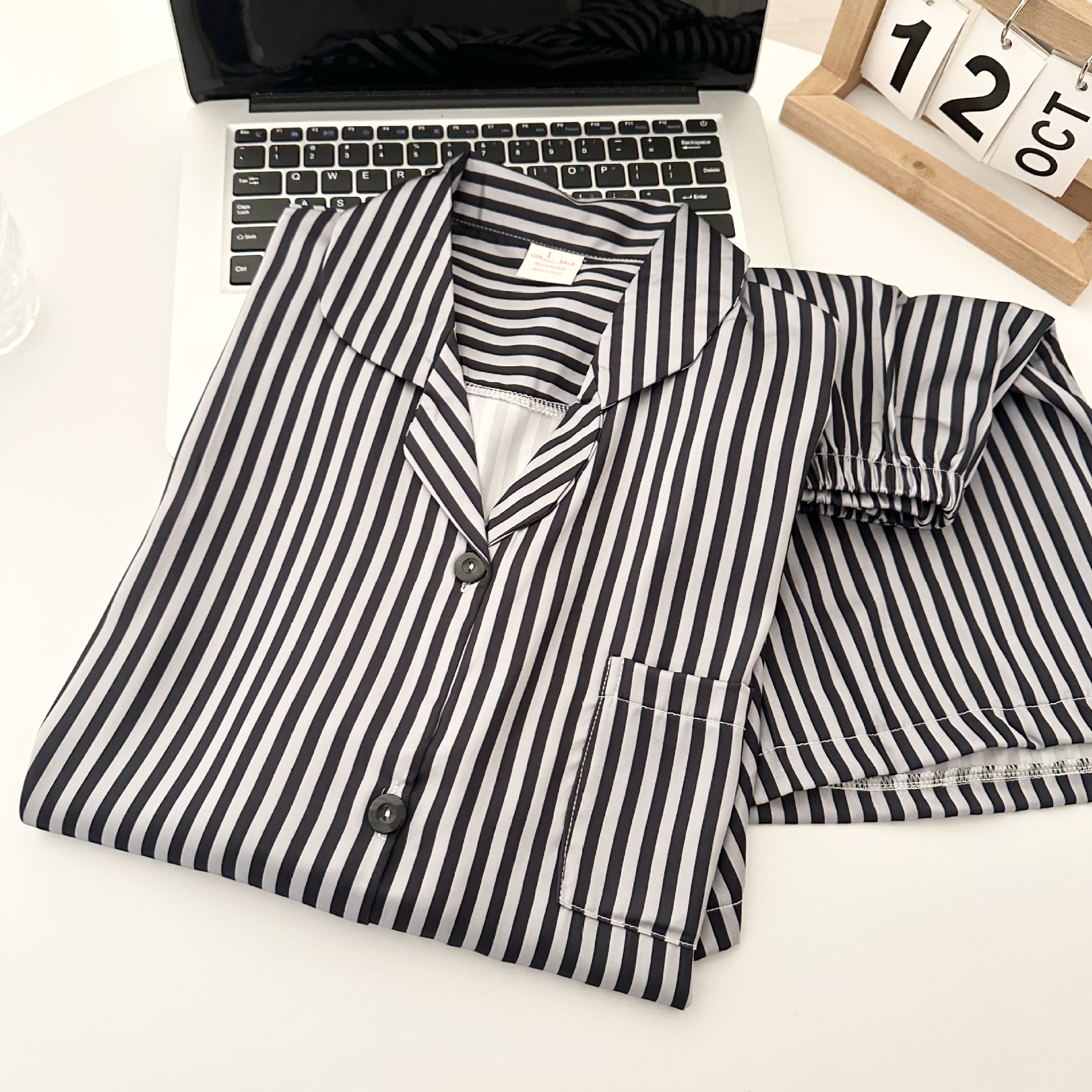 커플 잠옷 여성 여름 반팔 반바지 얼음 실크 시원한 느낌 심플 스트라이프 라펠 남성 홈웨어 투피스 세트