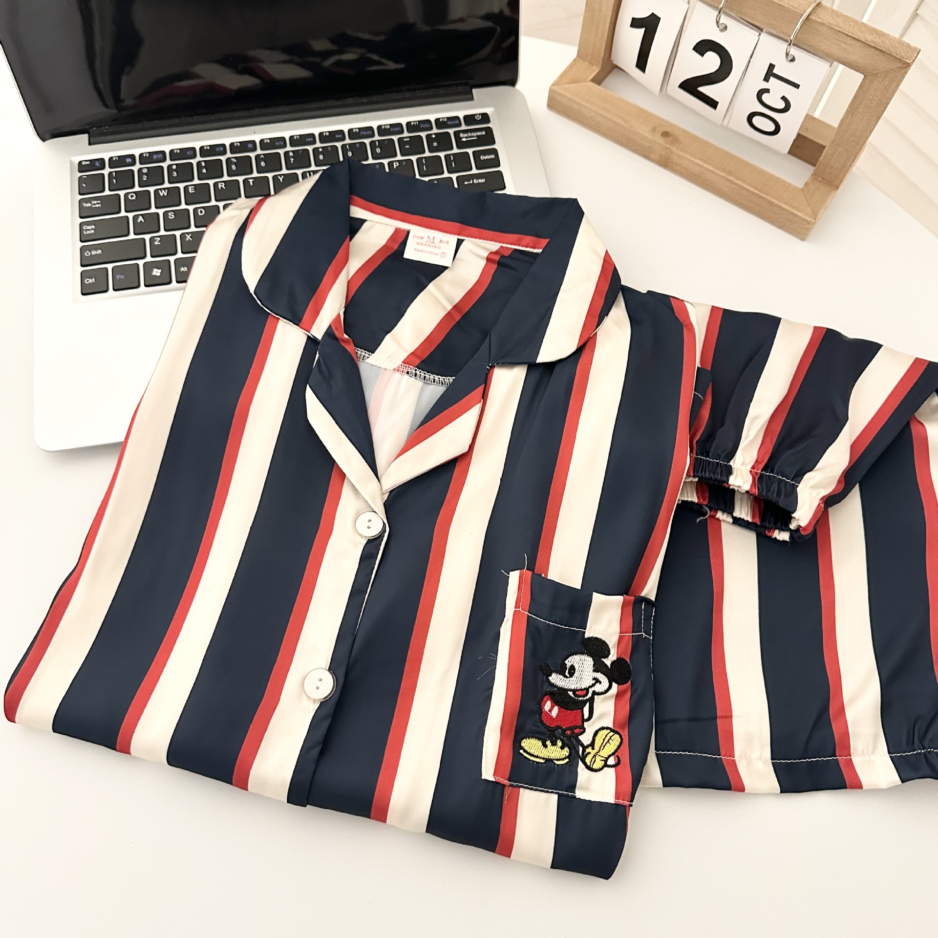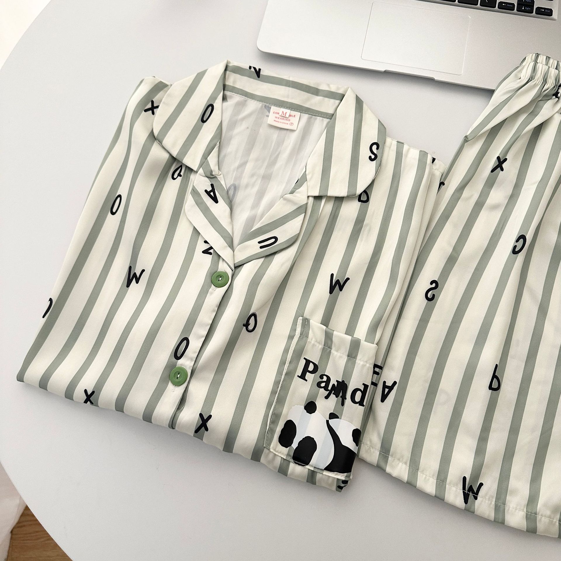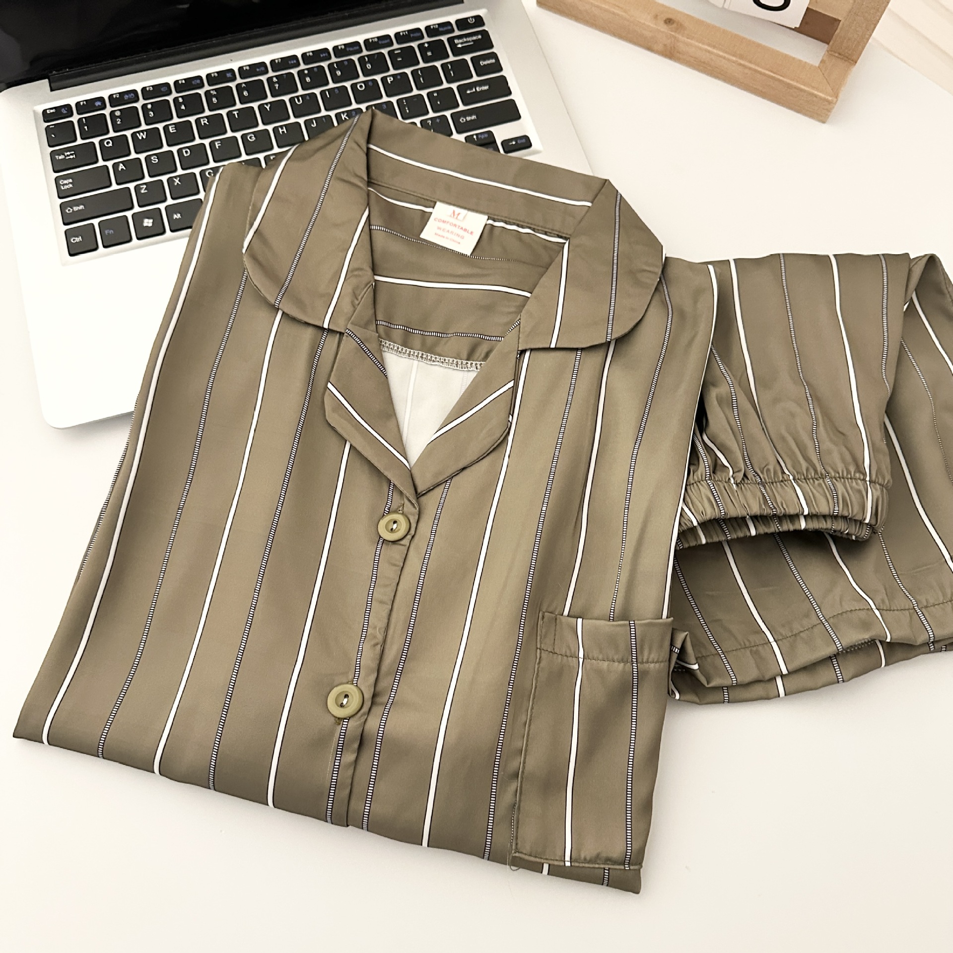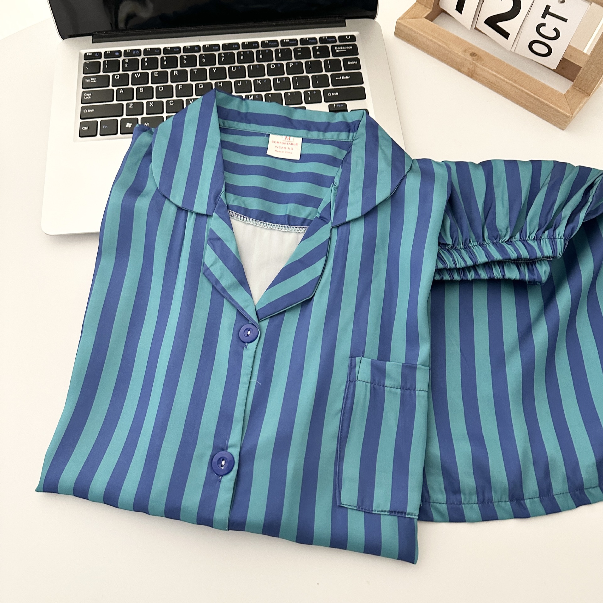 커플 잠옷 여성 여름 반팔 반바지 얼음 실크 시원한 느낌 심플 스트라이프 라펠 남성 홈웨어 투피스 세트