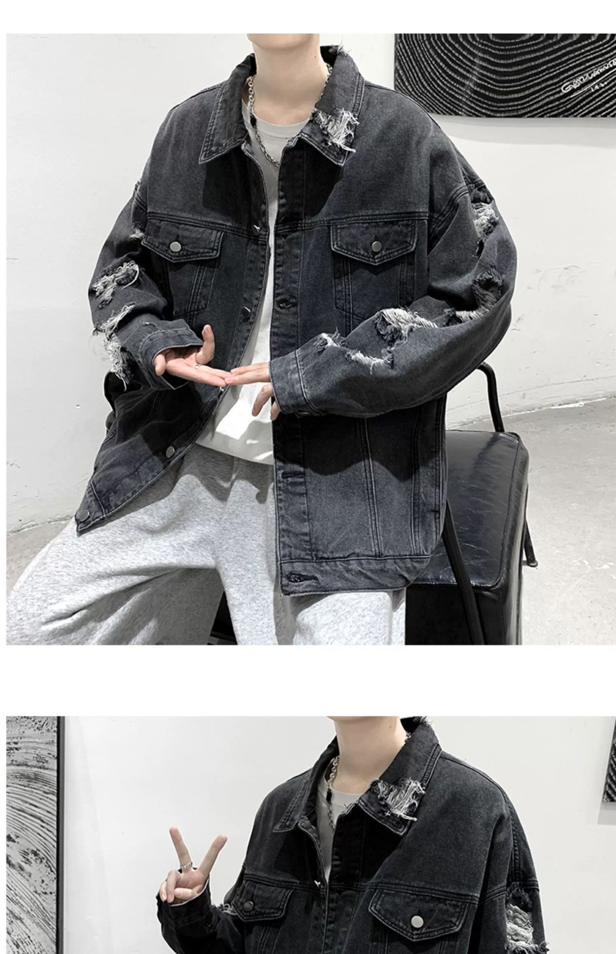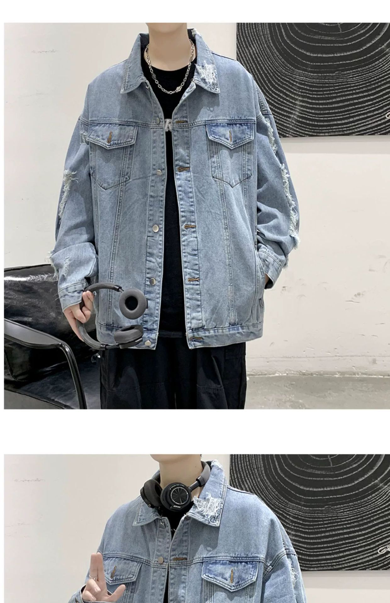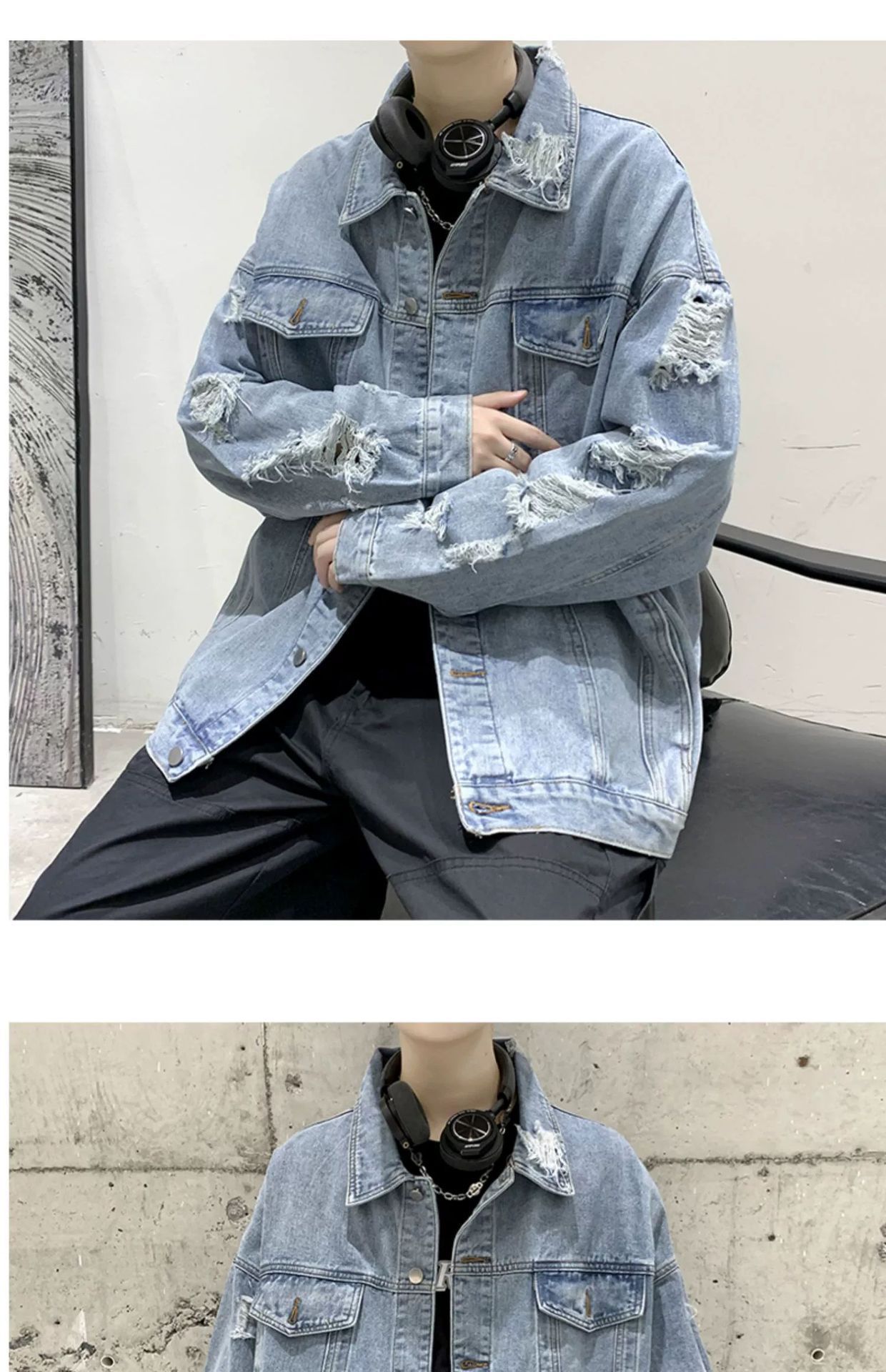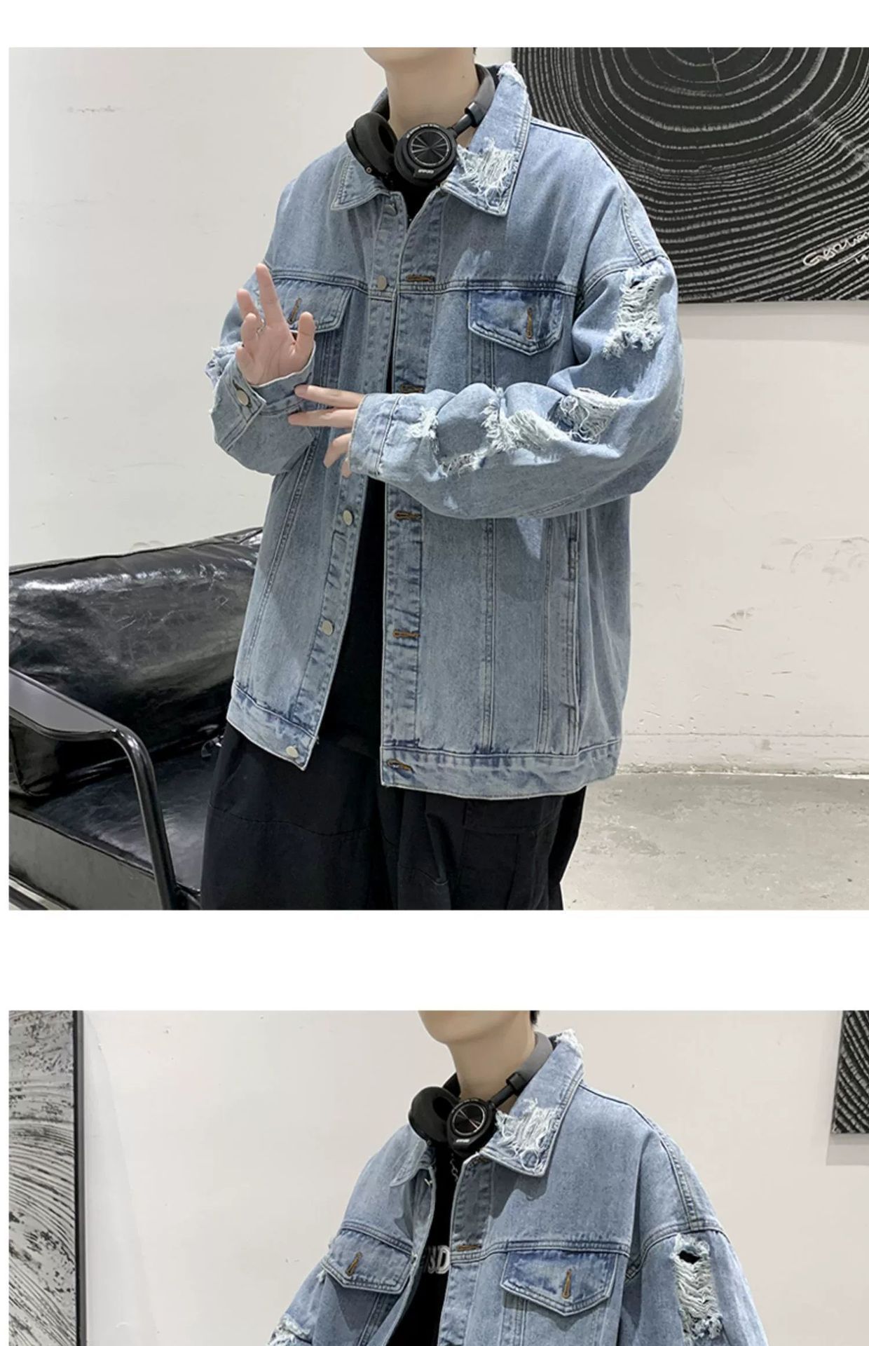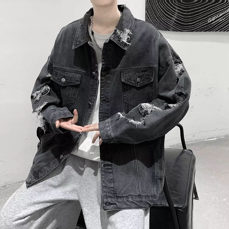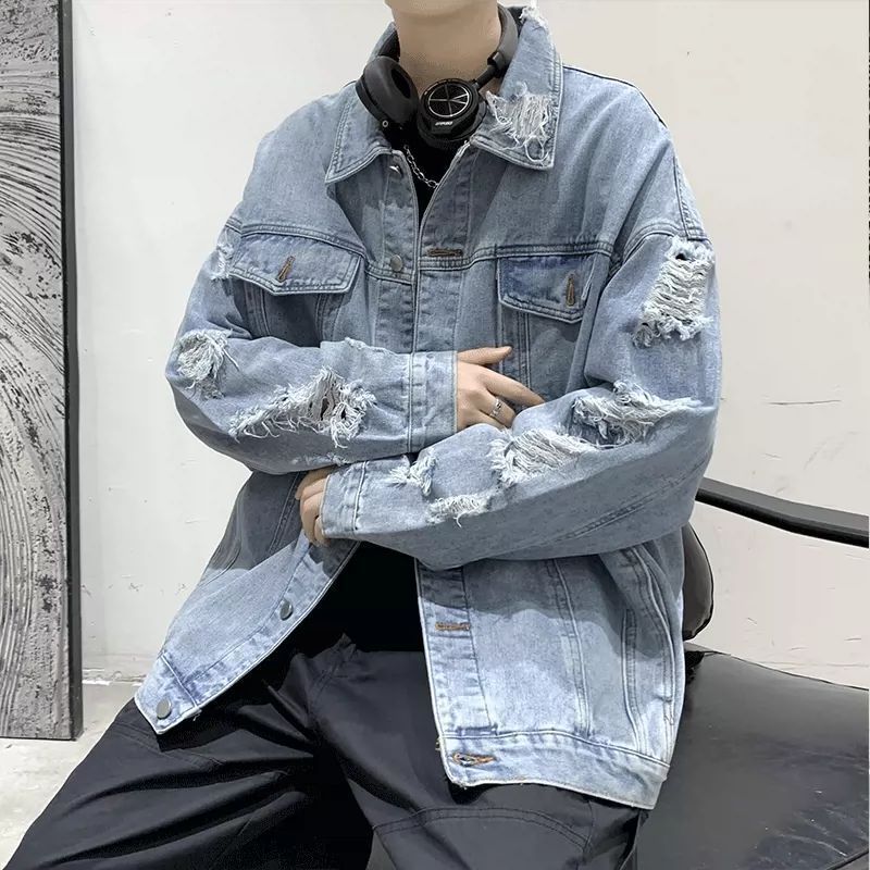 가을 남성용 데님 재킷, 루즈하고 고급스럽고 멋진 유럽과 미국의 하이 스트리트 힙합 하이 스트리트 봄, 가을 찢어진 재킷스토어 가기
