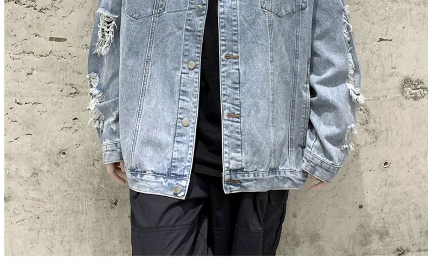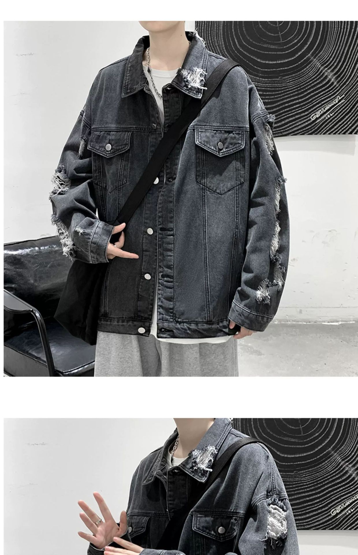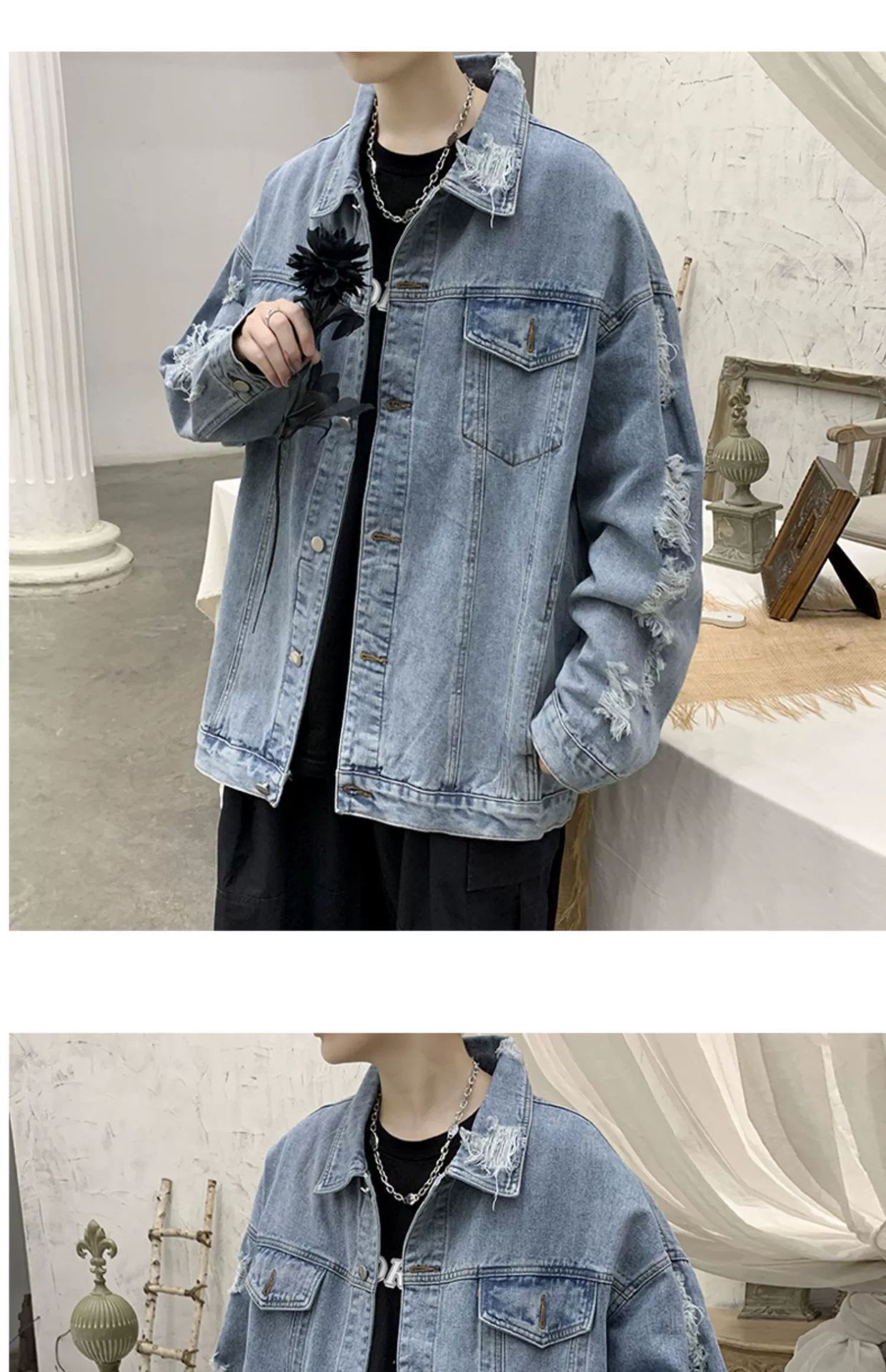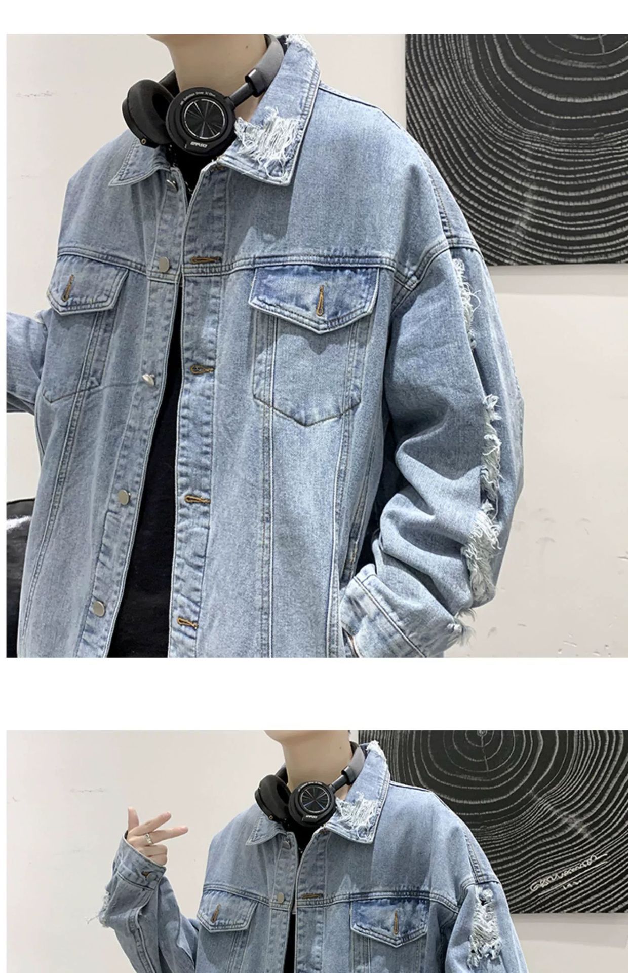 가을 남성용 데님 재킷, 루즈하고 고급스럽고 멋진 유럽과 미국의 하이 스트리트 힙합 하이 스트리트 봄, 가을 찢어진 재킷스토어 가기
