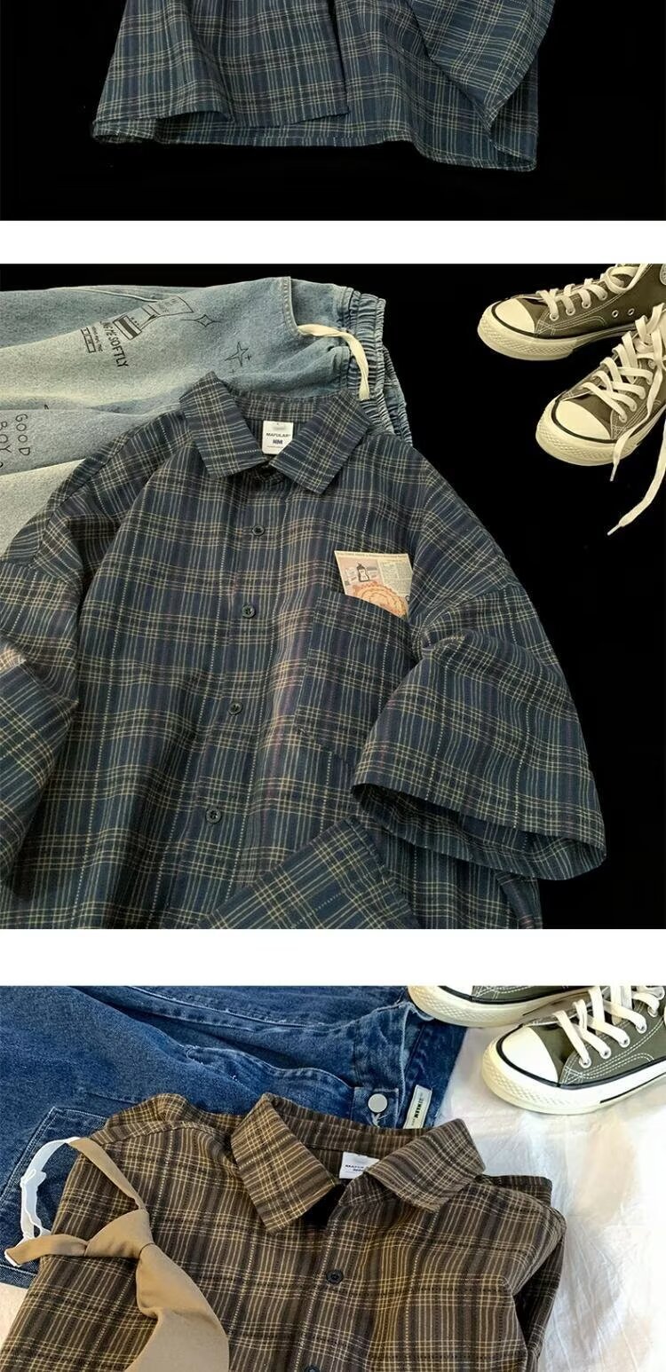격자 무늬 반팔 셔츠 남성 여름 멋진 인치 코트 디자인 트렌디 브랜드 일본 cityboy 트렌디 셔츠스토어 가기