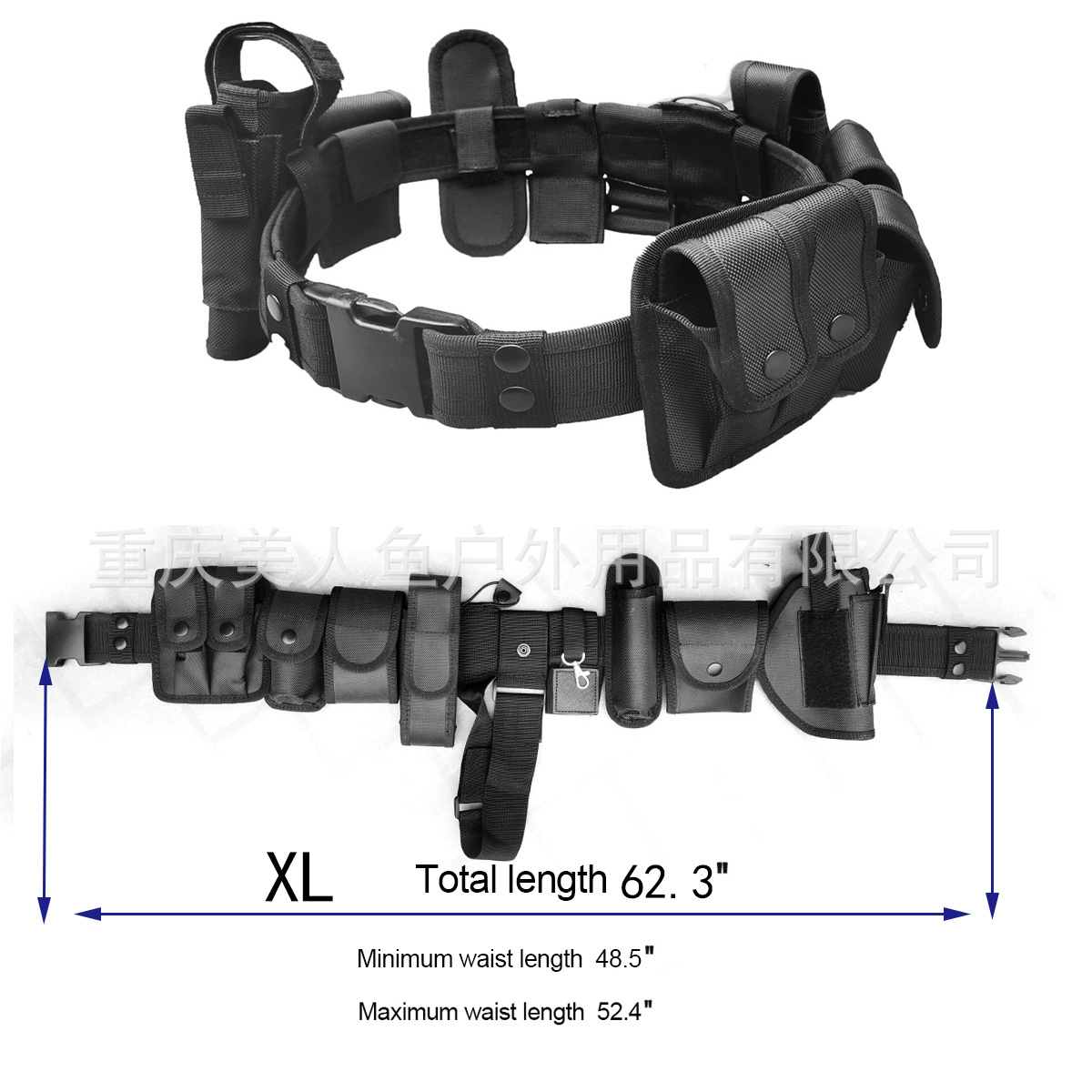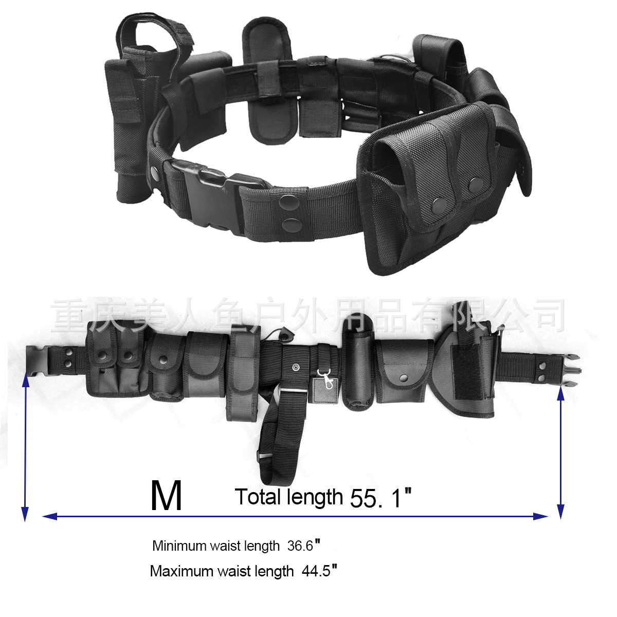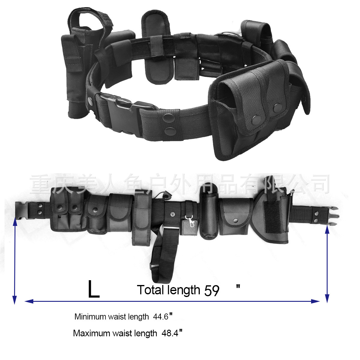 • 特点:1. 10合1(主腰带+喷雾包+手镯包+双联弹夹包+手Q包+相机包+T棍带+手电包+绳索包+钥匙扣);2. 腰带可以根据自己的腰围调节; 3. 适用保安执勤、巡逻、作训