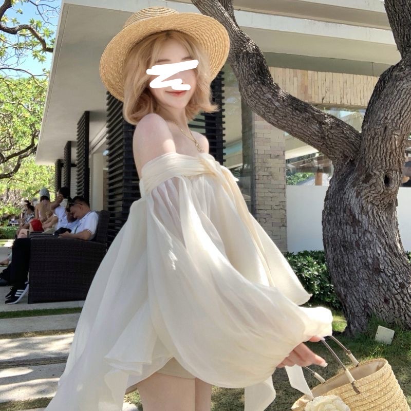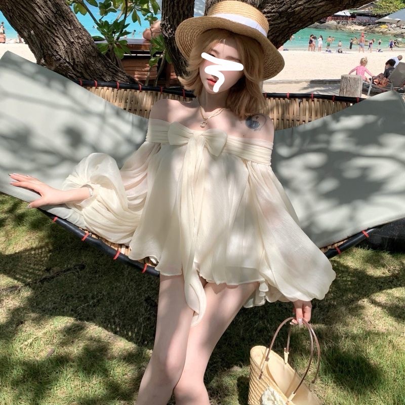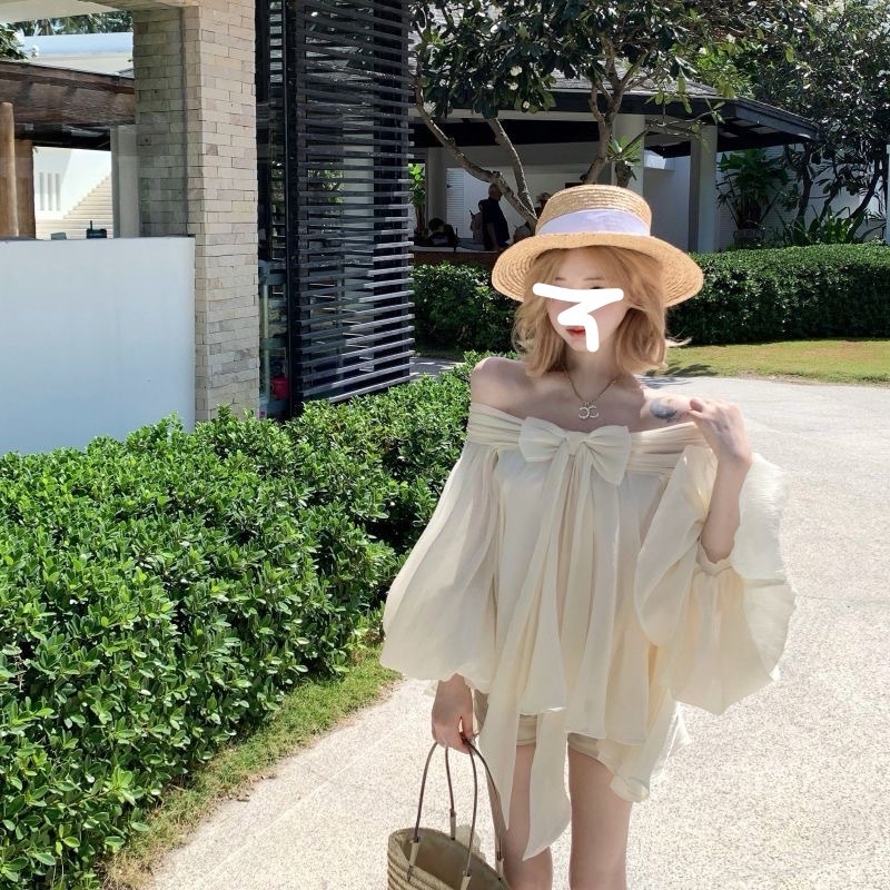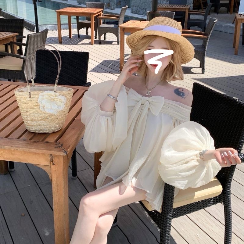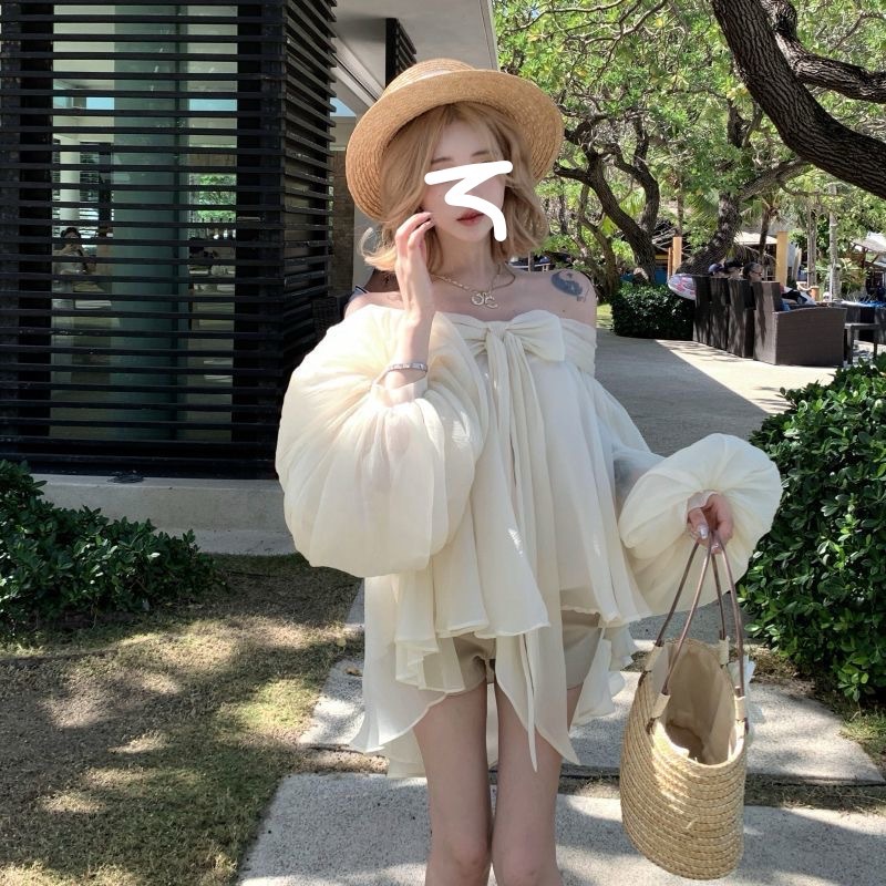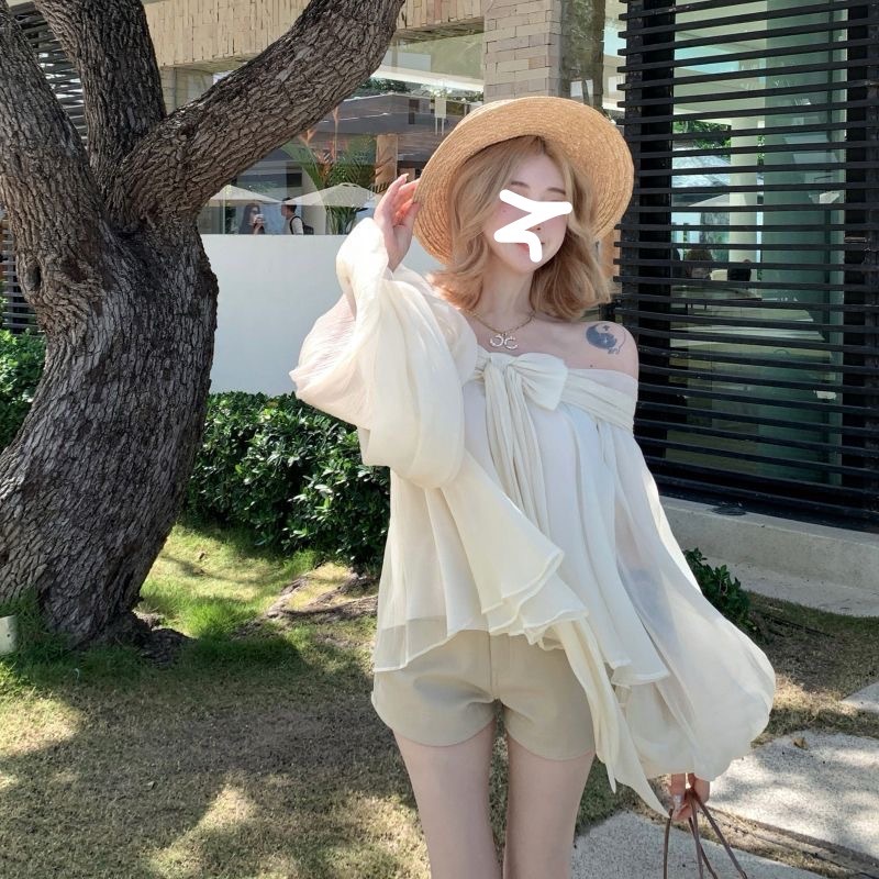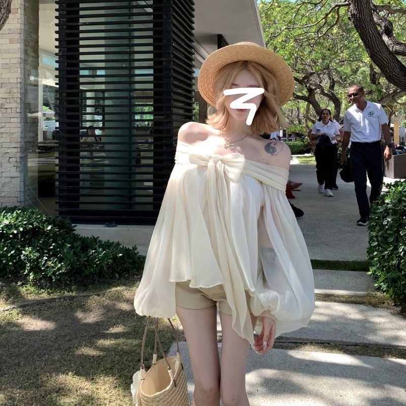 2025 새로운 여름 스타일 느슨한 패션 불규칙한 탑 원 숄더 기질 보우 퍼프 슬리브 쉬폰 셔츠 여성용스토어 가기