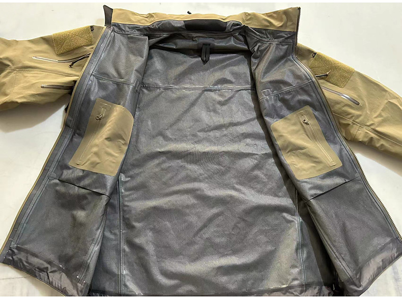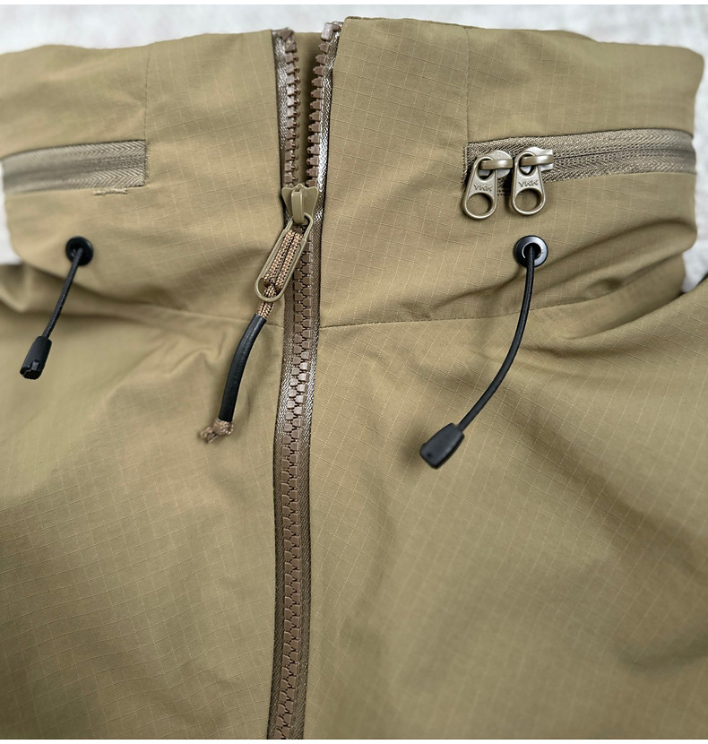 【简介】防水拉链口袋、内缝全溢胶压胶、腋下透气窗、连帽大帽檐、帽子可以隐藏到领子里。
