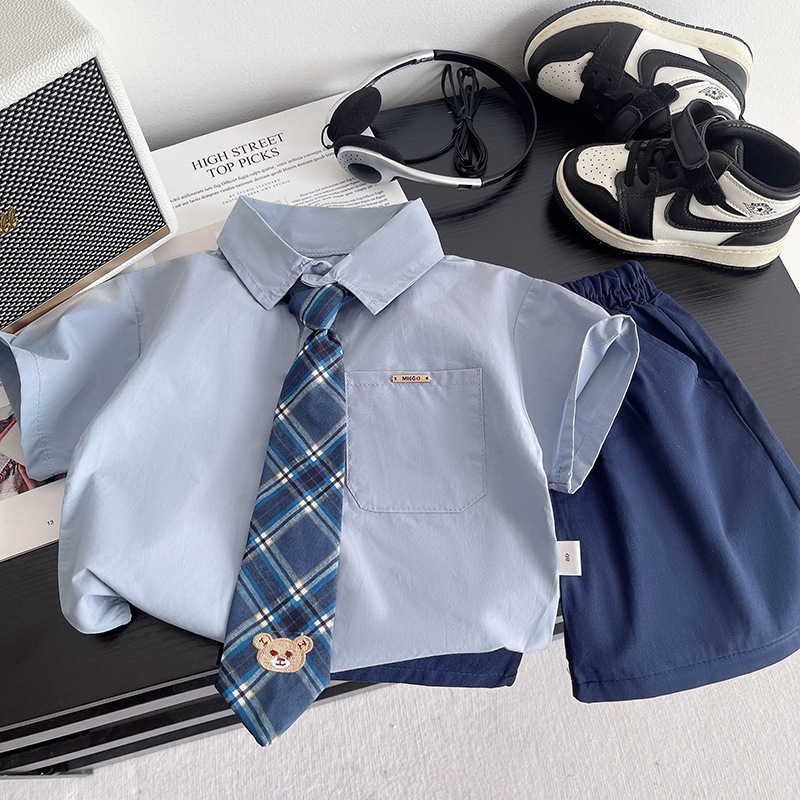 아동 여름 정장 드레스 여름 2025 대학 정장 새로운 반팔 셔츠 소년 투피스 세트 잘 생기고 유행스토어 가기