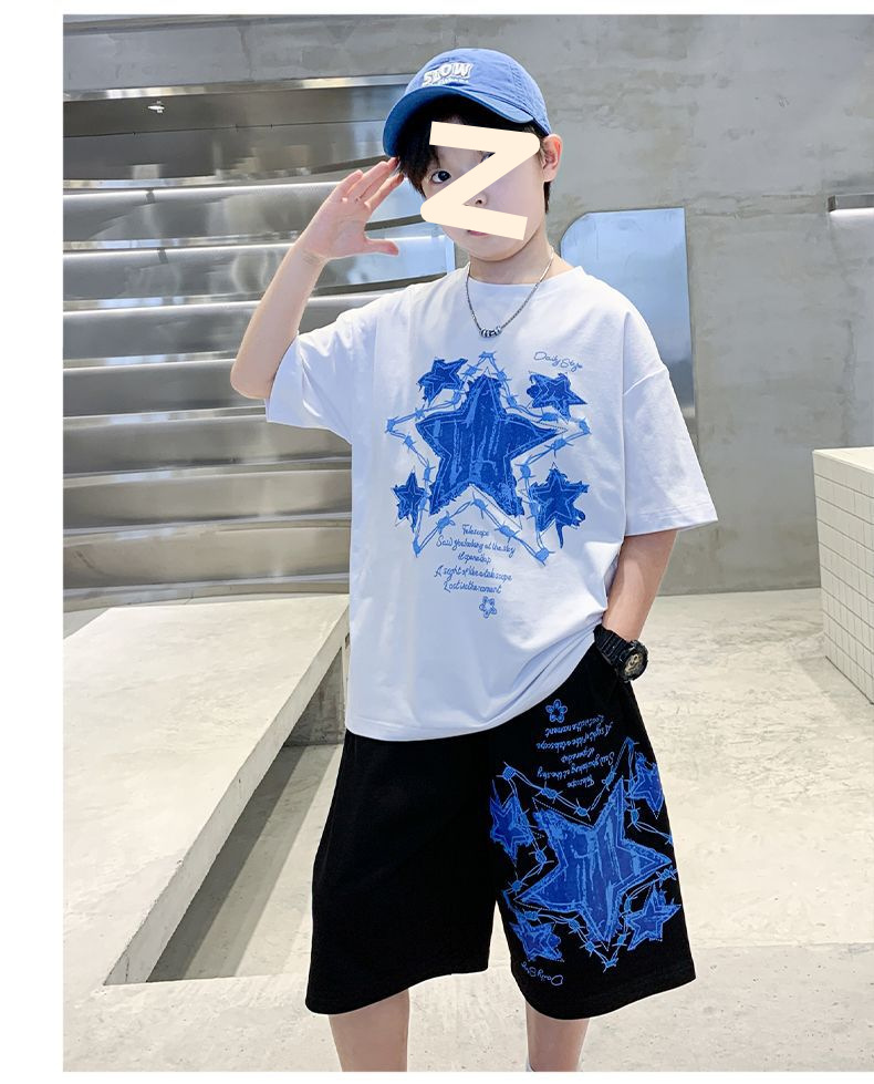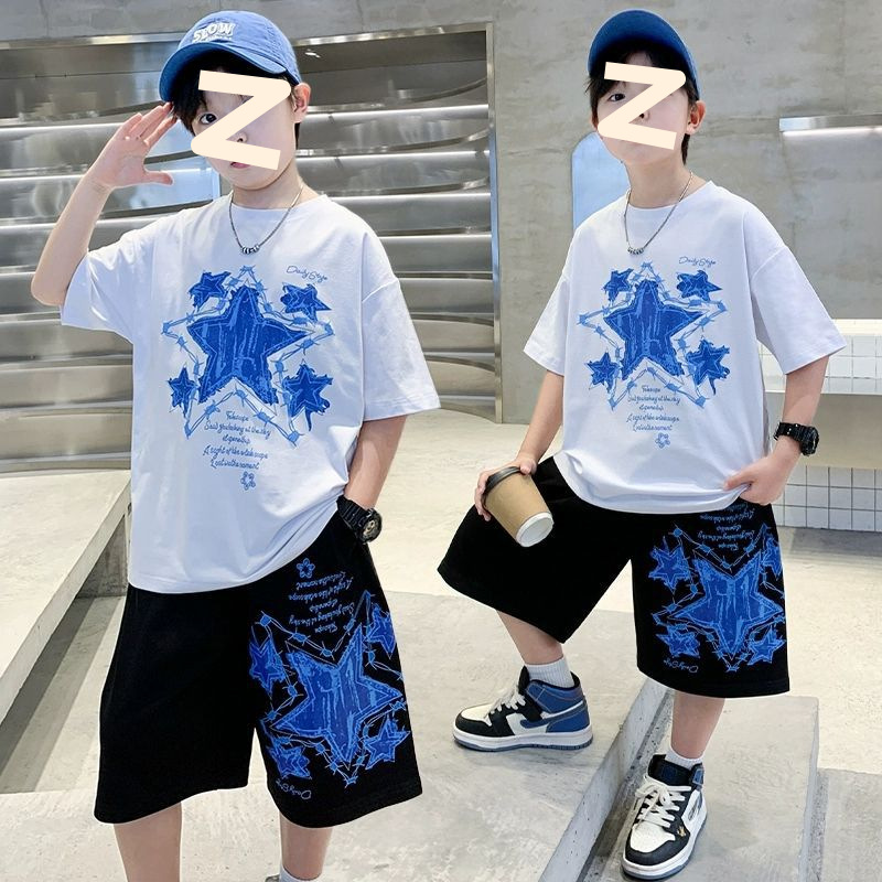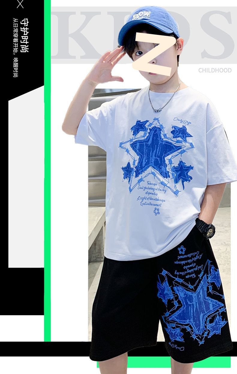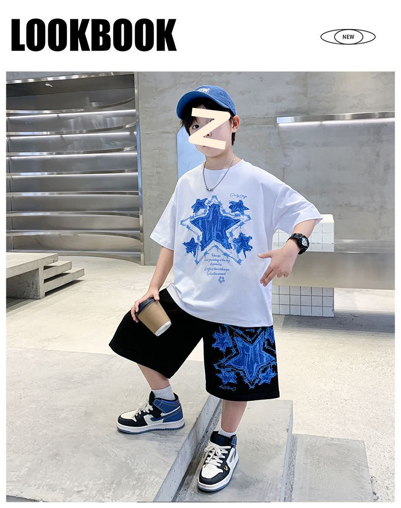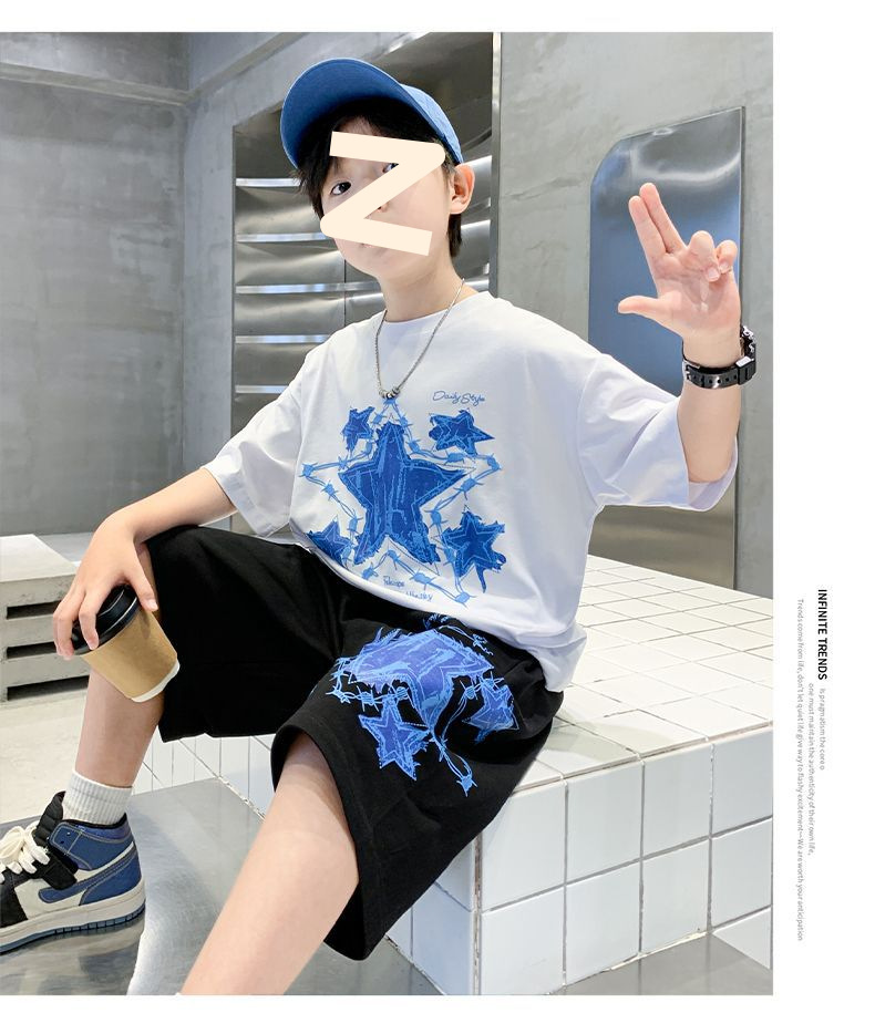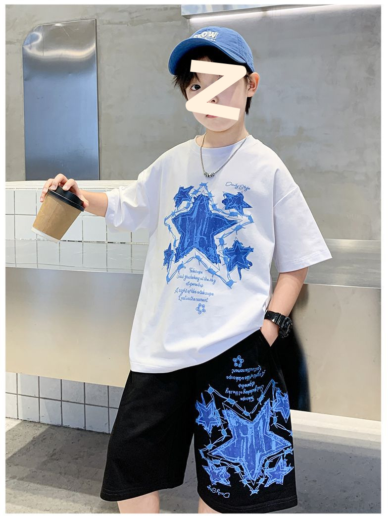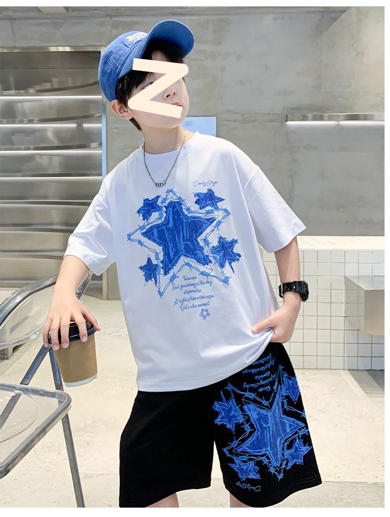 소년 여름 만화 프린트 티셔츠 5부 바지 투피스 세트 2025 새로운 스타일 중대형 어린이 잘 생긴 소년 정장 유행스토어 가기