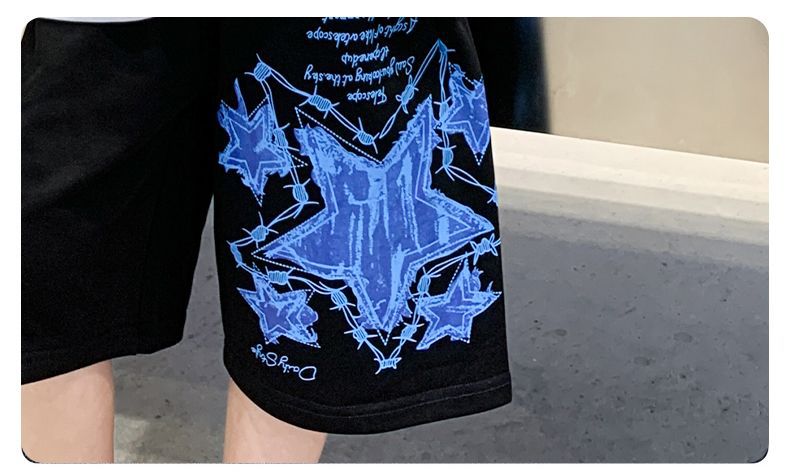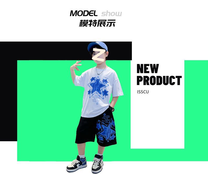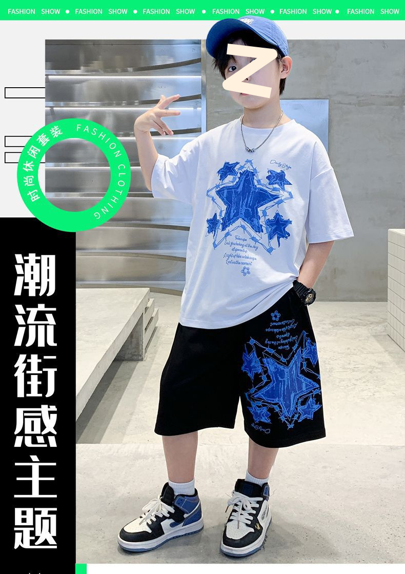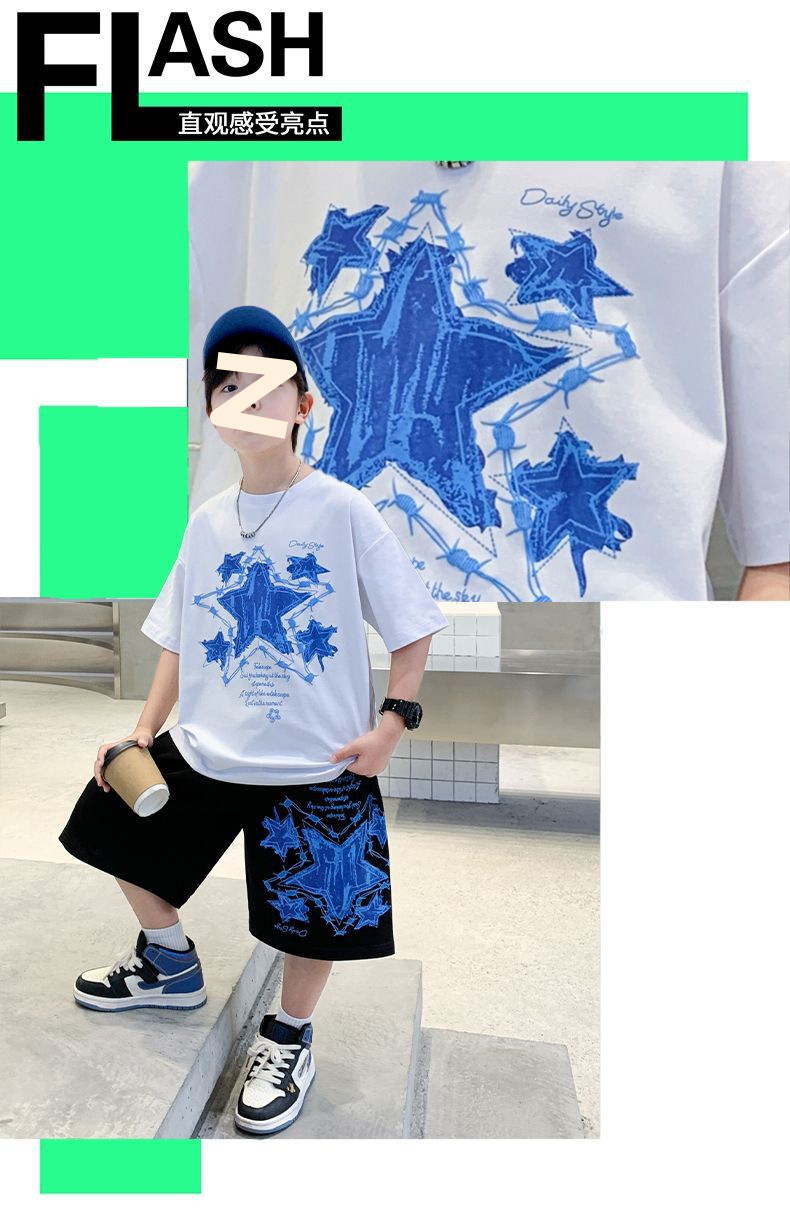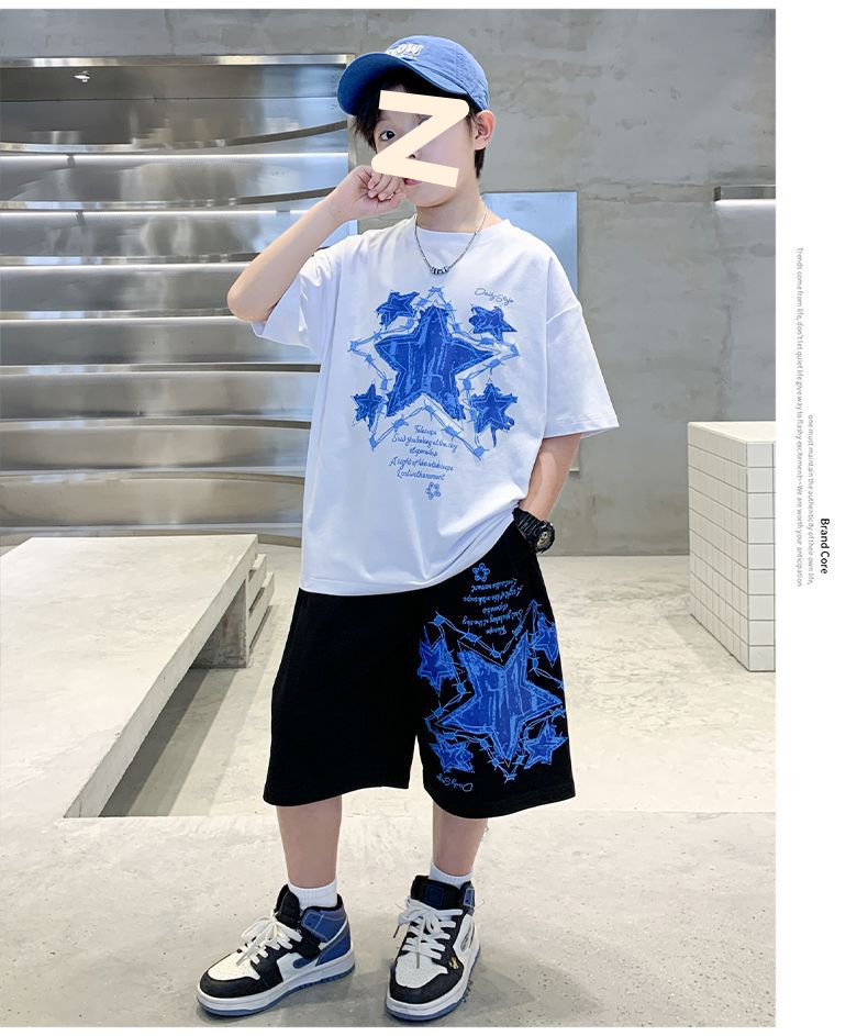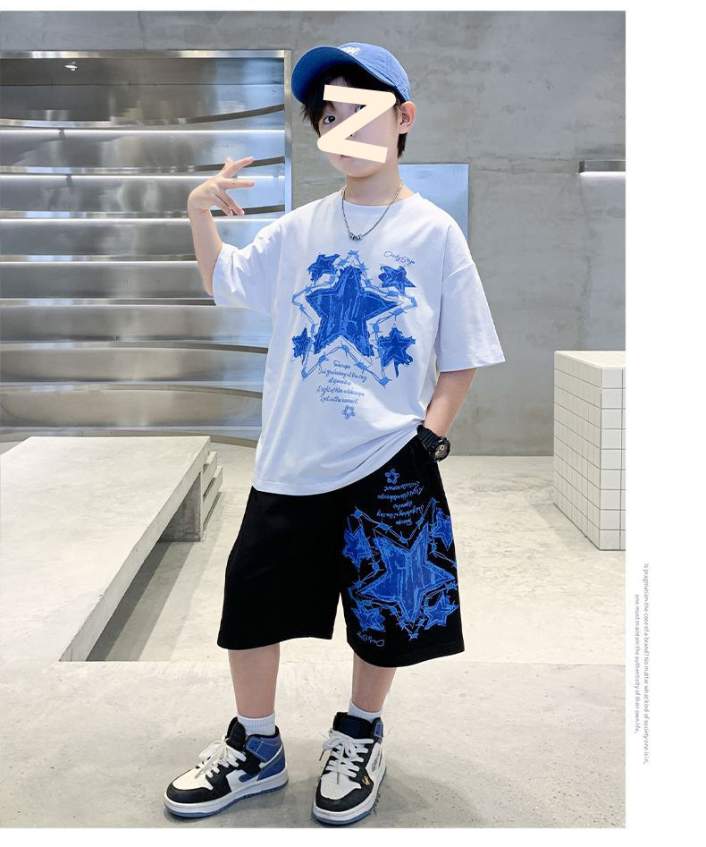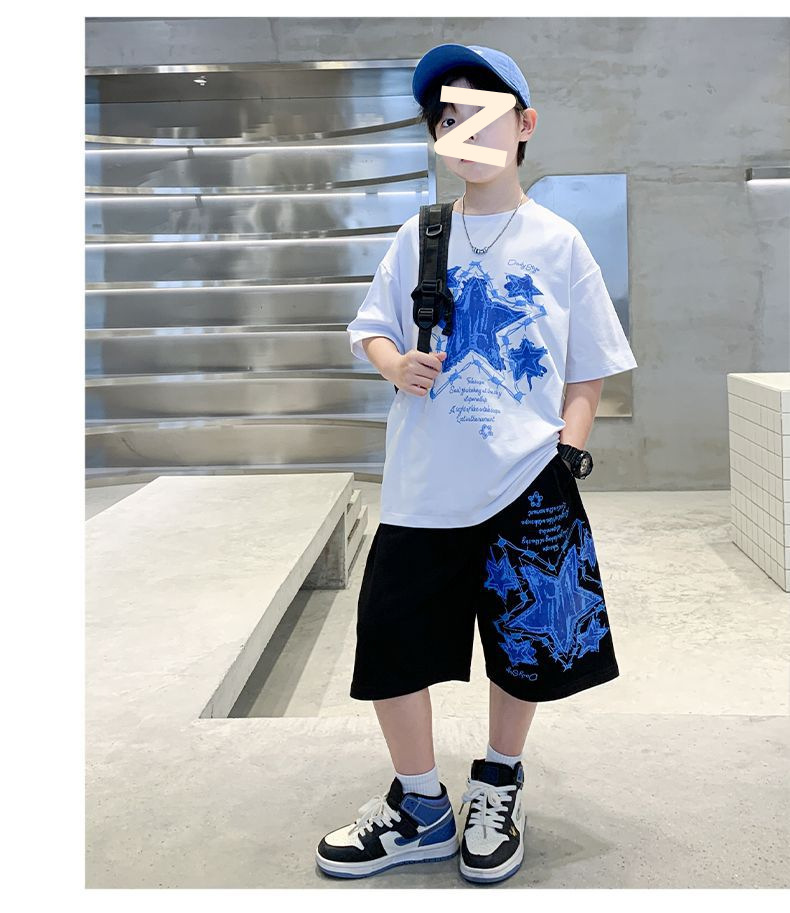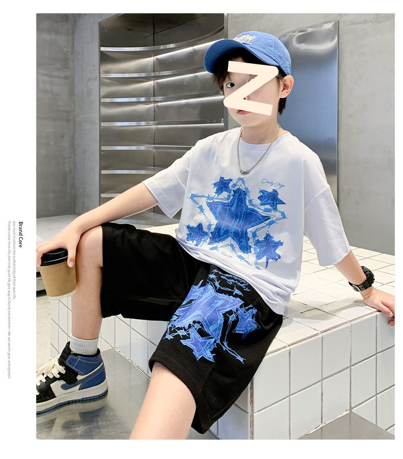 소년 여름 만화 프린트 티셔츠 5부 바지 투피스 세트 2025 새로운 스타일 중대형 어린이 잘 생긴 소년 정장 유행스토어 가기