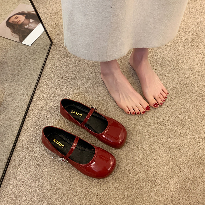 여성을위한 라운드 토 프렌치 레드 플랫 메리 제인 슈즈 2025 새로운 봄, 가을 스커트와 어울리는 작은 향기 스타일 펌프스 슈즈