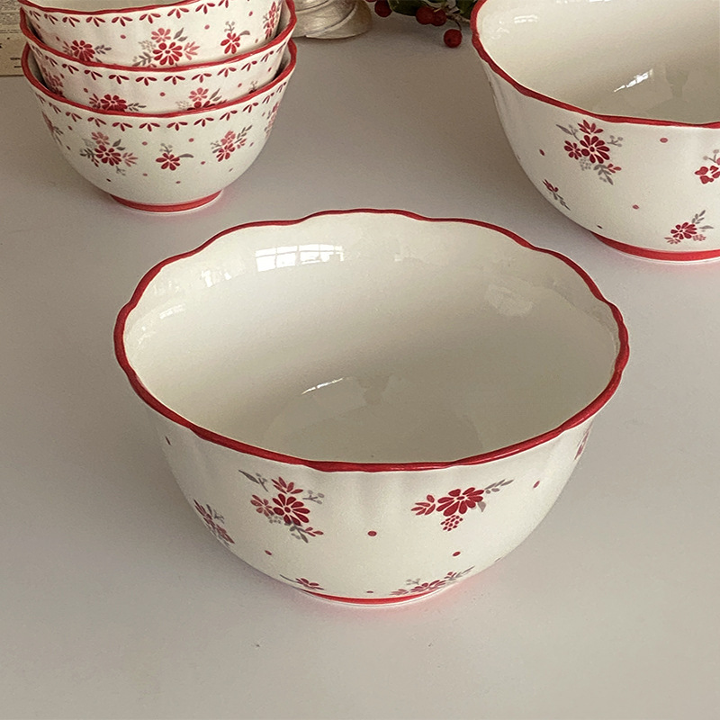 ins 한국 복고풍 붉은 꽃무늬 언더글레이즈 컬러 레이스 세라믹 그릇 새해 크리스마스 분위기 식사 그릇 밥