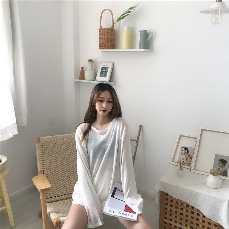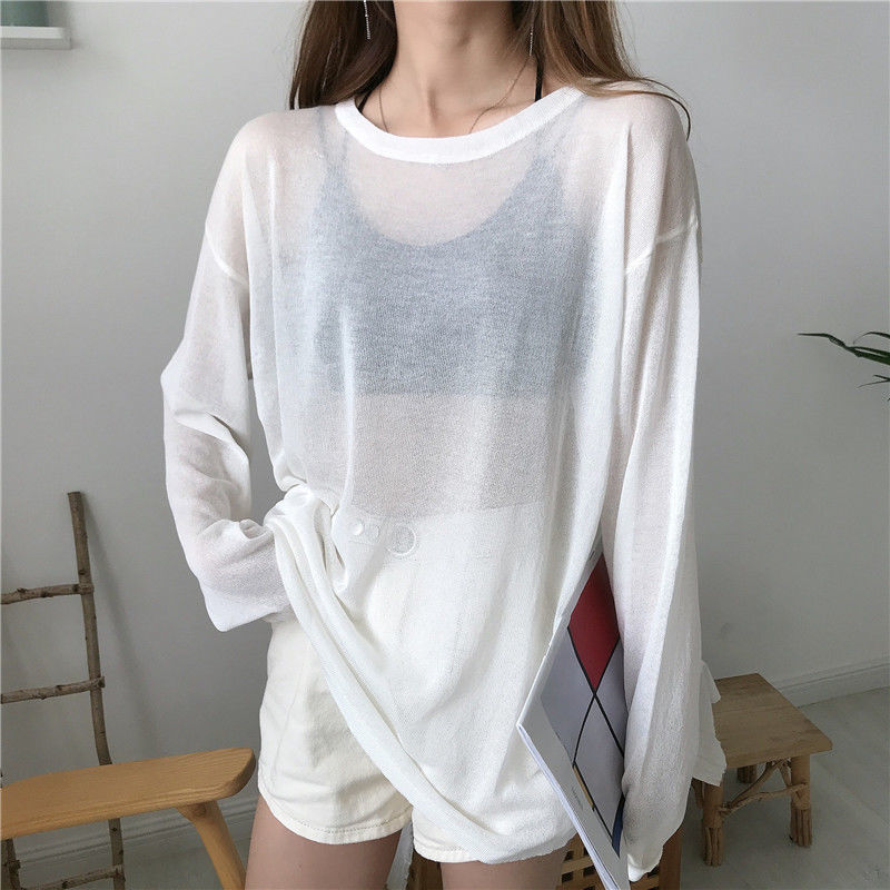 인터넷 연예인 얇은 자외선 차단 아이스 실크 긴팔 티셔츠 여성 여름 한국 스타일 루즈 캐주얼 바닥 탑 인 슈퍼 핫 트렌드