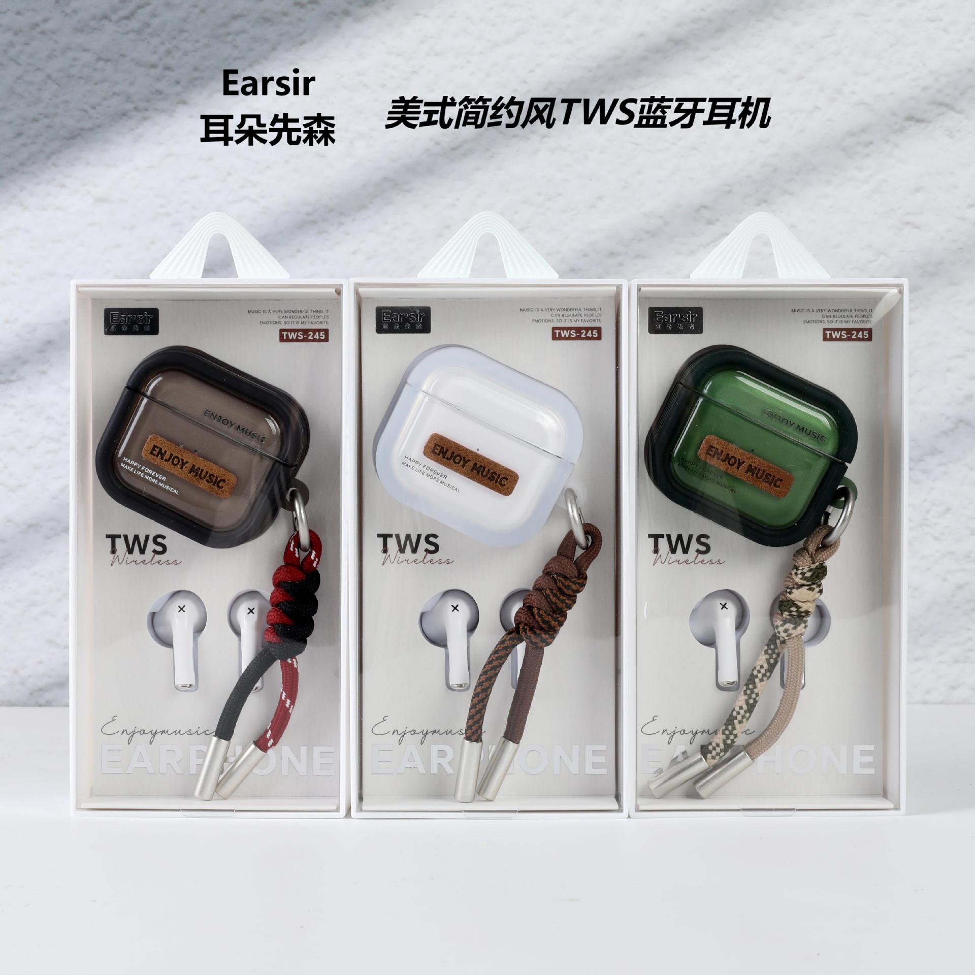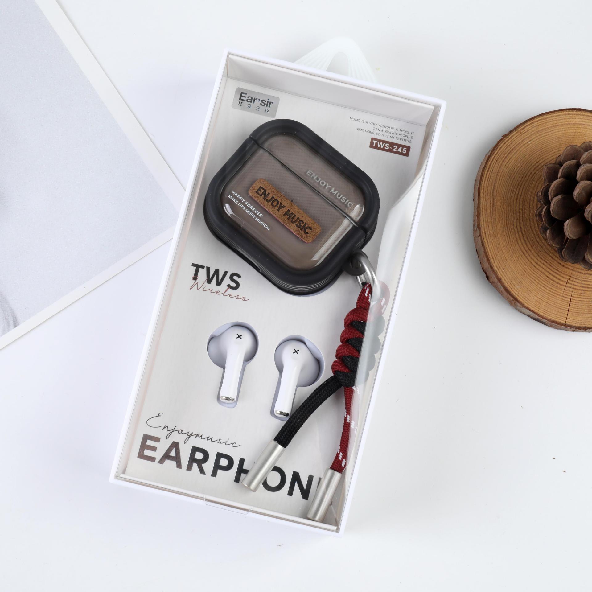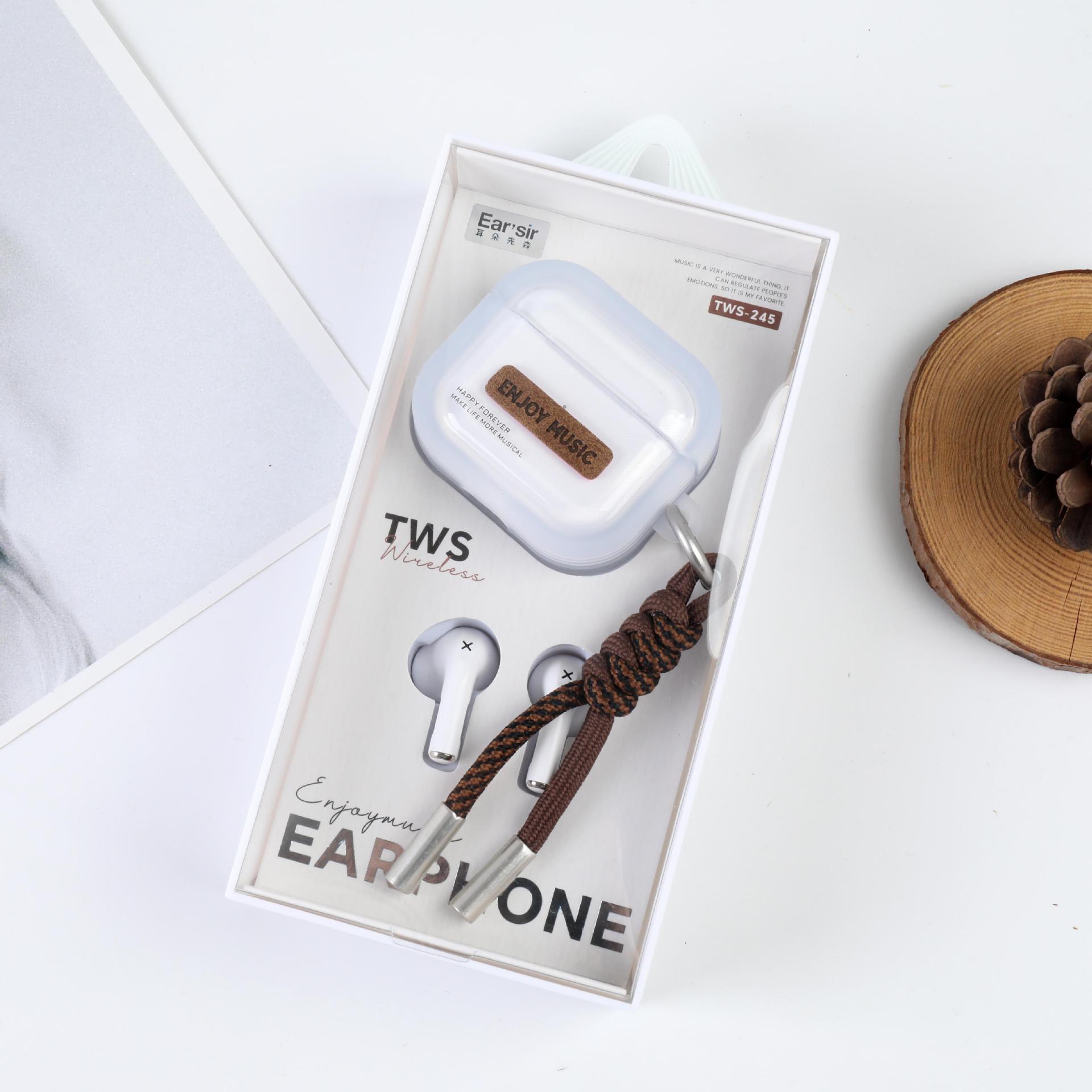 耳朵先森TWS-245简约风英文TWS真无线蓝牙耳机,美式风格创意皮革贴片设计,格纹编制挂绳彰显时尚品味,5.4+EDR版本 高清音质 支持双耳通话 无线束缚 小巧精致 携带方便 耳机根据人体工程学设计 佩戴舒适 贴合耳道时 不易掉落,半入耳式耳机,16小时续命电量 ,可连续听音乐达到4小时以上(比市场一般蓝牙耳机多百分之五十的使用时间)