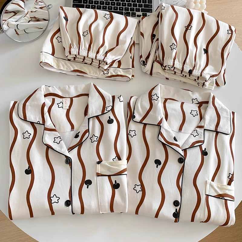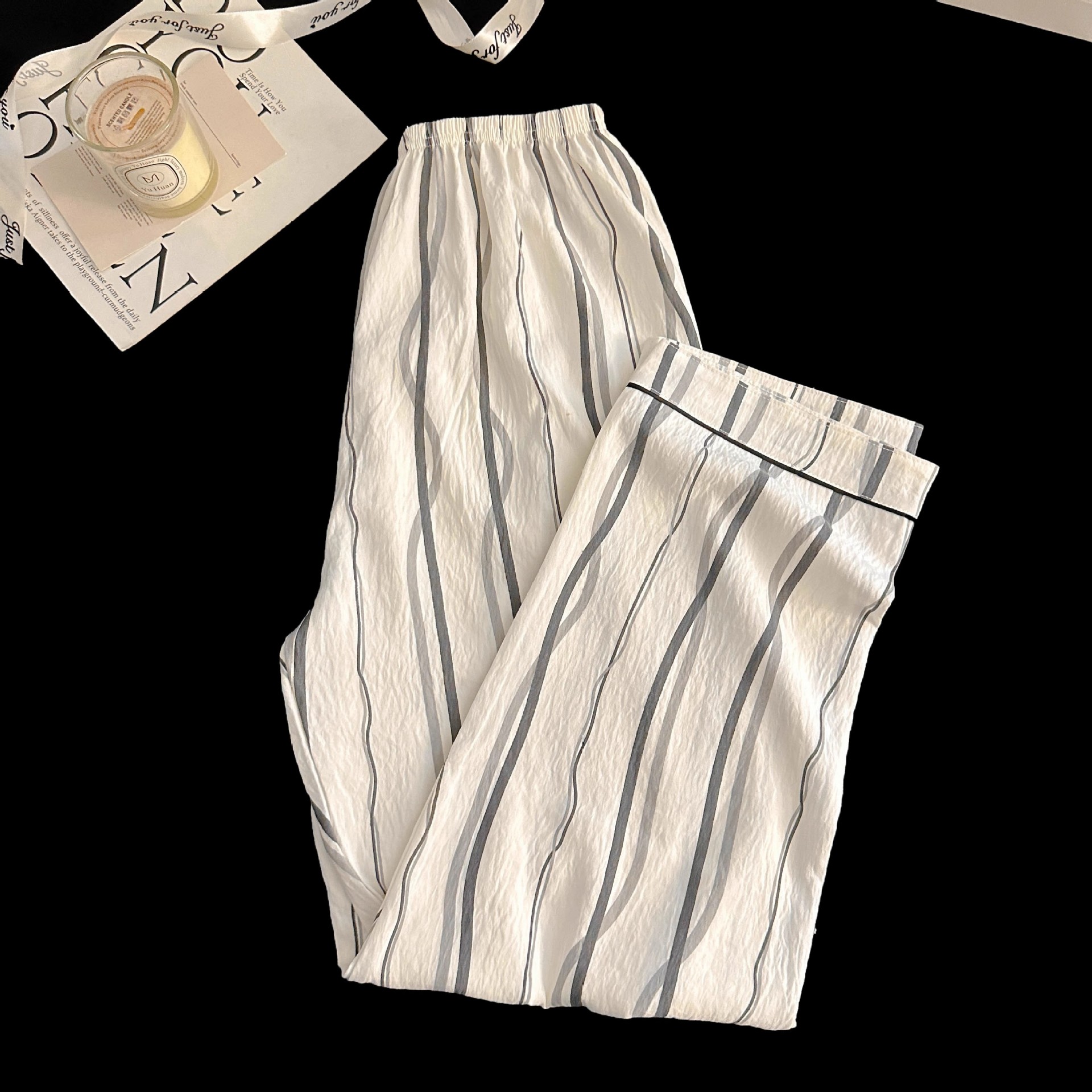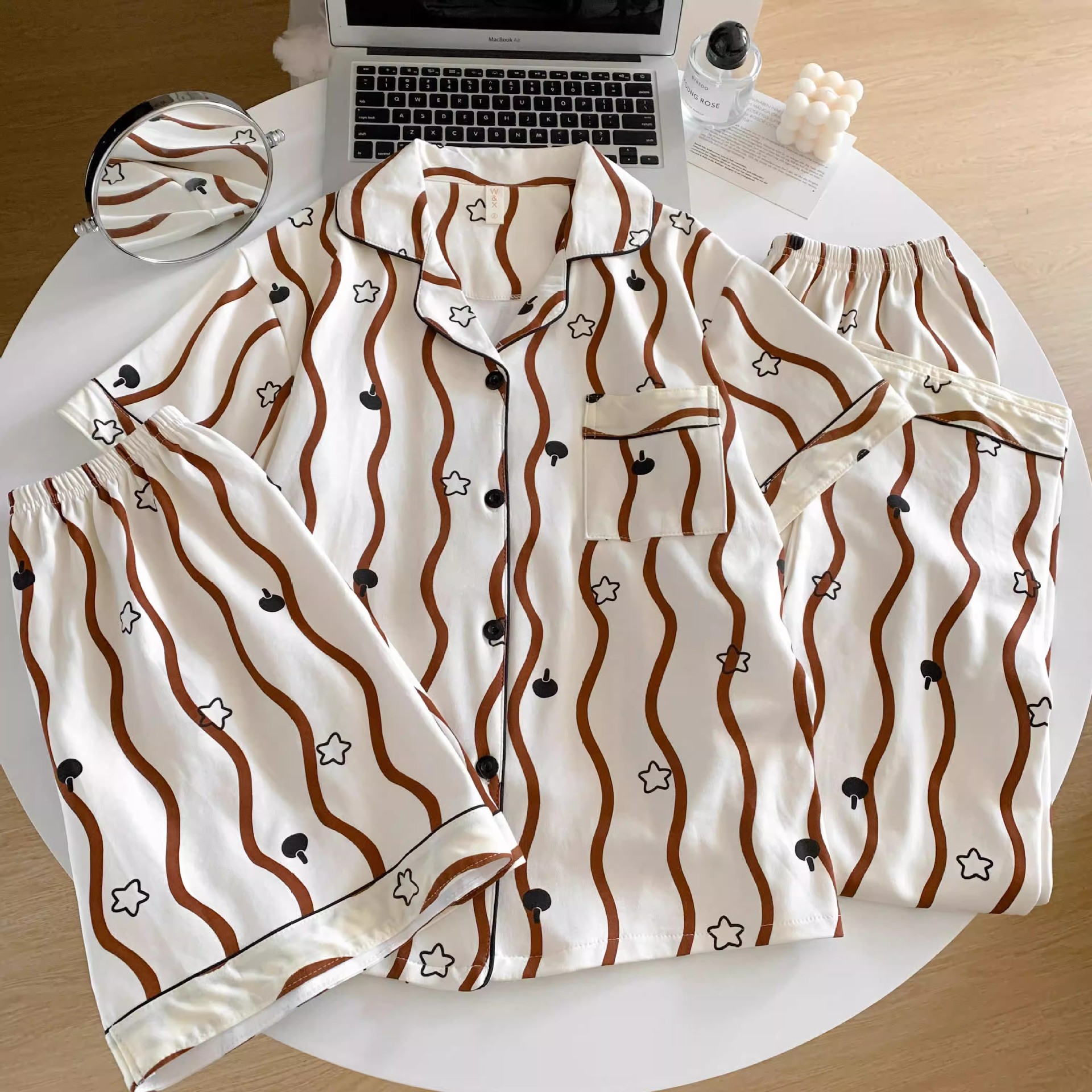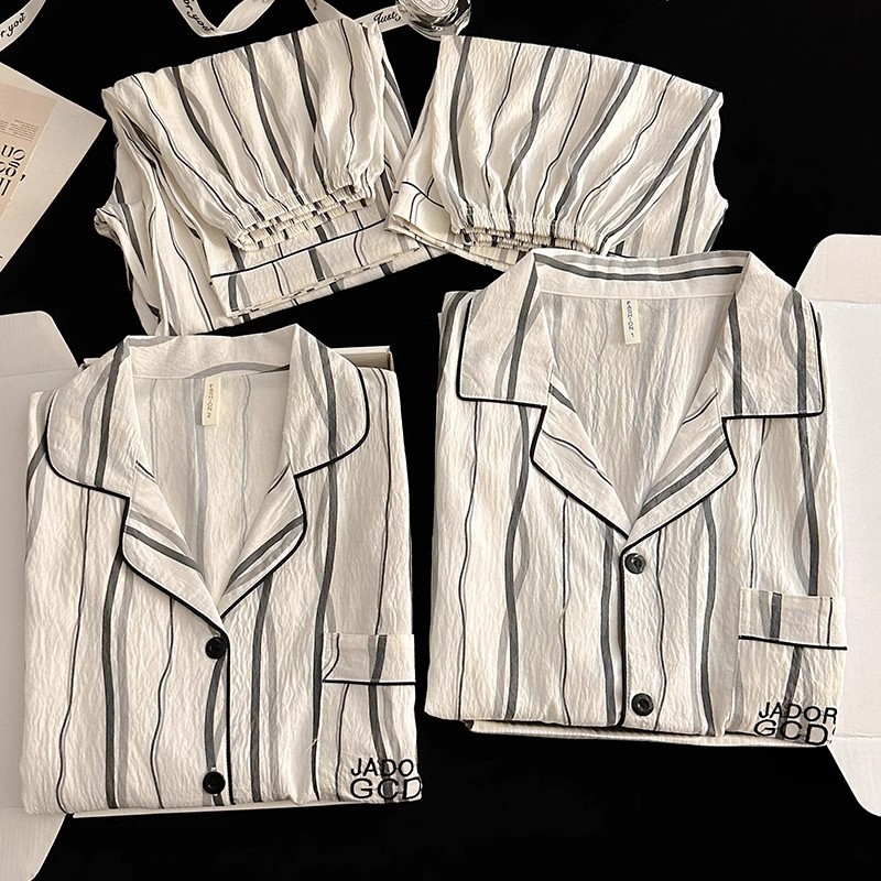 남성과 여성을 위한 커플 화이트 가디건 잠옷 여름 반팔 순면 원사 하이 엔드 스트라이프 3 피스 홈웨어 세트