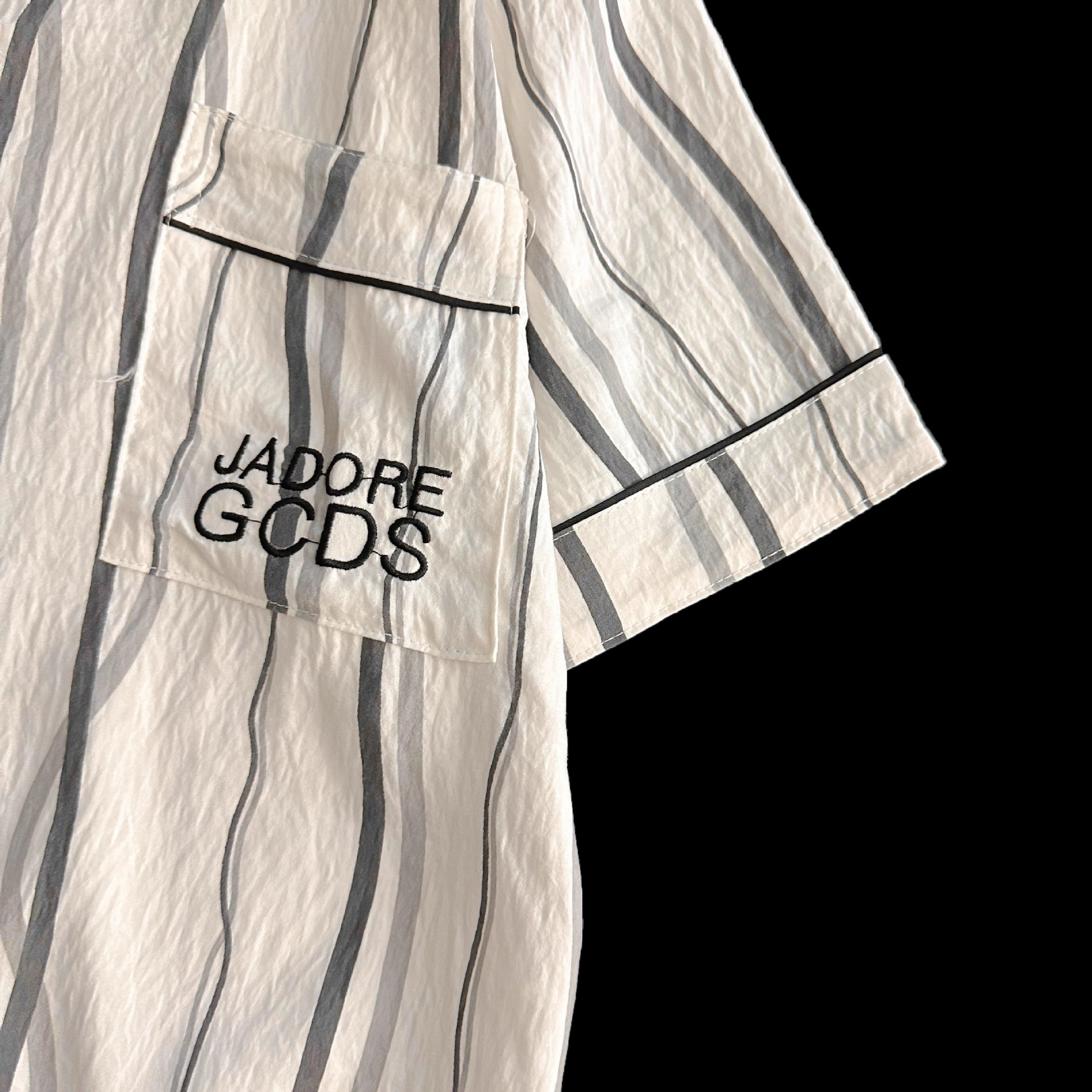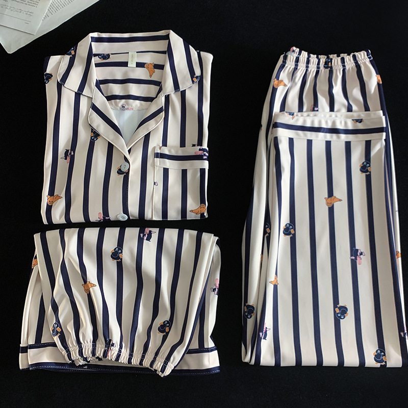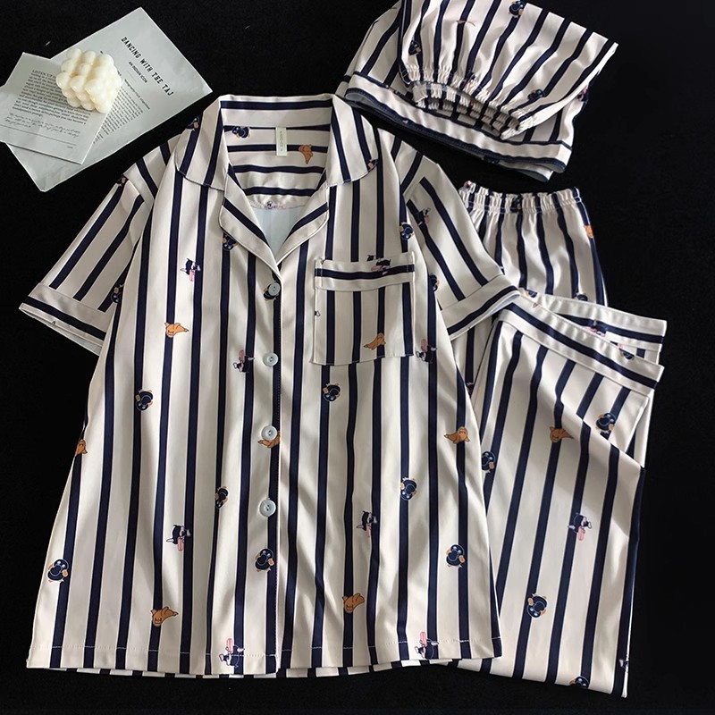 남성과 여성을 위한 커플 화이트 가디건 잠옷 여름 반팔 순면 원사 하이 엔드 스트라이프 3 피스 홈웨어 세트스토어 가기