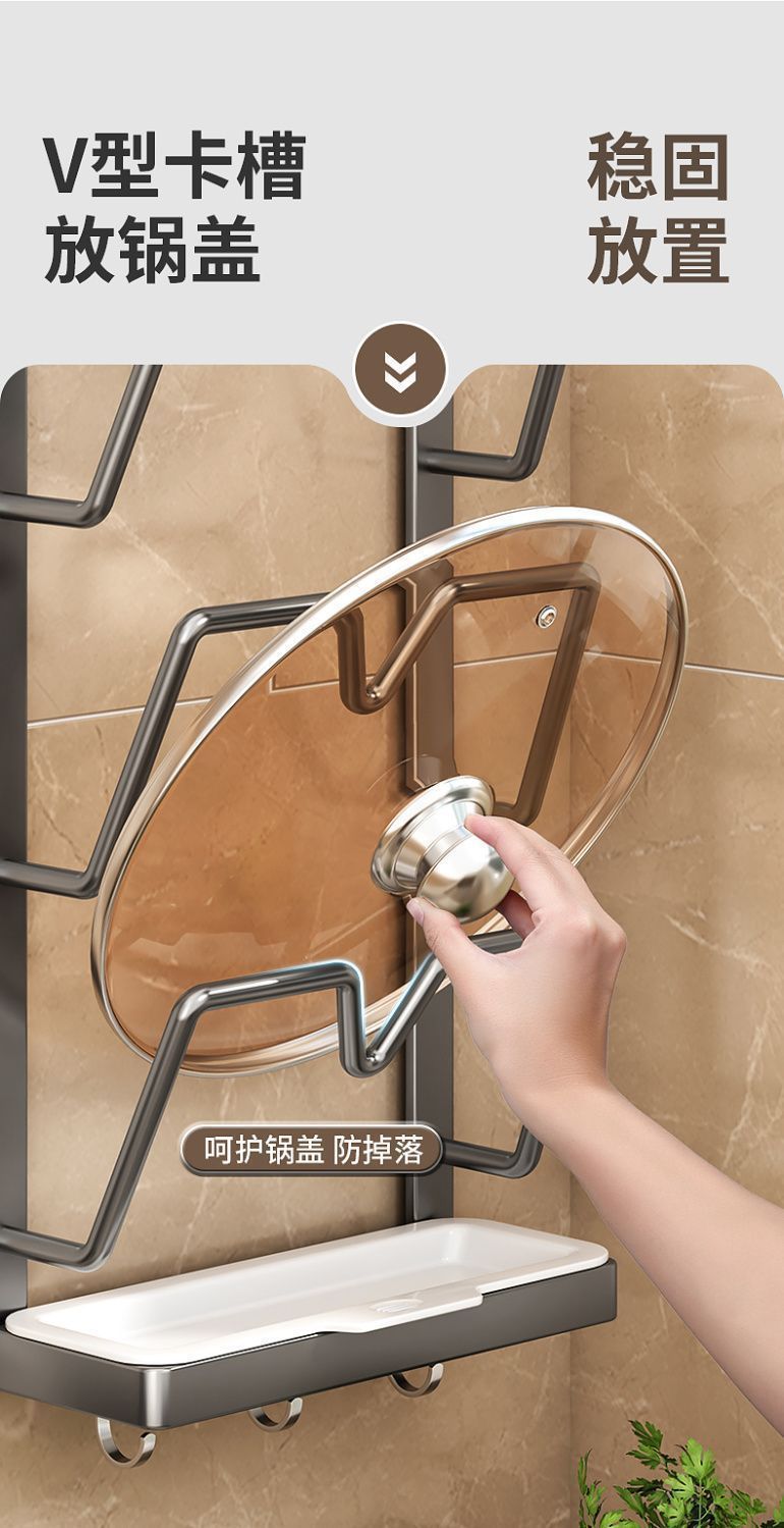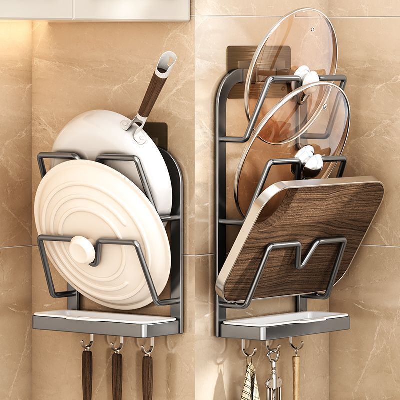 주방 냄비 뚜껑 걸이, 벽걸이형 냄비 뚜껑 걸이, 물받이가 있는 수납 선반, 냄비 뚜껑을 보관할 수 있는 펀치 없는 벽걸이형 브래킷