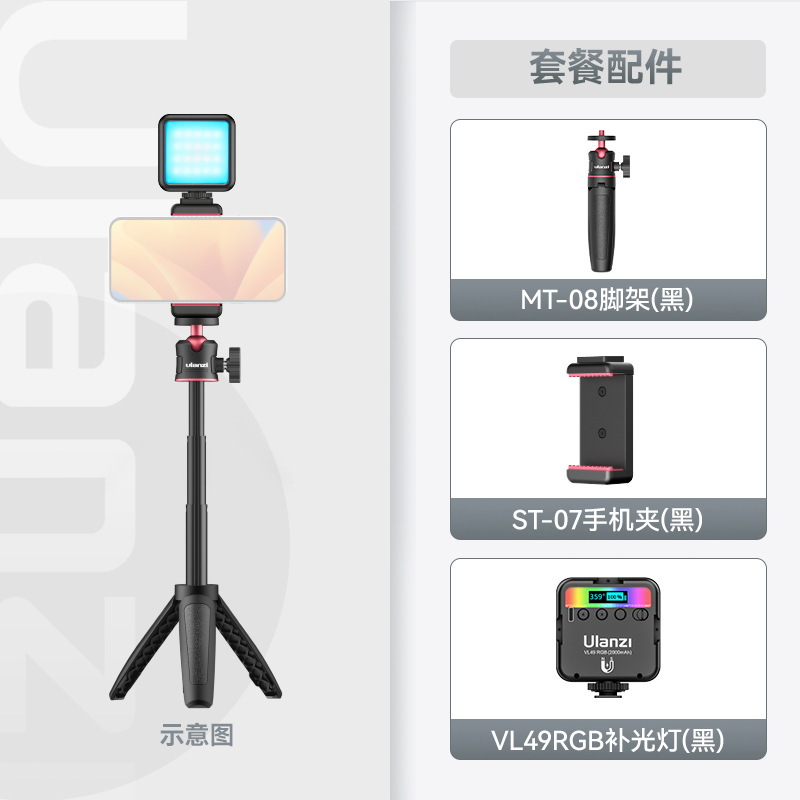 • [휴대폰 셀카 필라이트-블랙] 확장형 삼각대 + 콜드슈 휴대폰 클립 + VL49RGB 필라이트