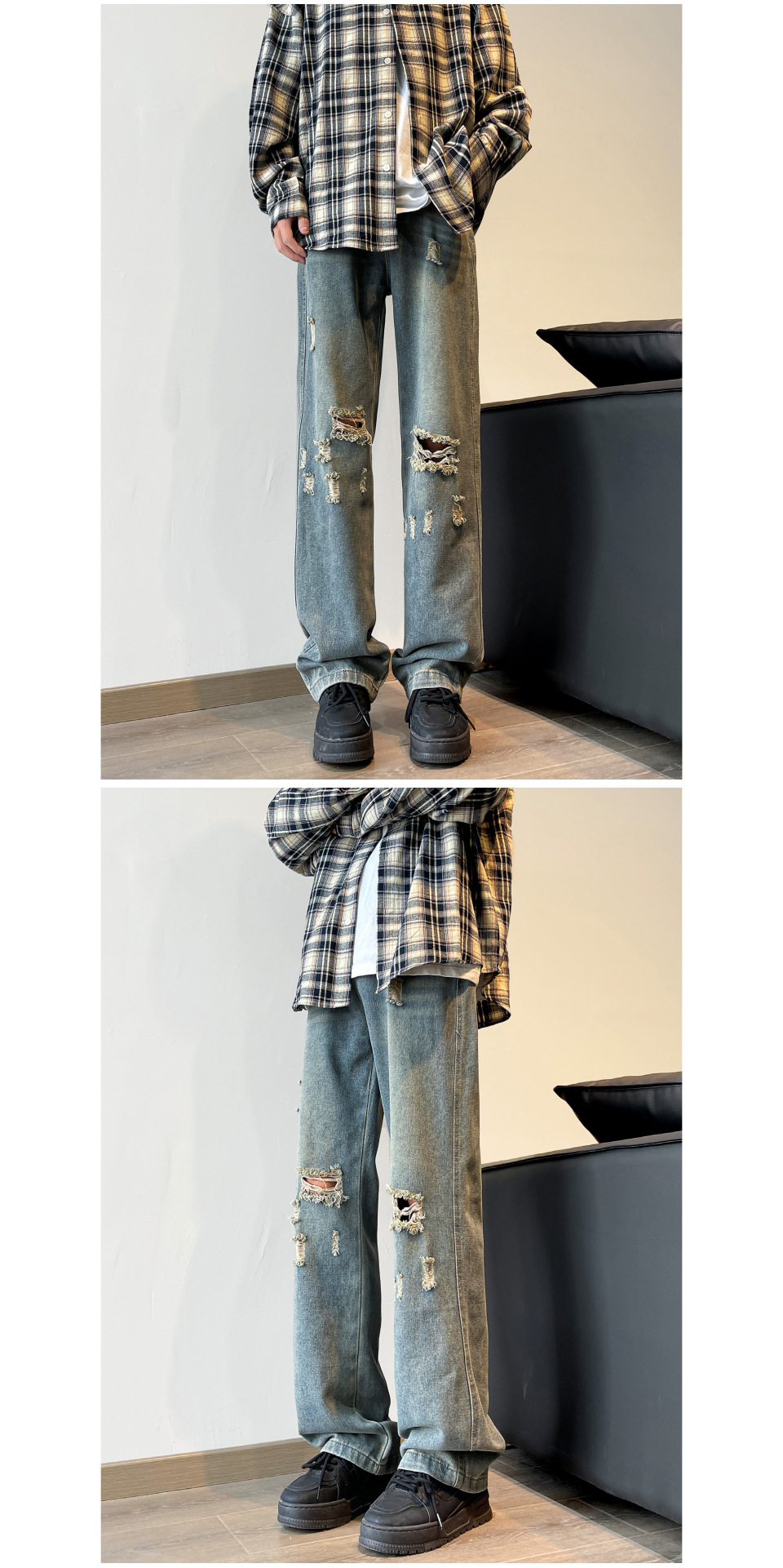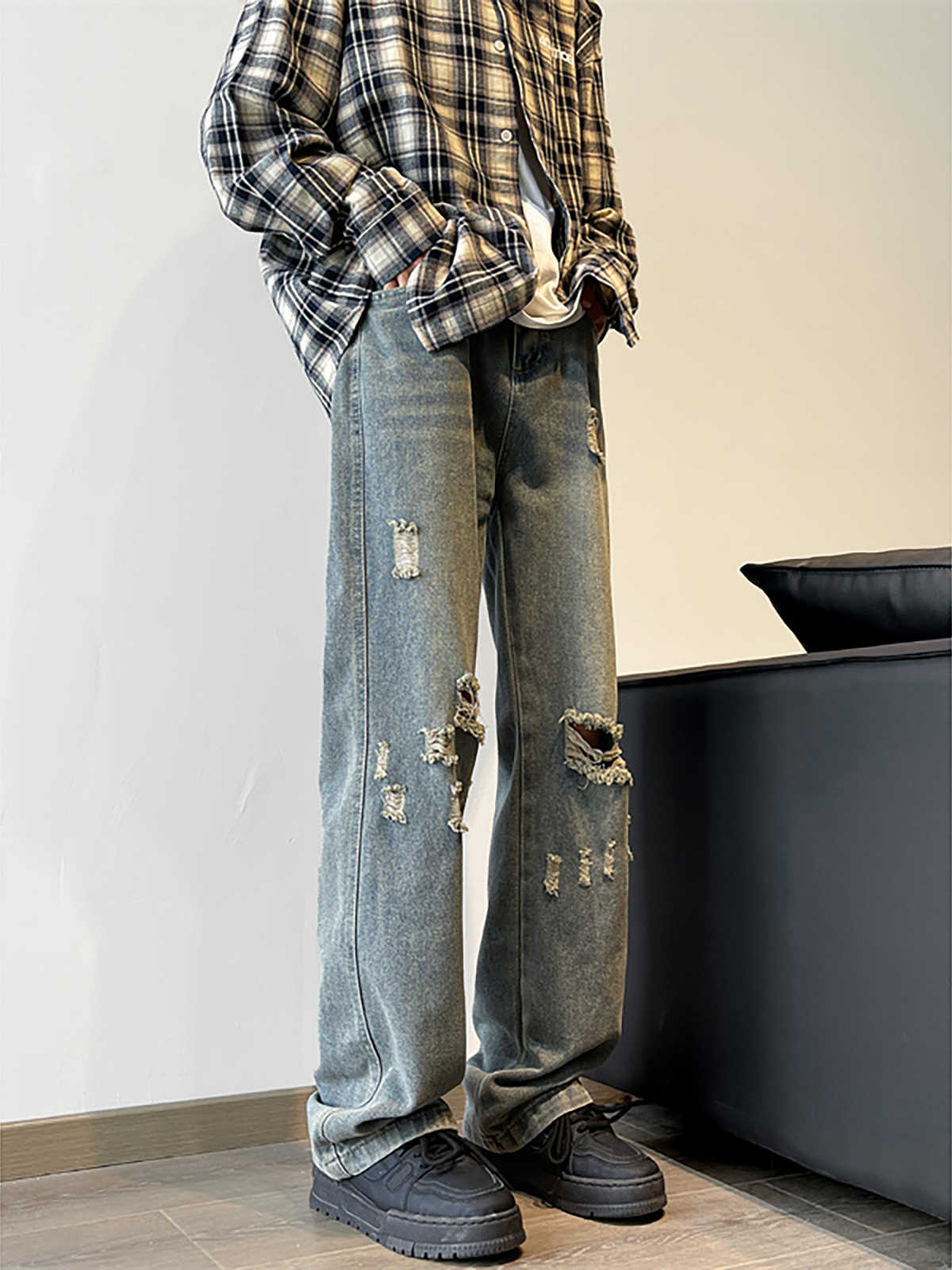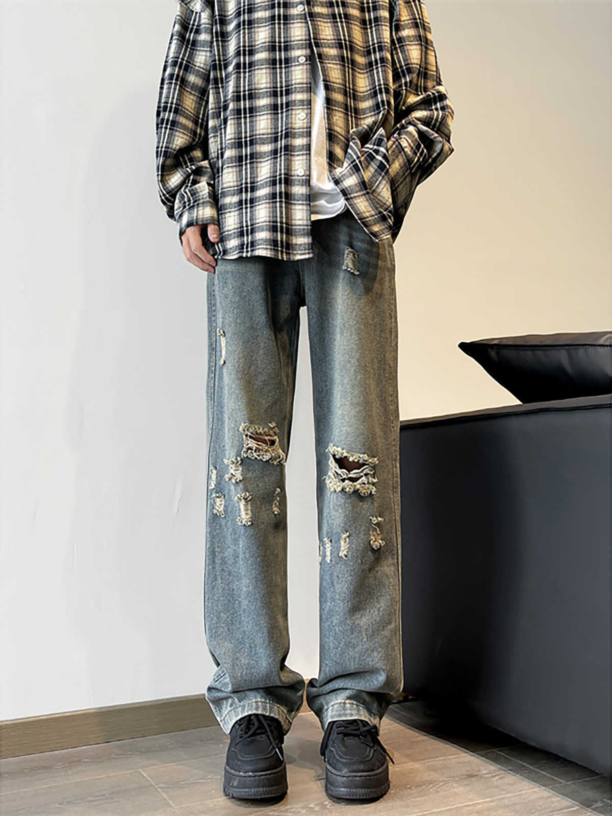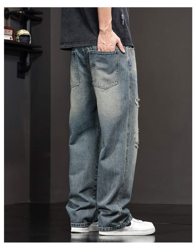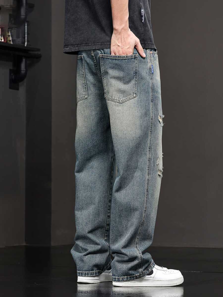 남아용 레트로 맞춤형 찢어진 로우 엣지 청바지, 얇고 루즈한 와이드 레그, 디스트레스드 바닥 길이, 맞춤형 스트레이트 팬츠스토어 가기