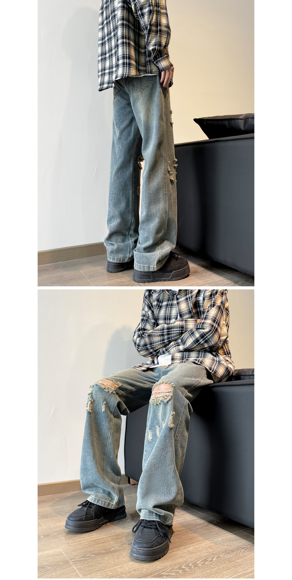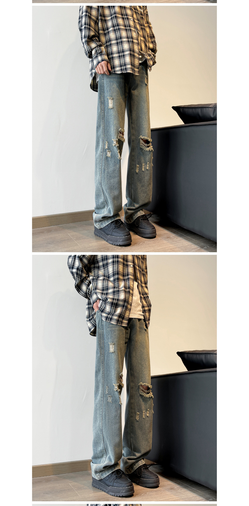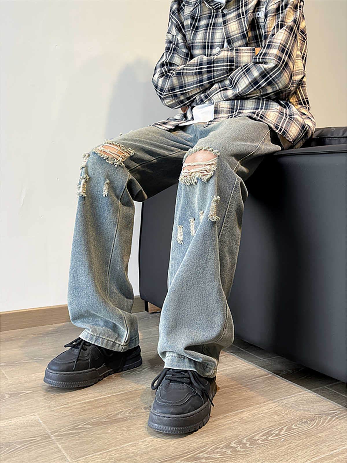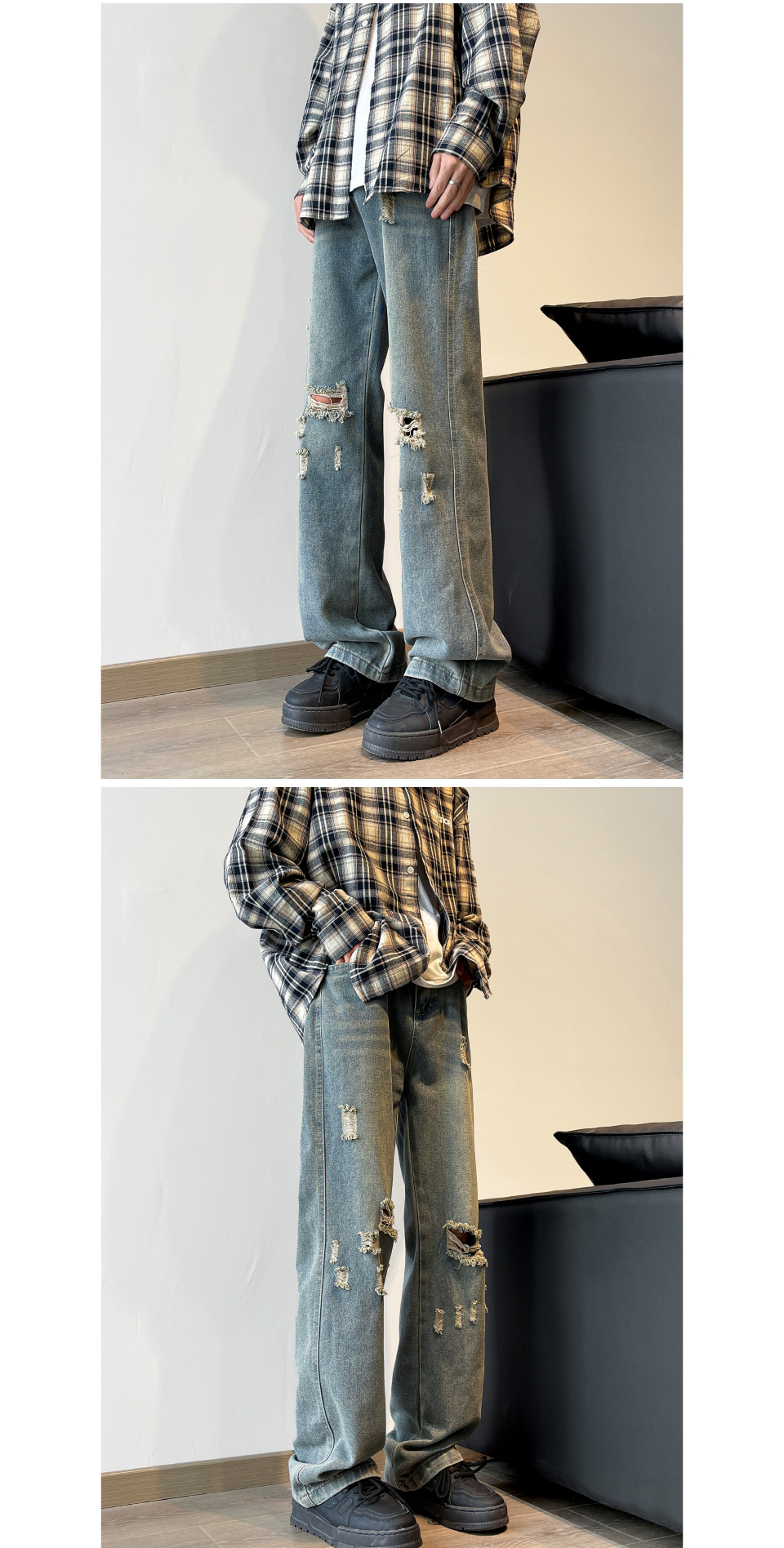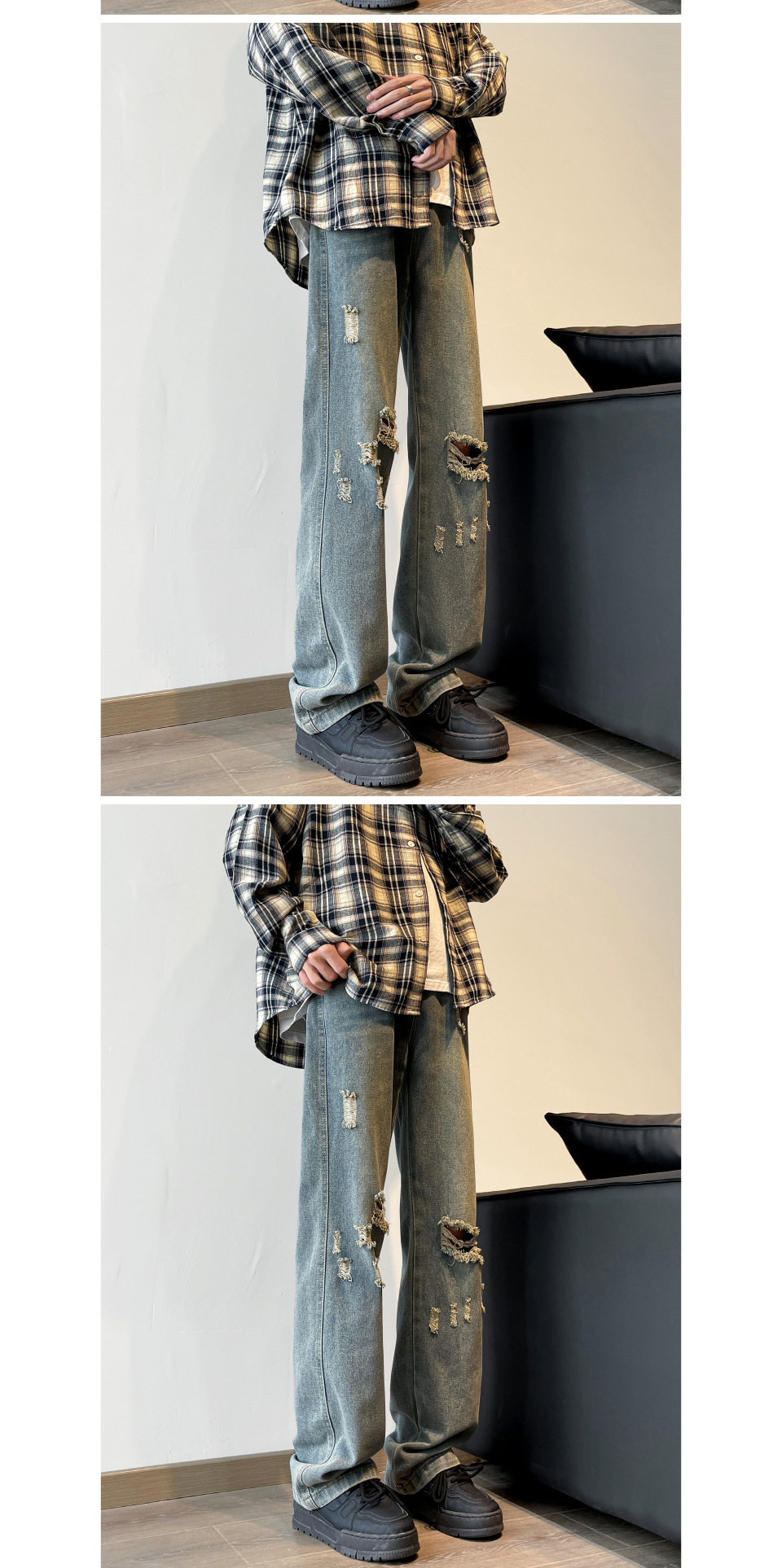 남아용 레트로 맞춤형 찢어진 로우 엣지 청바지, 얇고 루즈한 와이드 레그, 디스트레스드 바닥 길이, 맞춤형 스트레이트 팬츠스토어 가기