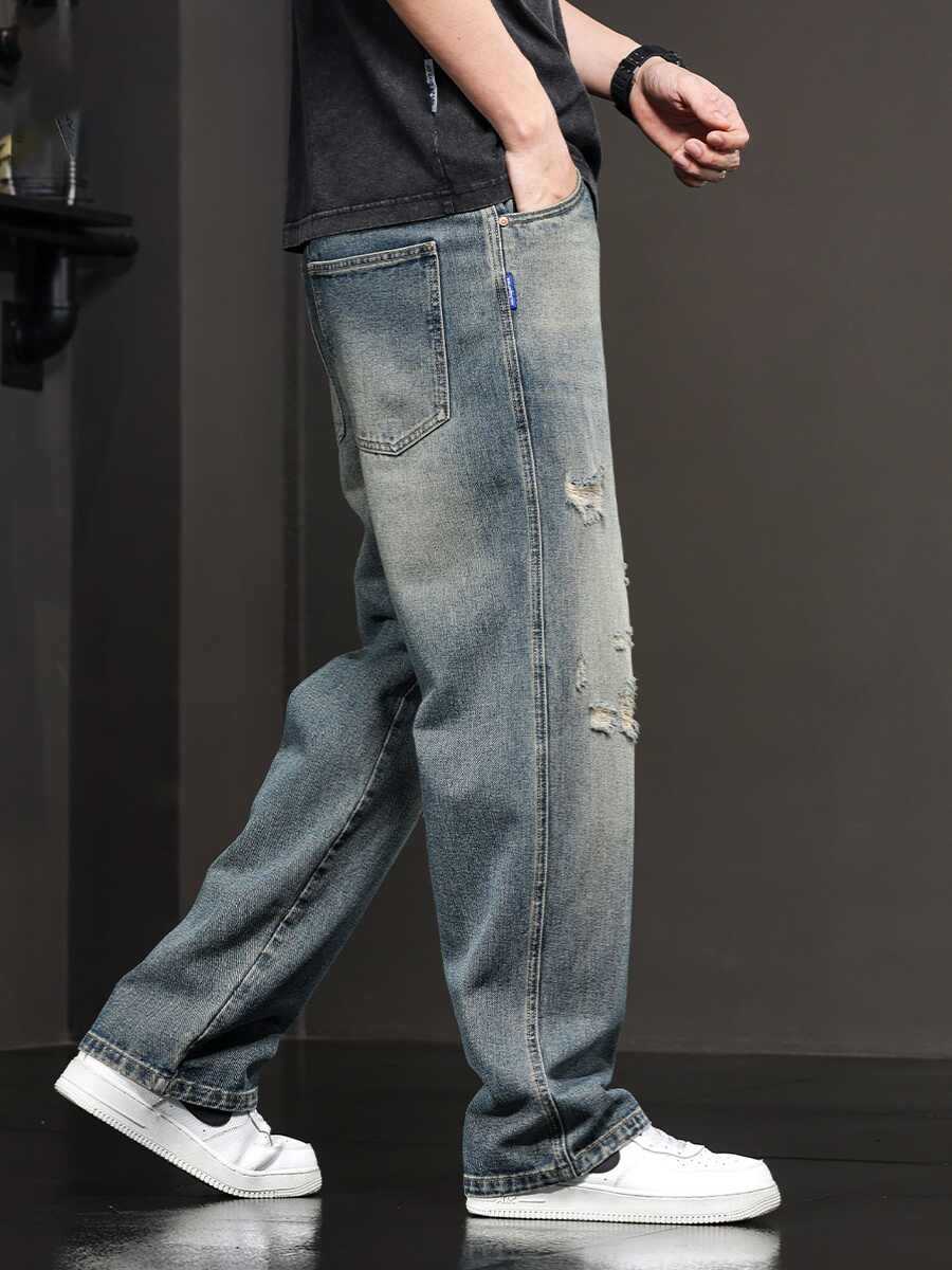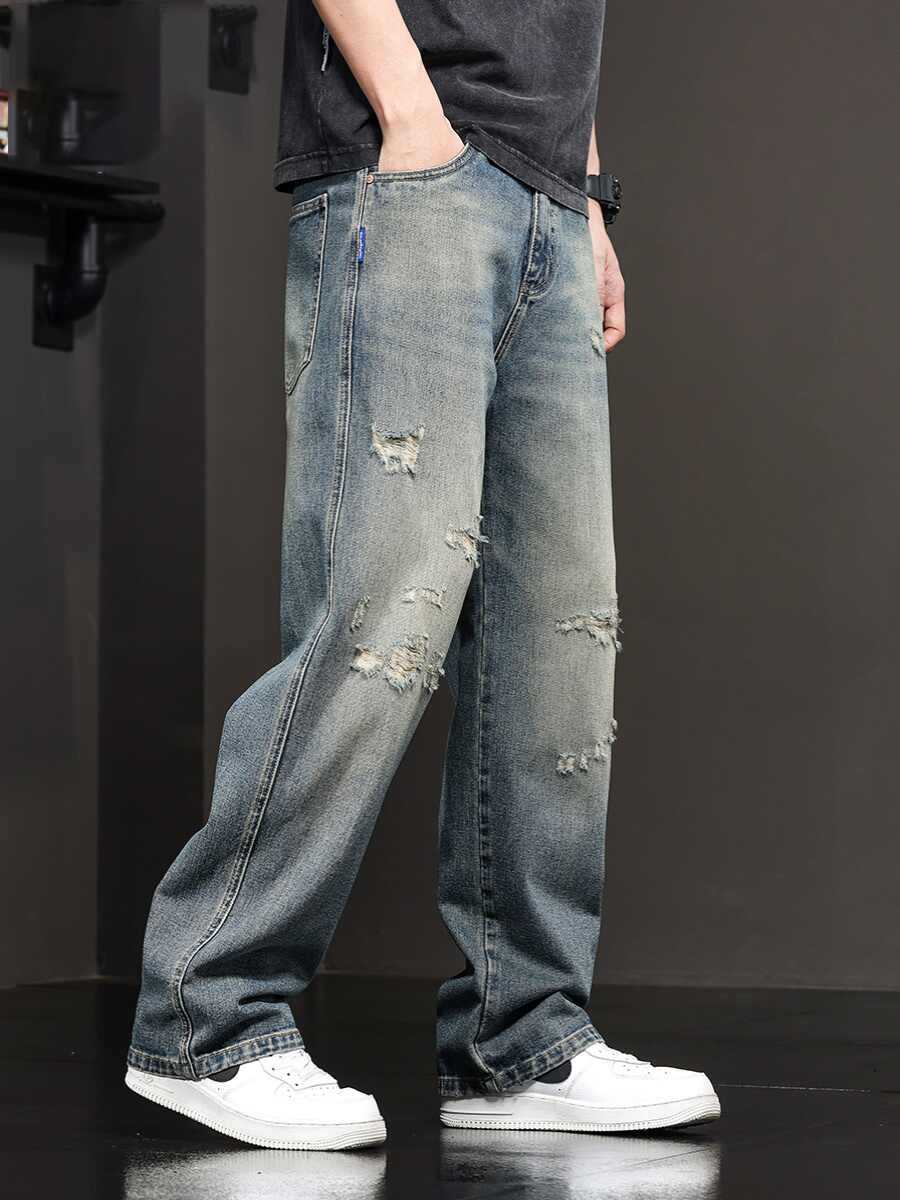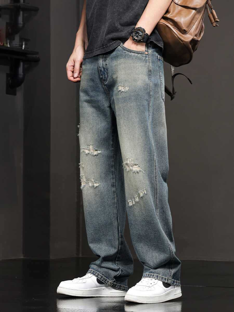 남아용 레트로 맞춤형 찢어진 로우 엣지 청바지, 얇고 루즈한 와이드 레그, 디스트레스드 바닥 길이, 맞춤형 스트레이트 팬츠