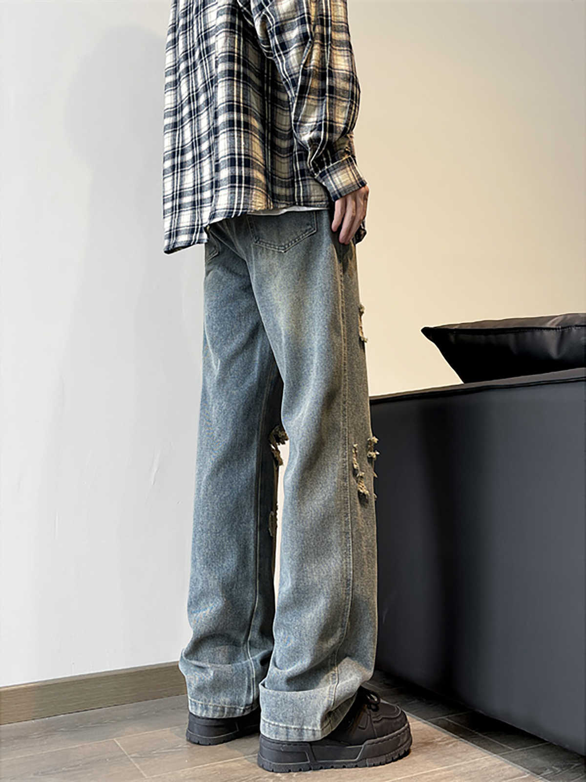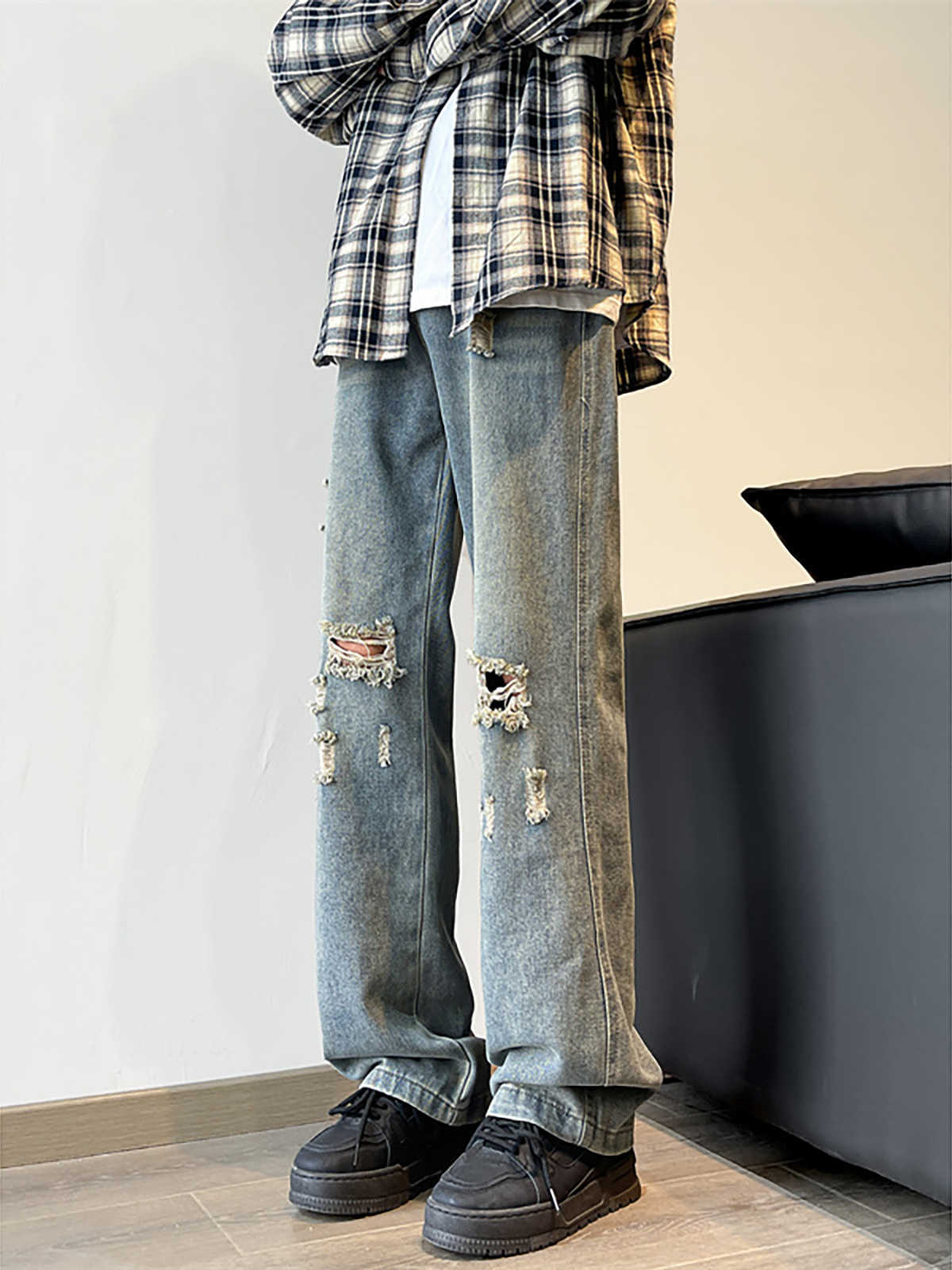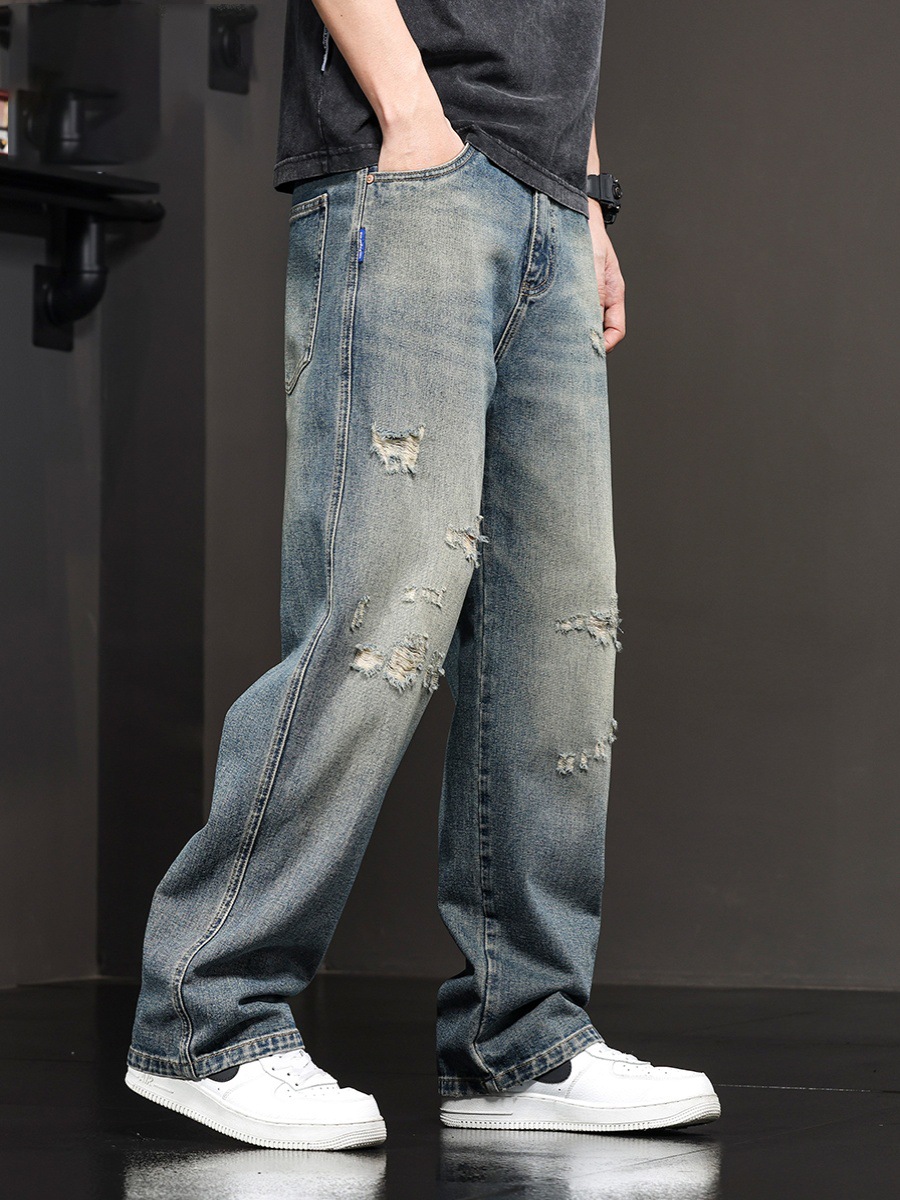 남아용 레트로 맞춤형 찢어진 로우 엣지 청바지, 얇고 루즈한 와이드 레그, 디스트레스드 바닥 길이, 맞춤형 스트레이트 팬츠