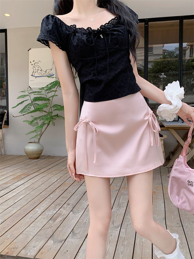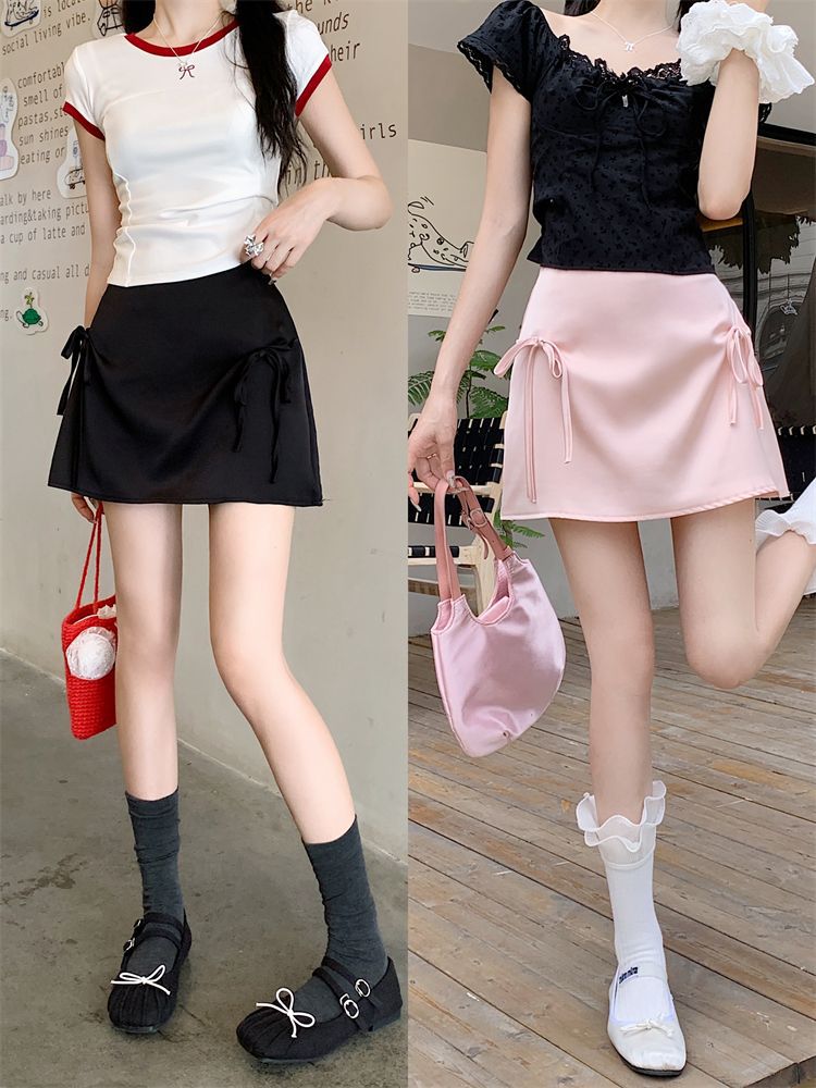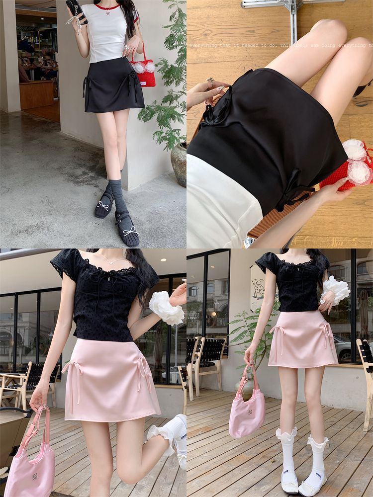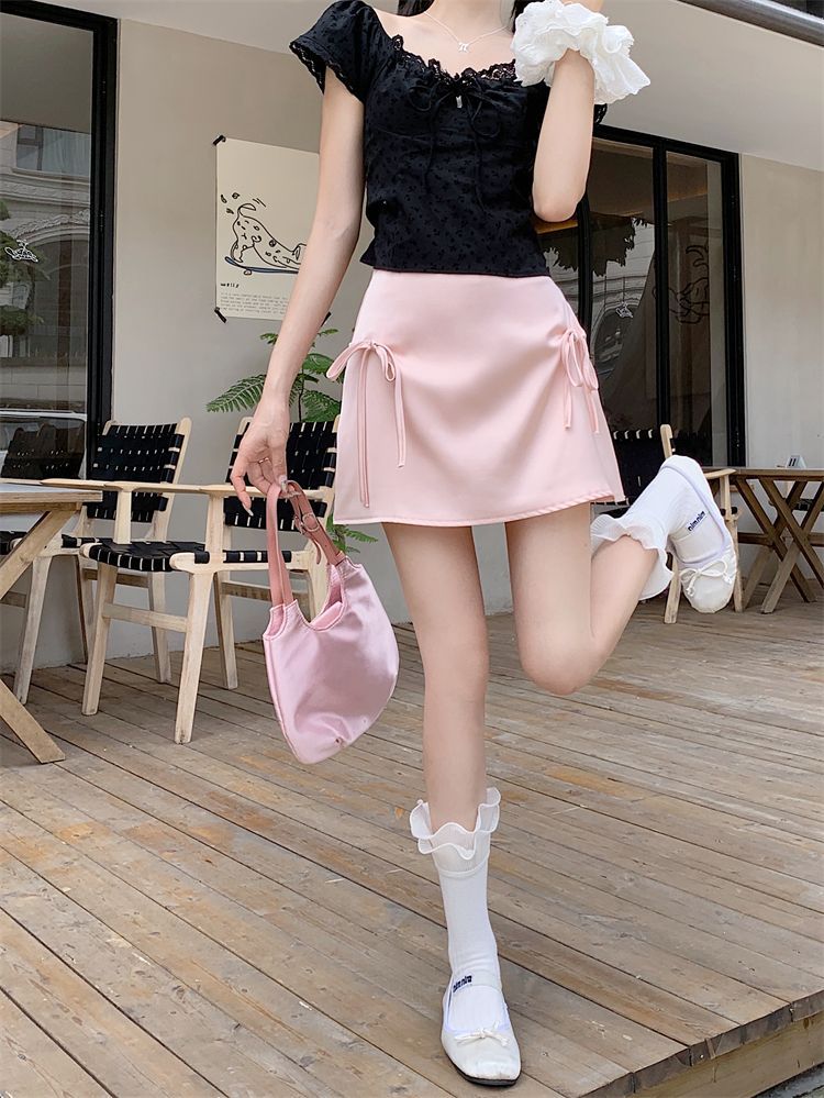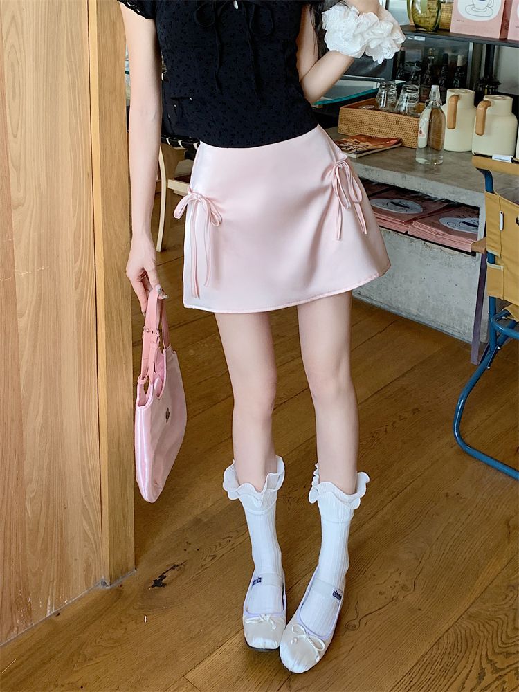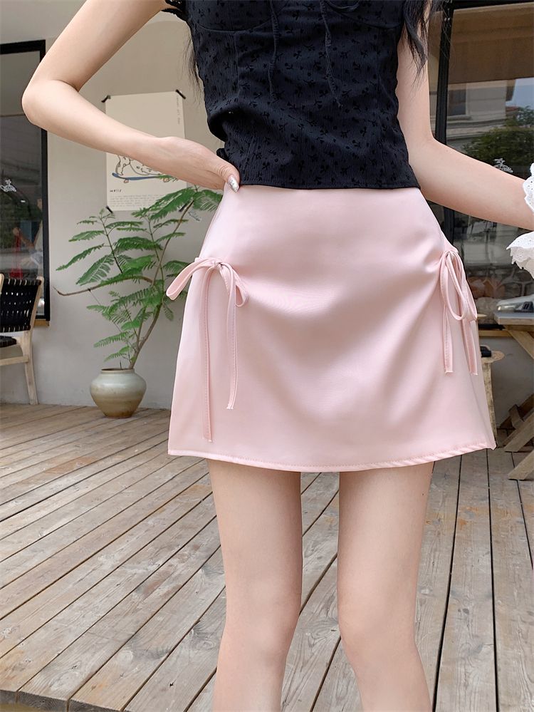 여성용 새틴 심플 솔리드 컬러 레이스 업 A 라인 스커트, 하이 웨이스트, 힙 커버, 슬리밍 스커트, 리본 스커트, 반바지 스커트