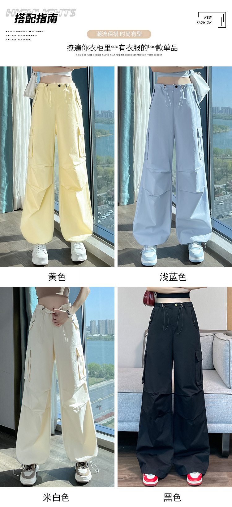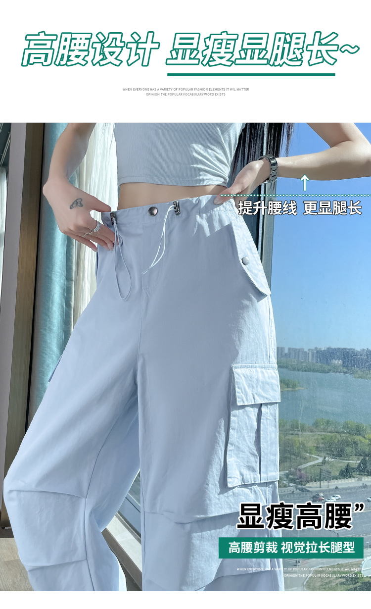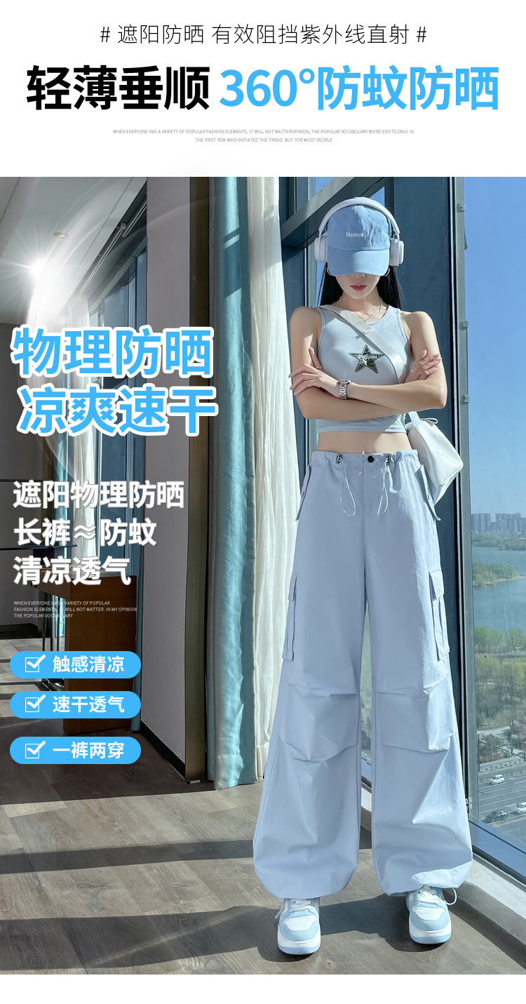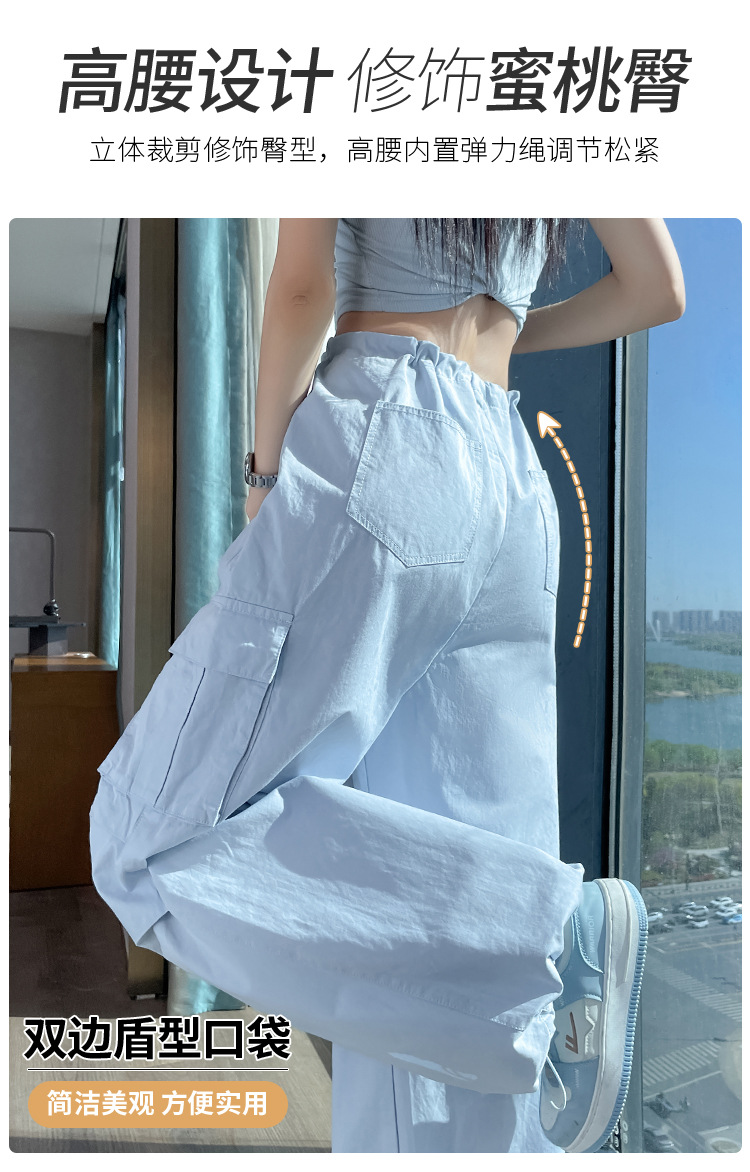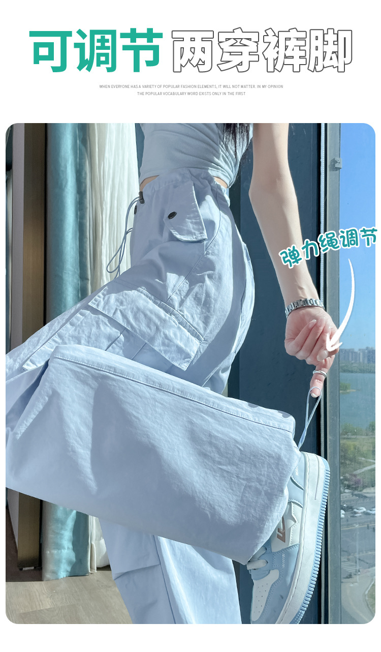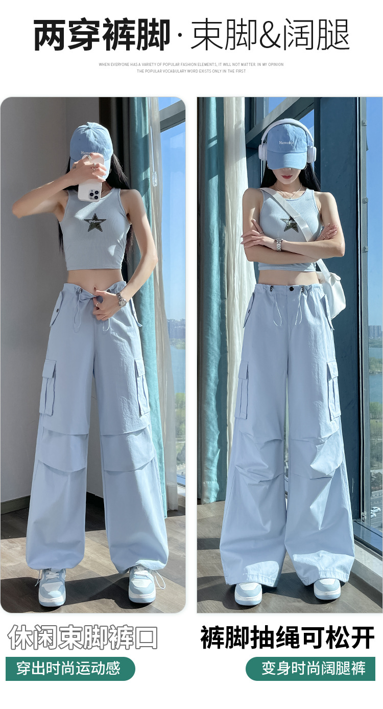 여름 여성용 아메리칸 핫걸 블루 오버올 하이 웨이스트 드로스트링 와이드 레그 팬츠 루즈 아이스 실크 속건 스포츠 하이킹 팬츠