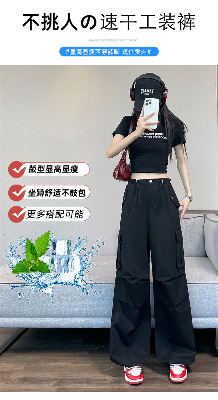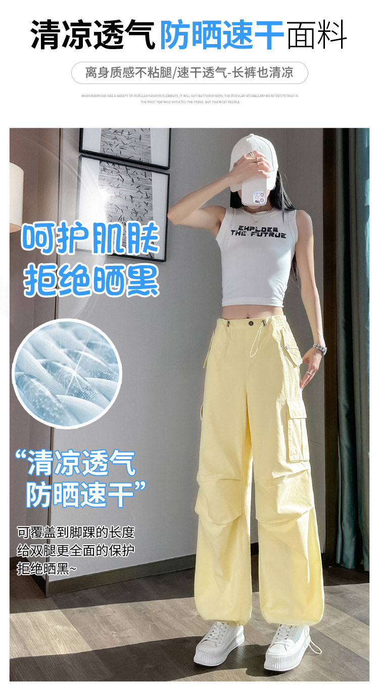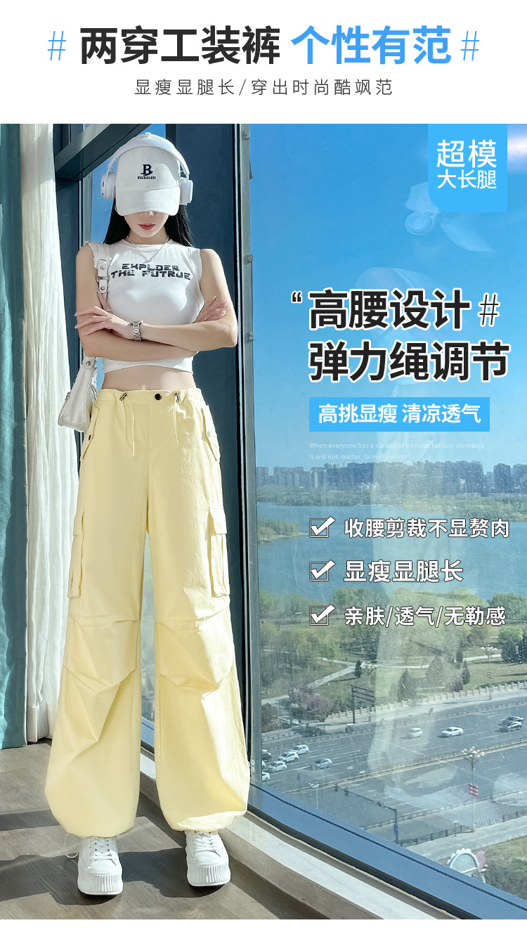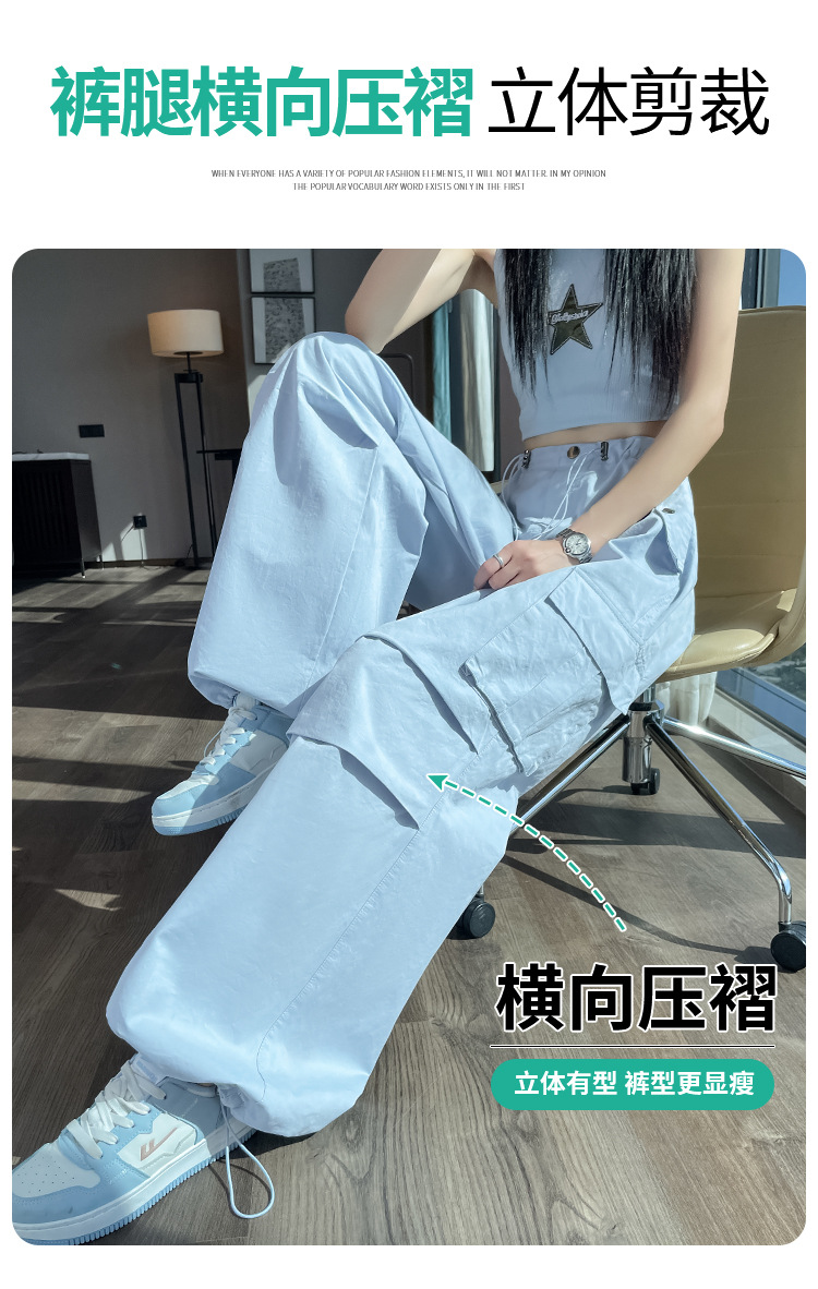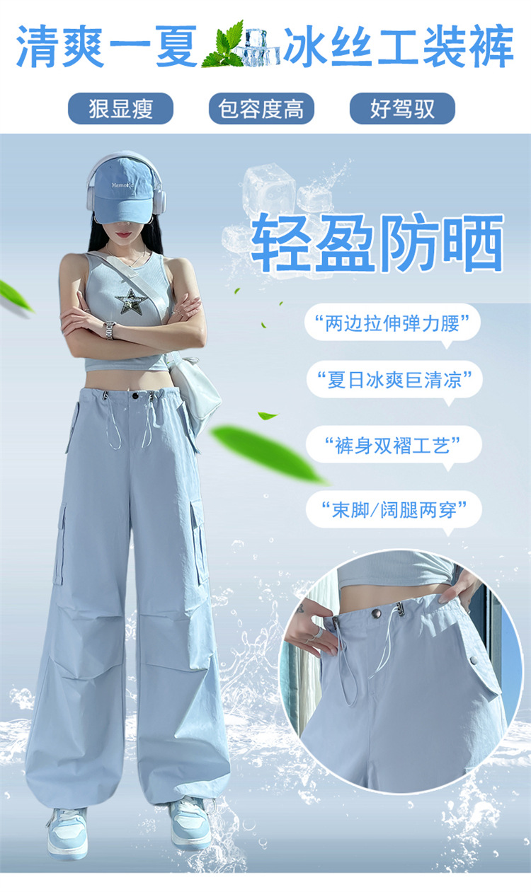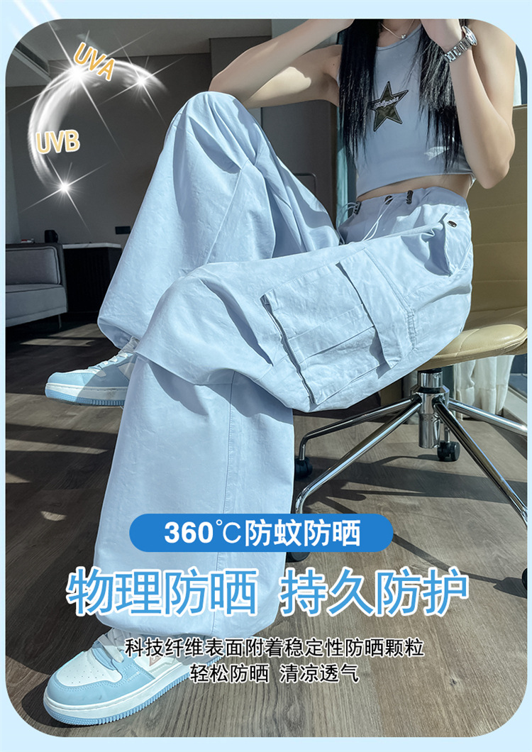 여름 여성용 아메리칸 핫걸 블루 오버올 하이 웨이스트 드로스트링 와이드 레그 팬츠 루즈 아이스 실크 속건 스포츠 하이킹 팬츠