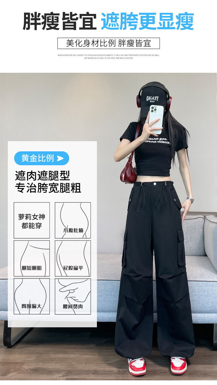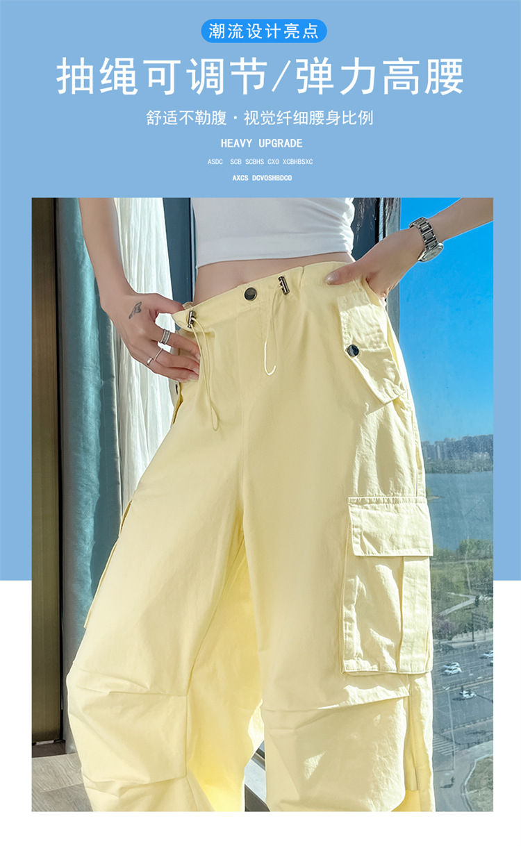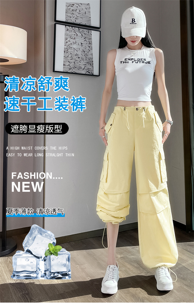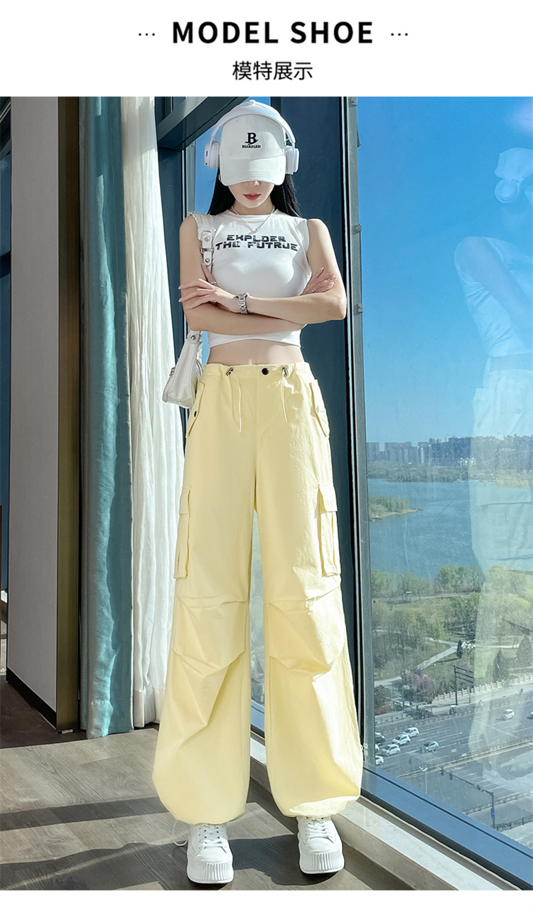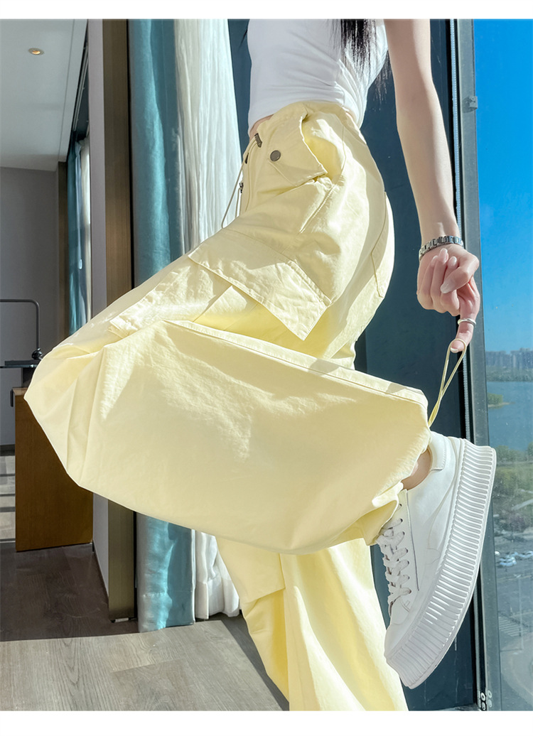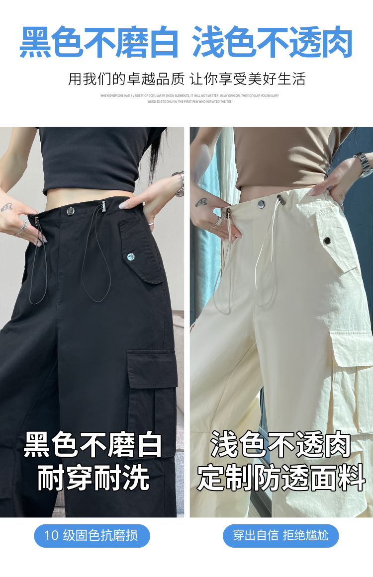 여름 여성용 아메리칸 핫걸 블루 오버올 하이 웨이스트 드로스트링 와이드 레그 팬츠 루즈 아이스 실크 속건 스포츠 하이킹 팬츠