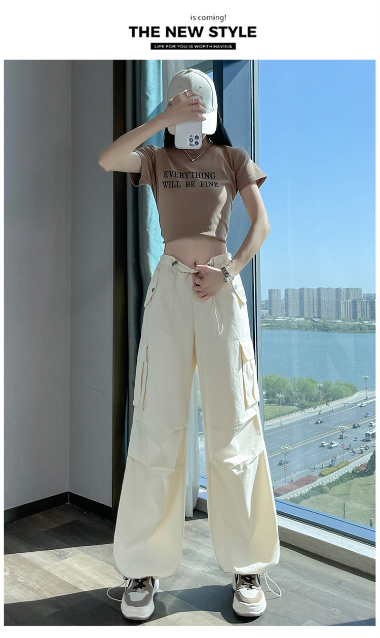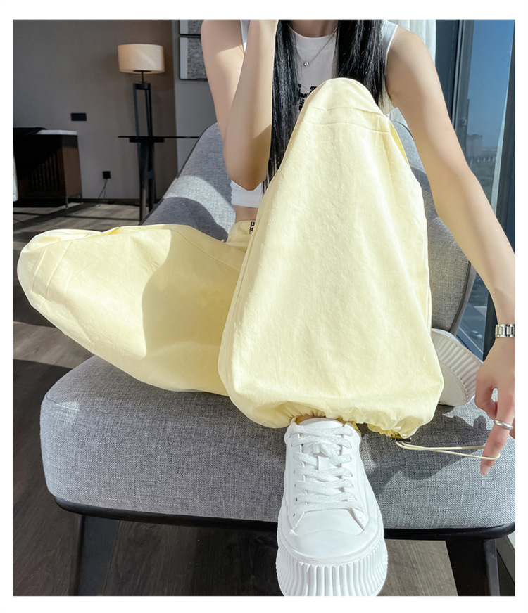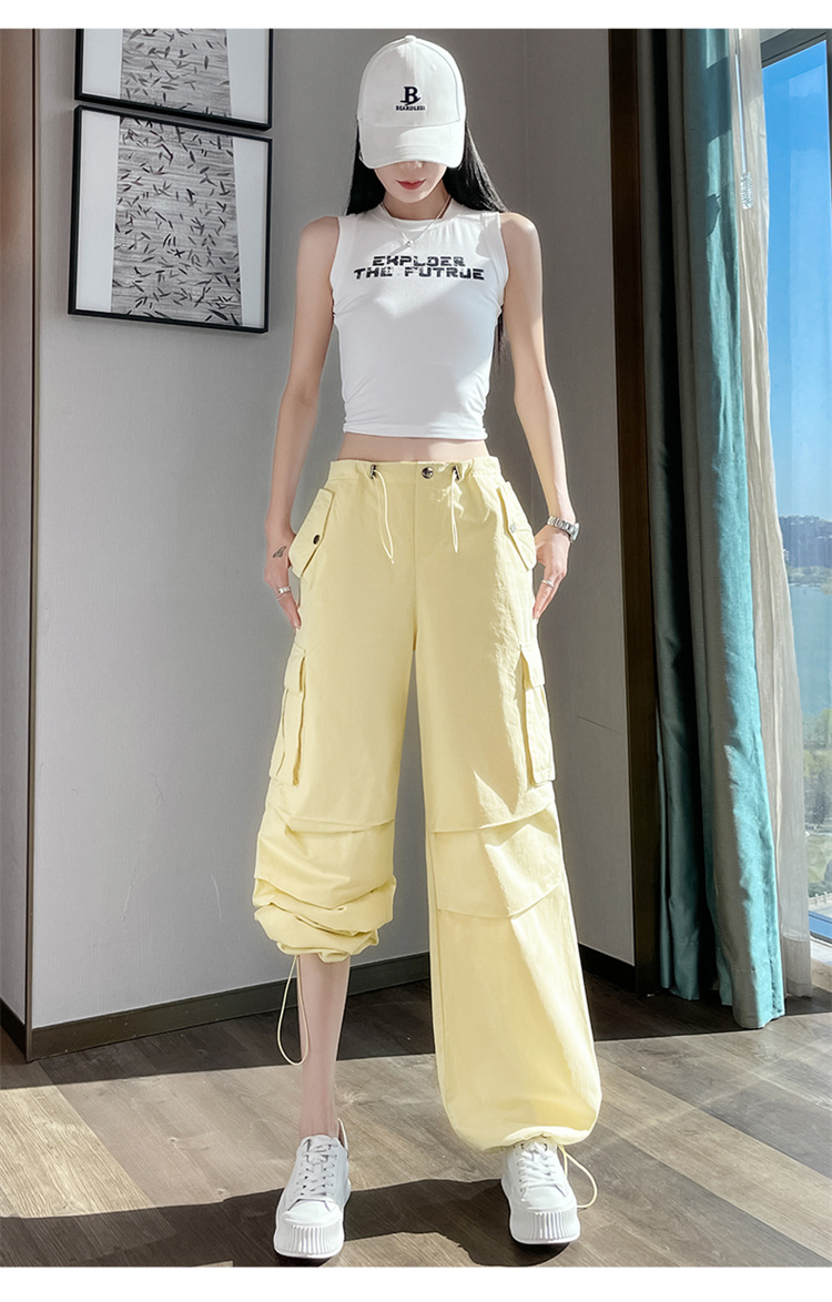 여름 여성용 아메리칸 핫걸 블루 오버올 하이 웨이스트 드로스트링 와이드 레그 팬츠 루즈 아이스 실크 속건 스포츠 하이킹 팬츠스토어 가기