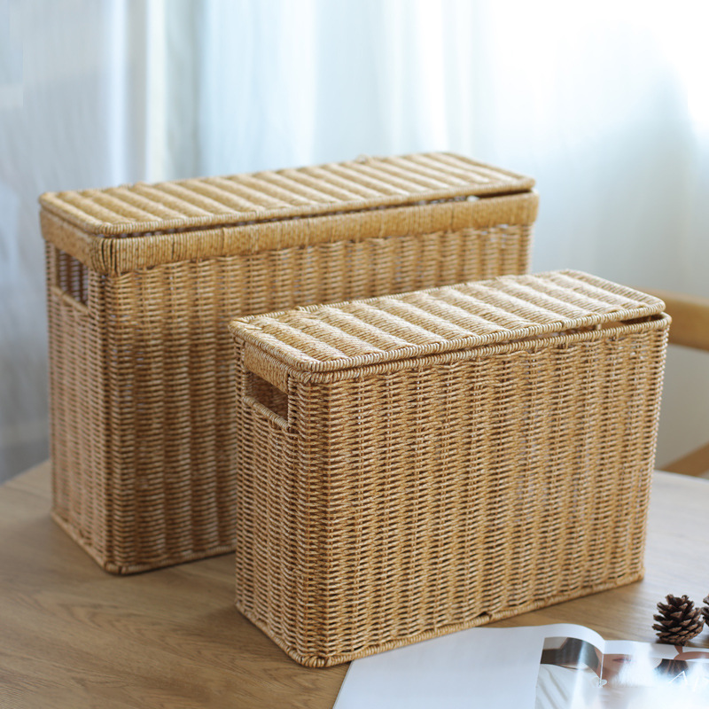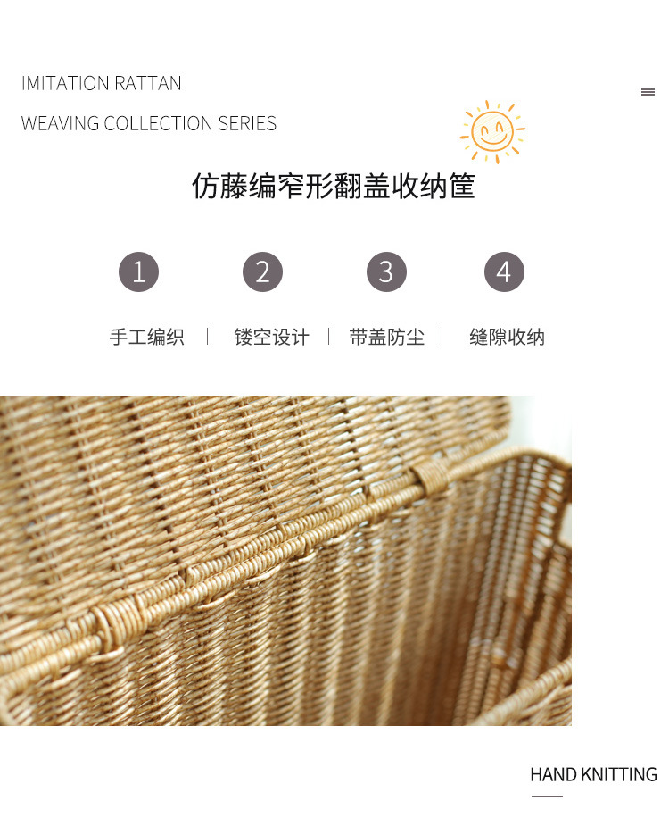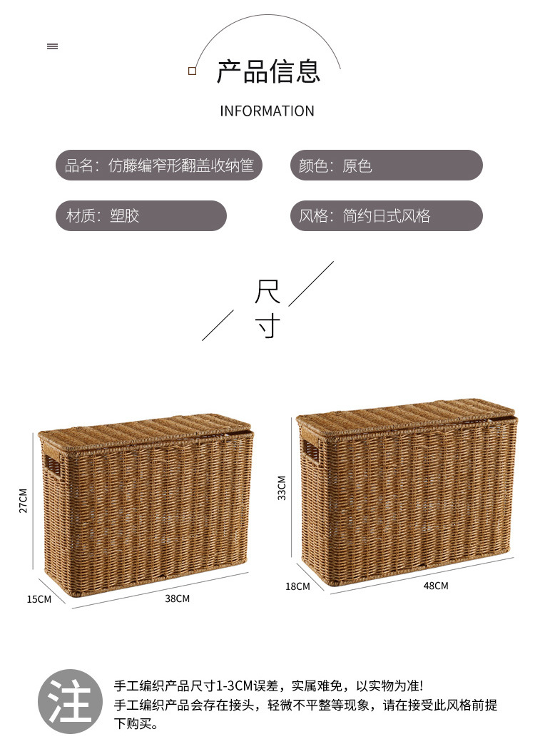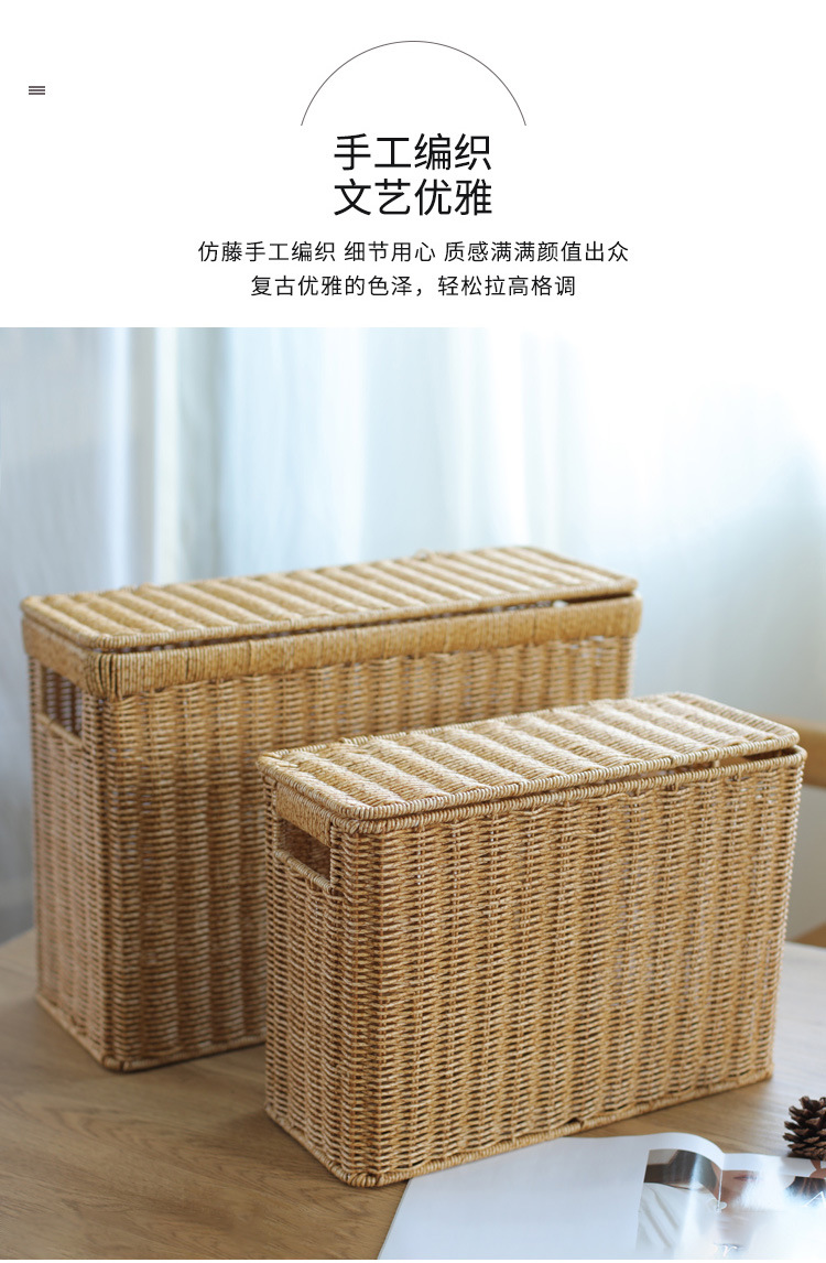 직사각형 수납 상자, 좁은 가장자리, 높고 깊은 상자, 뚜껑이 있는 모조 등나무 수납 바구니, 좁은 스트립