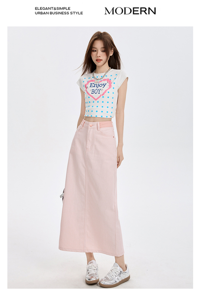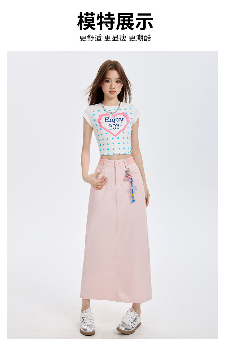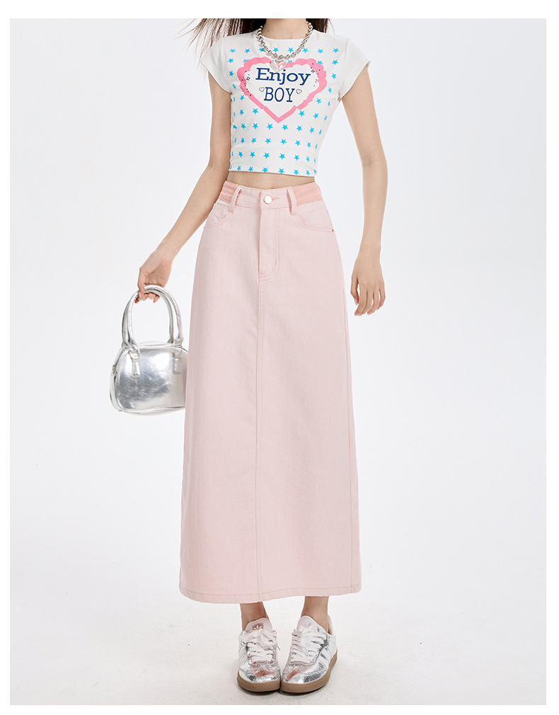 여성을위한 사쿠라 핑크 하이 웨이스트 데님 스커트 2025 여름 새로운 디자인 슬릿 a 라인 중간 길이 힙 스커트스토어 가기