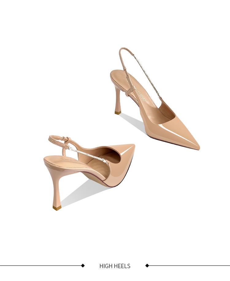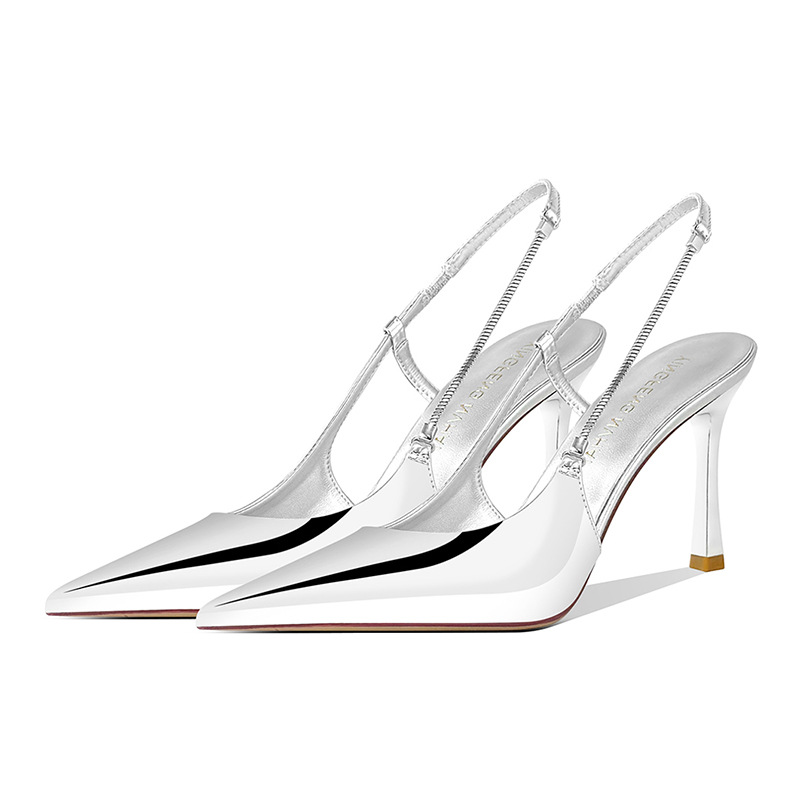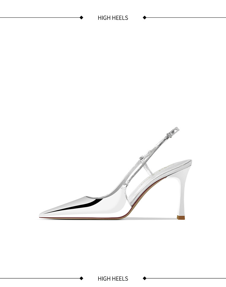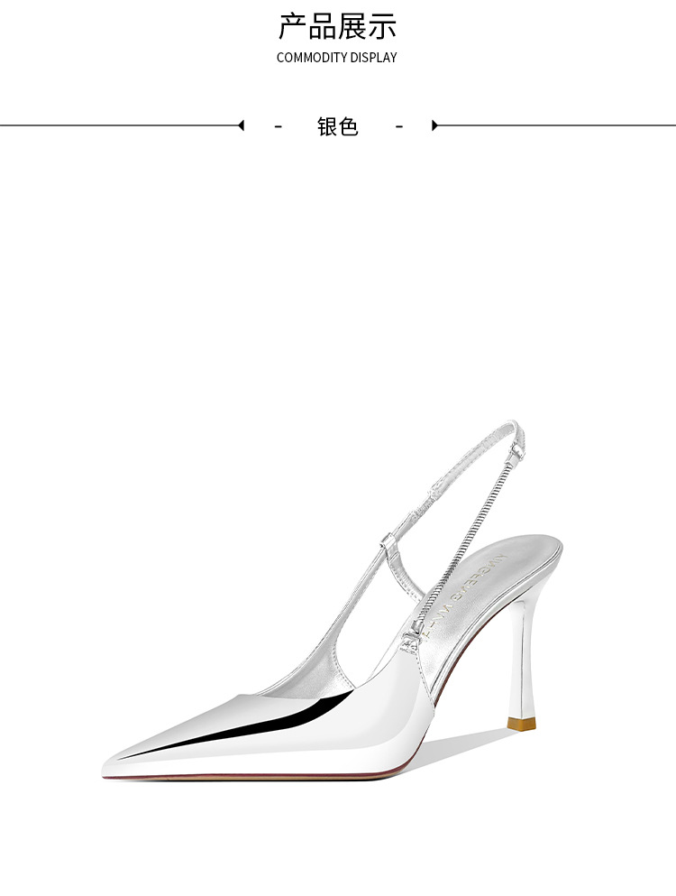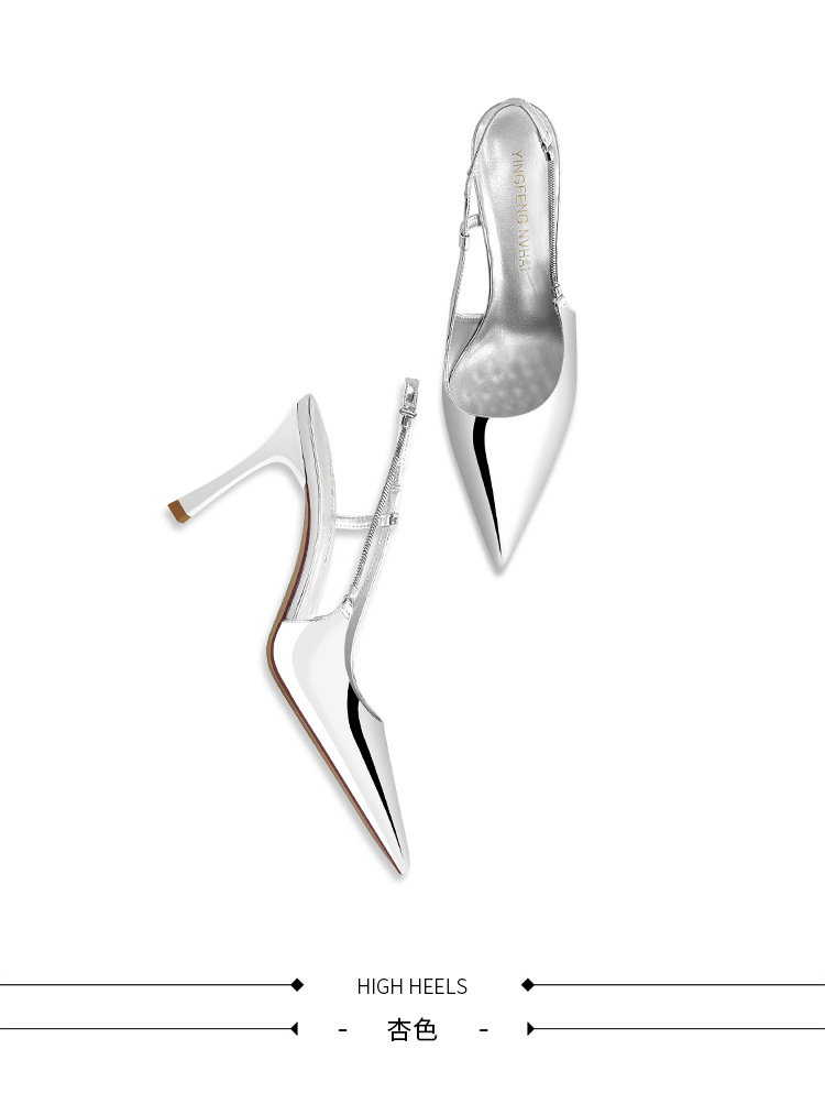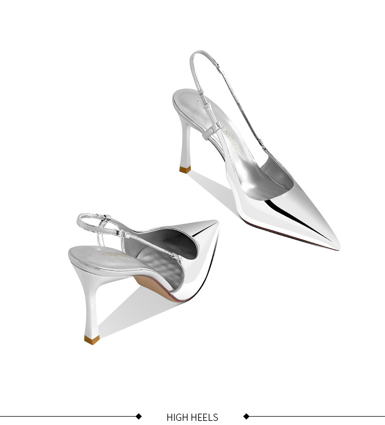 《재고 있음》C 브랜드 실버 뾰족코 하이힐 샌들 여성용 프렌치 스타일 초봄 우아한 얇은 굽 뒤가 열린 신발스토어 가기