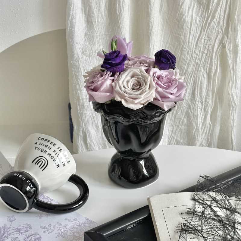 • 큰 검은색 꽃병 + 장미 꽃다발