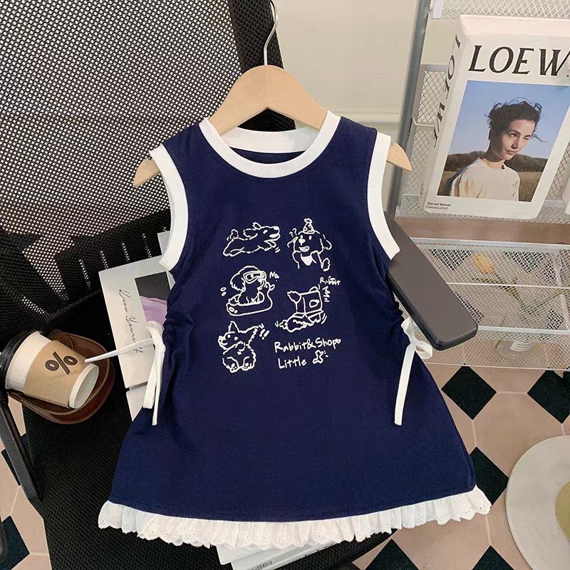 여자 드레스 여름 새로운 한국어 스타일 아기 소녀 귀여운 만화 민소매 조끼 드레스 유행 티셔츠 스커트 유행스토어 가기