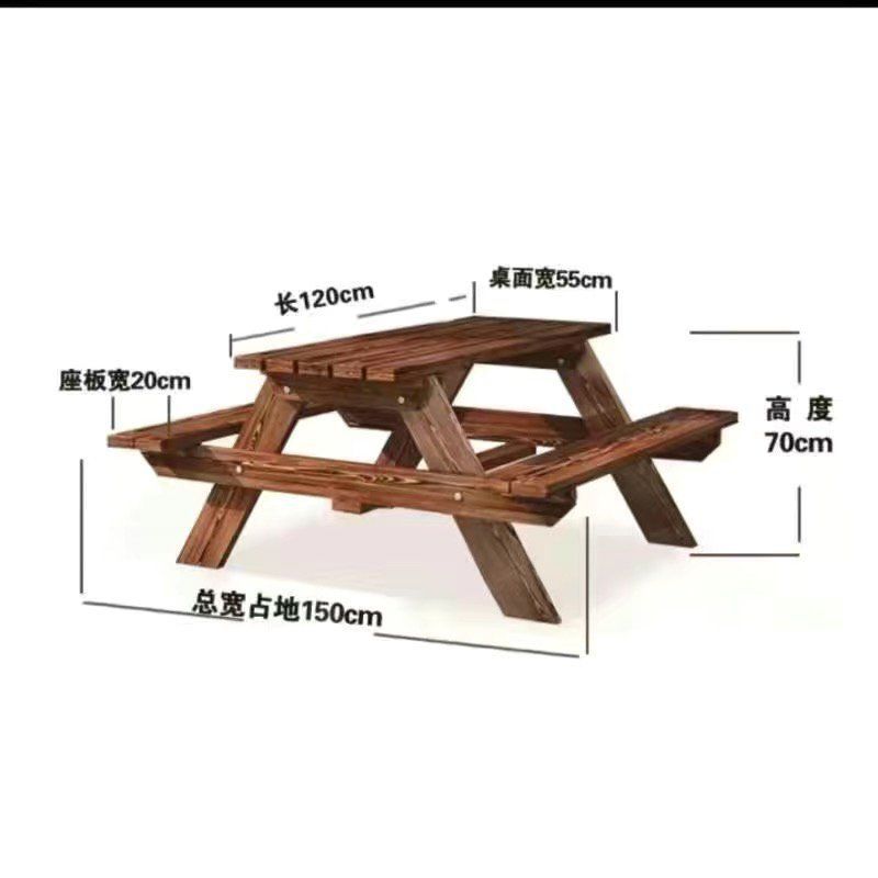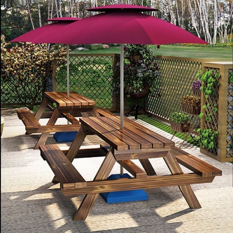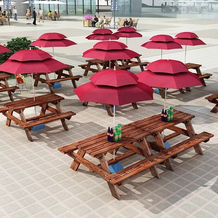 야외 테이블과 의자 조합 밀크티 바베큐 레스토랑 안뜰 야외 수통 일체형 식탁과 우산이 있는 의자 공원 원목 부식 방지스토어 가기
