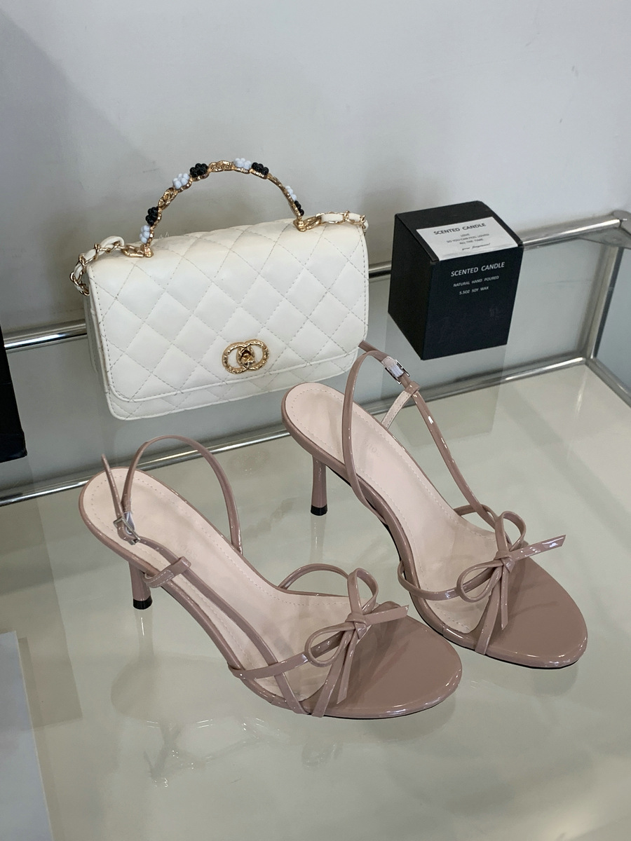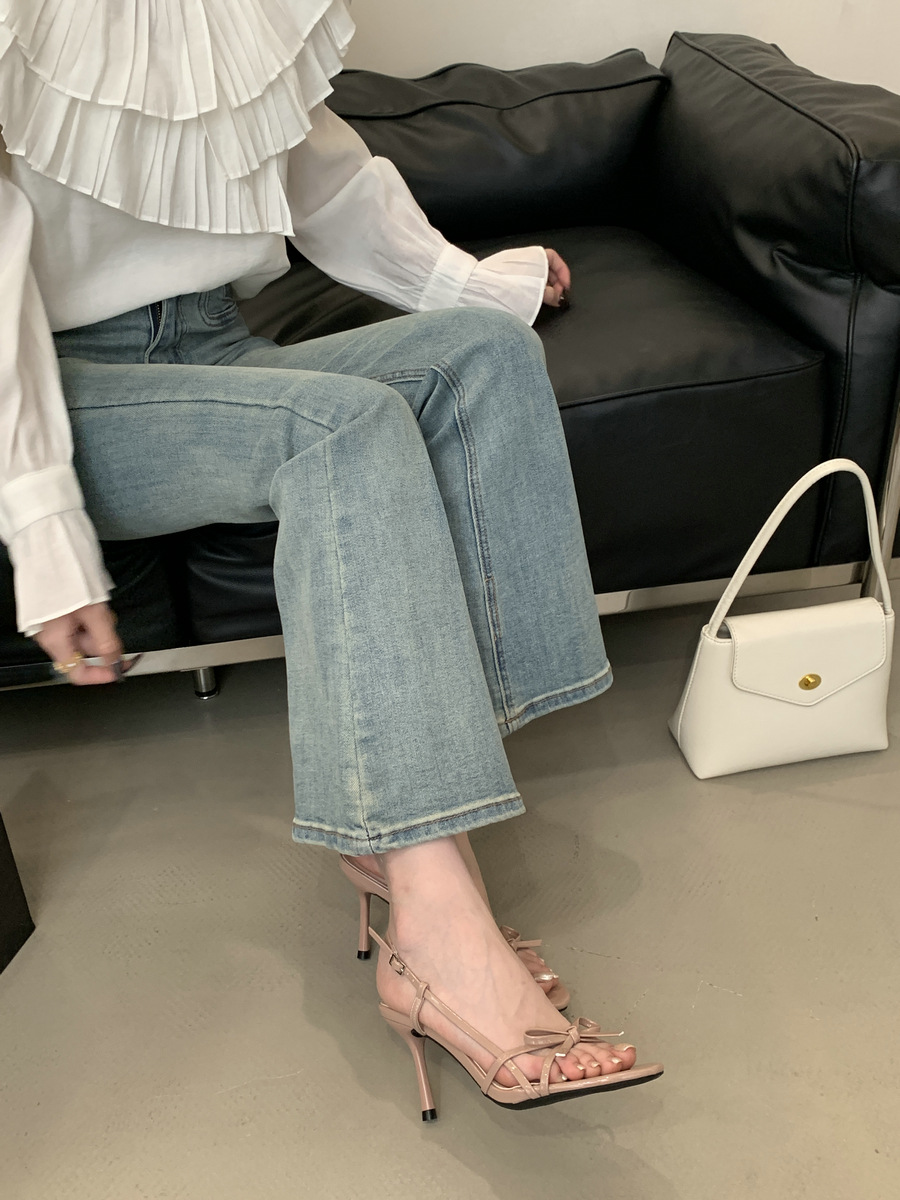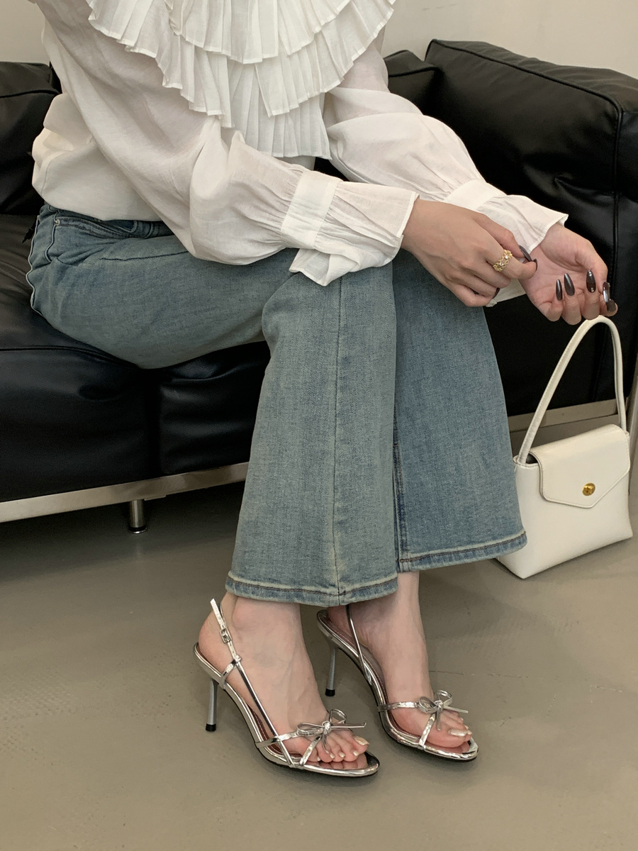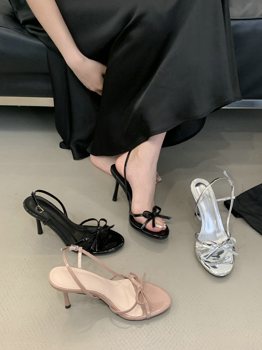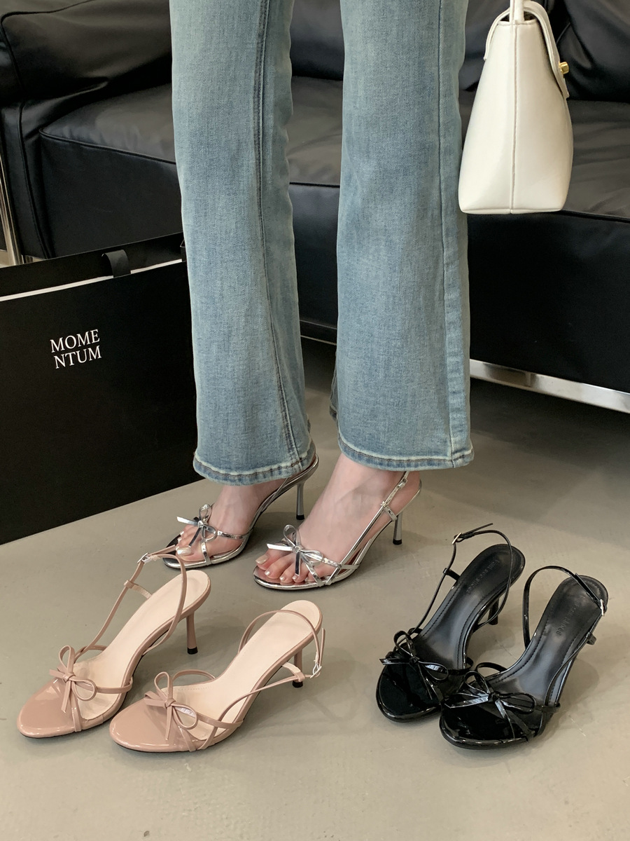 1399-2~2025 여름 신작 여성용 리본 오픈 토 프렌치 스타일 하이힐 샌들스토어 가기