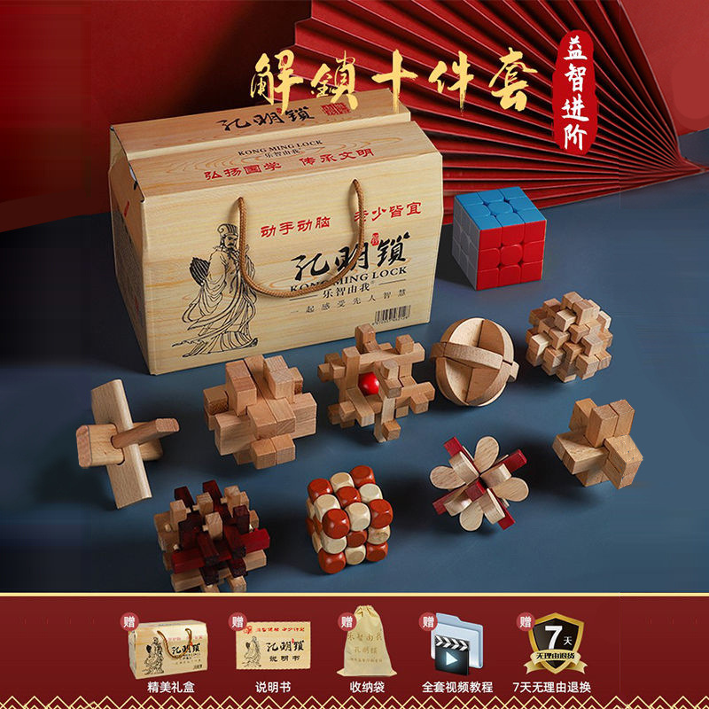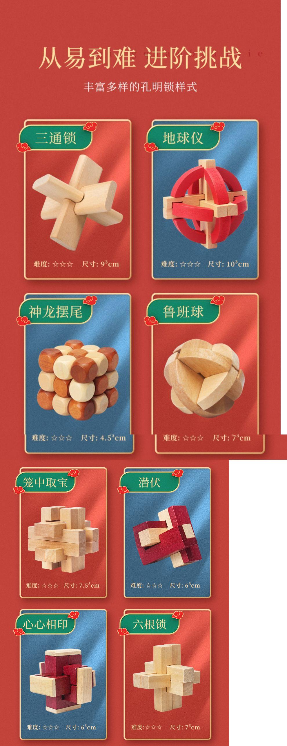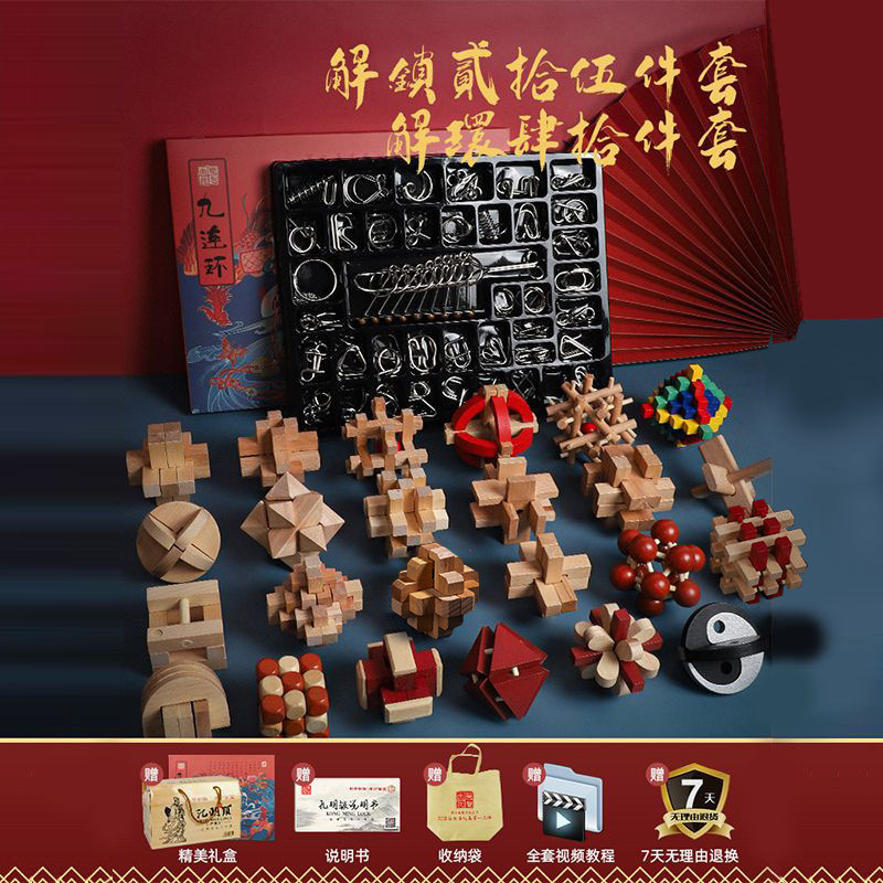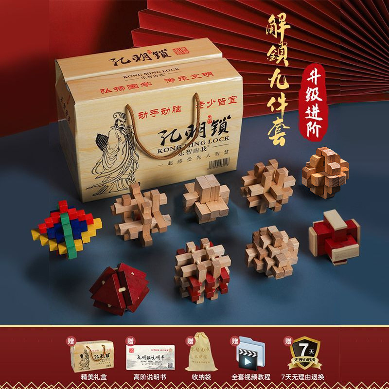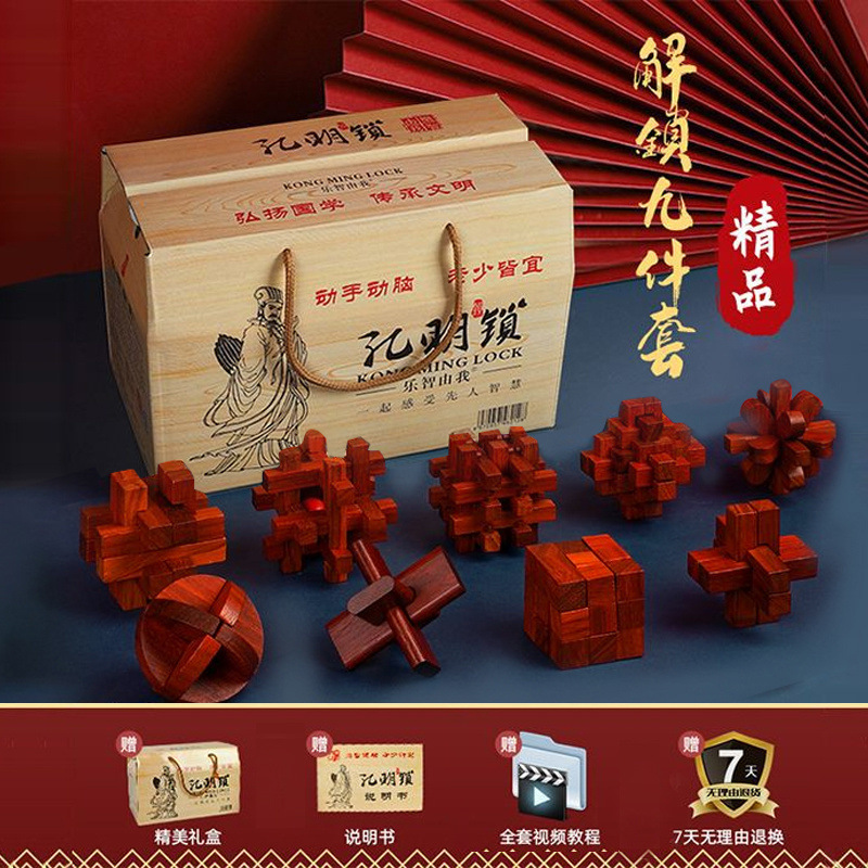 Kongming Lock Luban Lock 초등학생을위한 지능형 링 해제 나무 빌딩 블록 9 링 교육 장난감 전체 세트