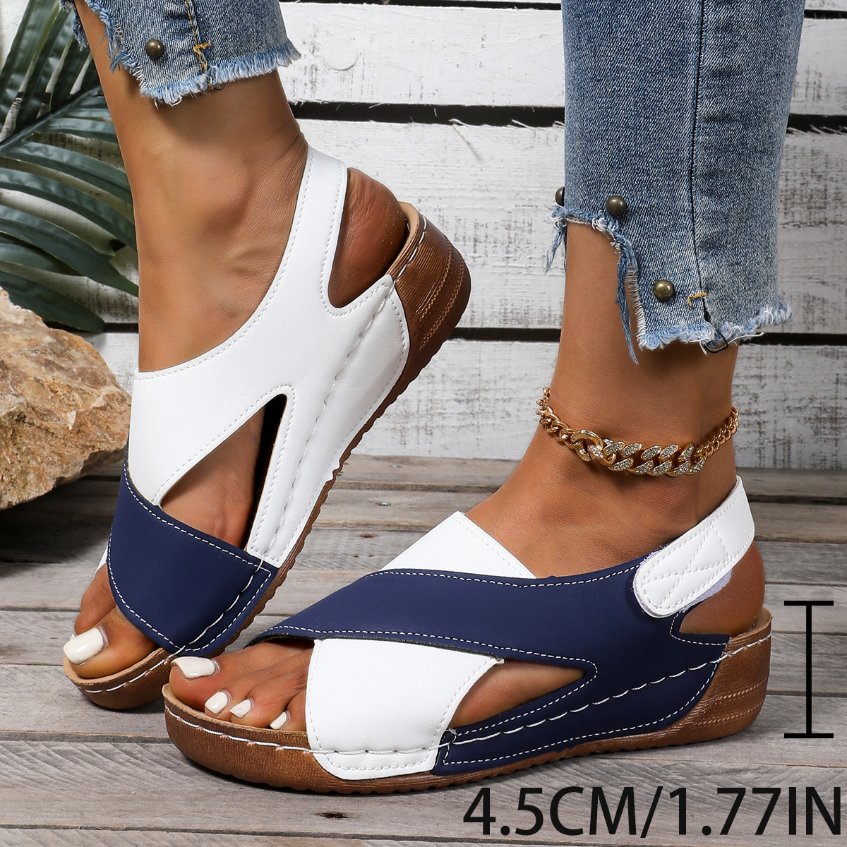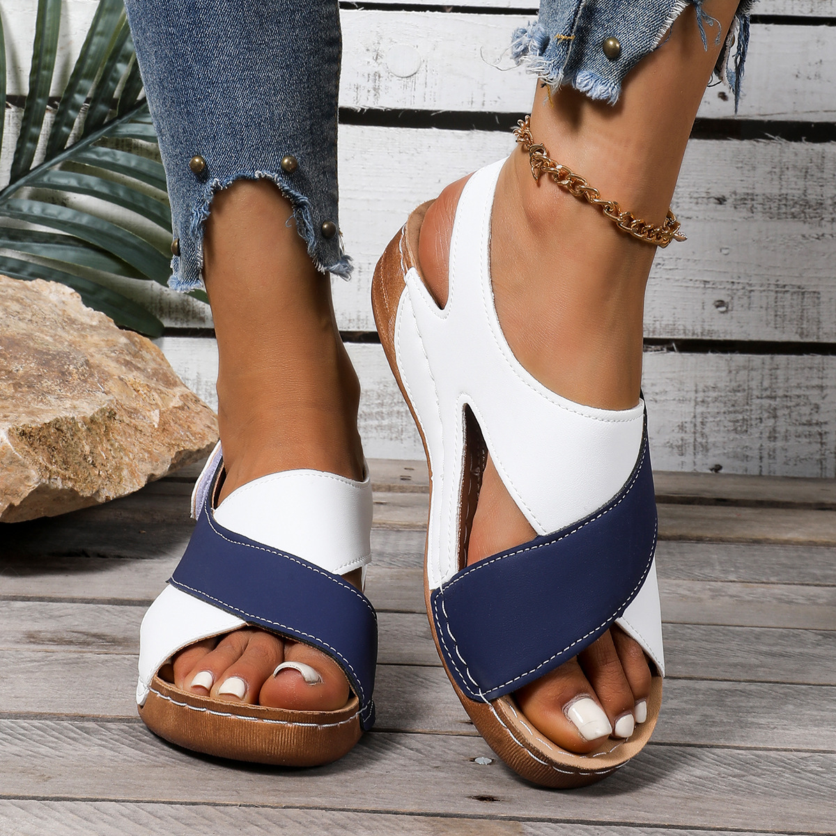 유럽과 미국의 대외 무역 두꺼운 밑창 컬러 블록 비치 샌들 2025 여름 대형 벨크로 크로스 플랫폼 샌들 여성용