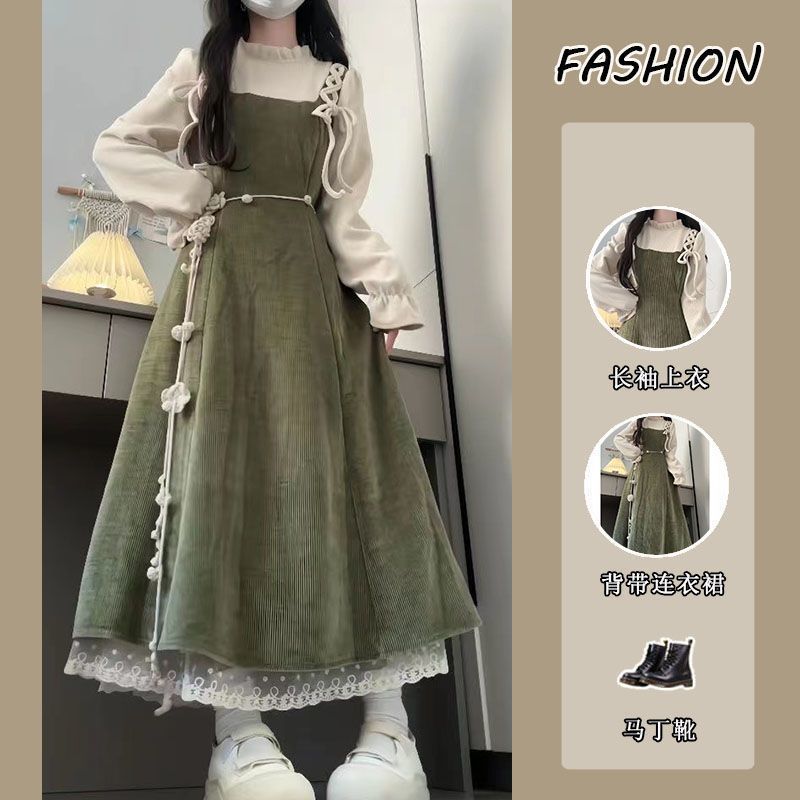 여성 2025 가을 한국 스타일 연령 감소 긴팔 셔츠 탑 허리 슬리밍 서스펜더 드레스 투피스 세트스토어 가기