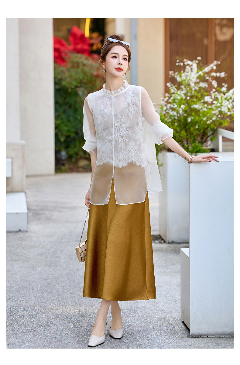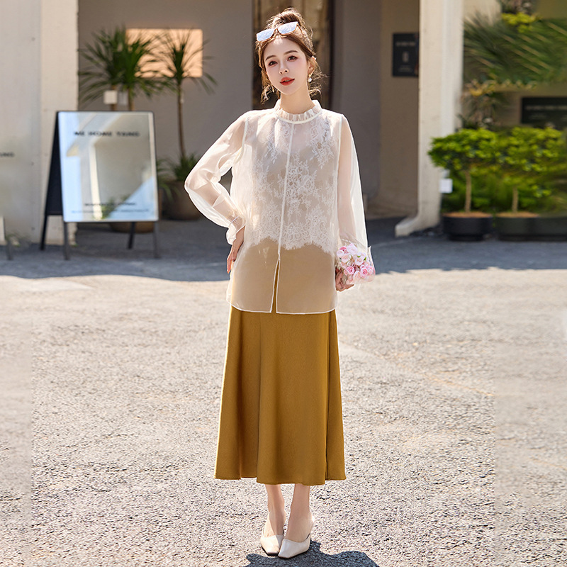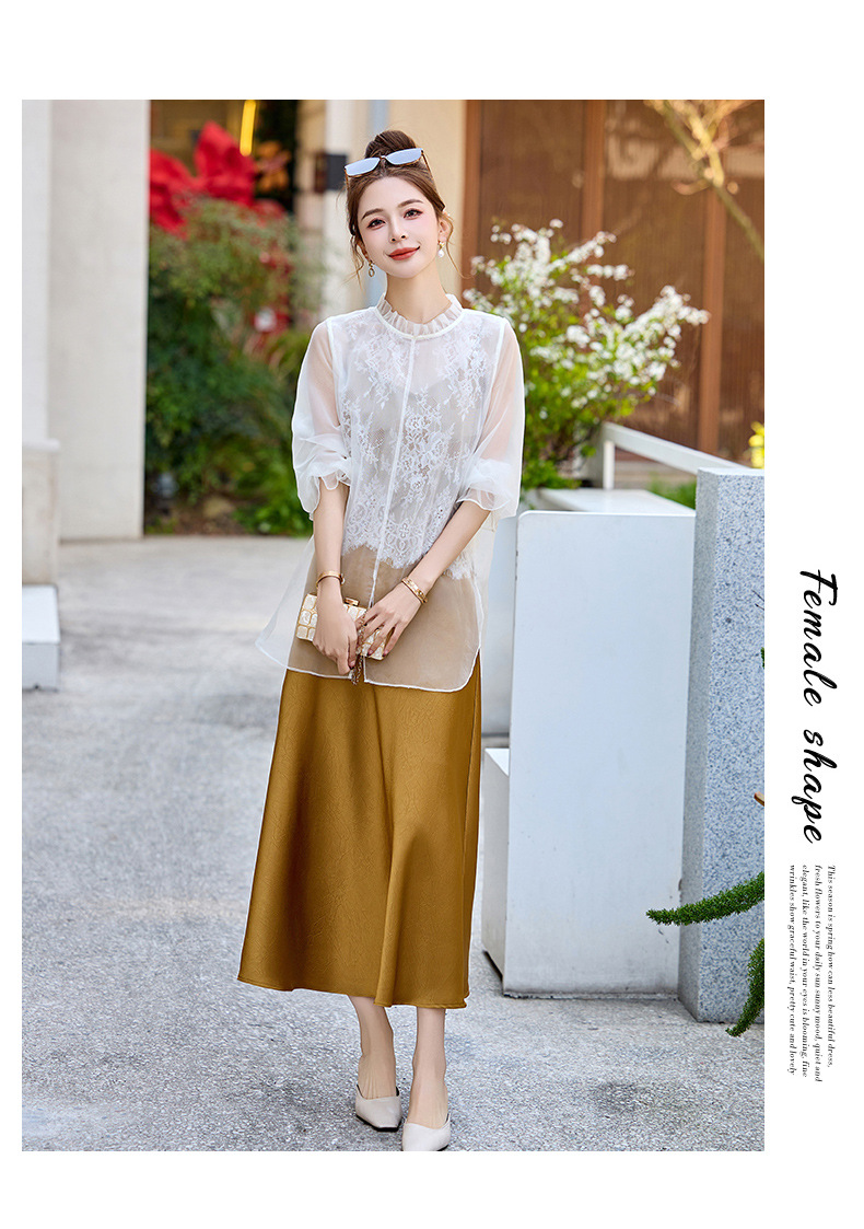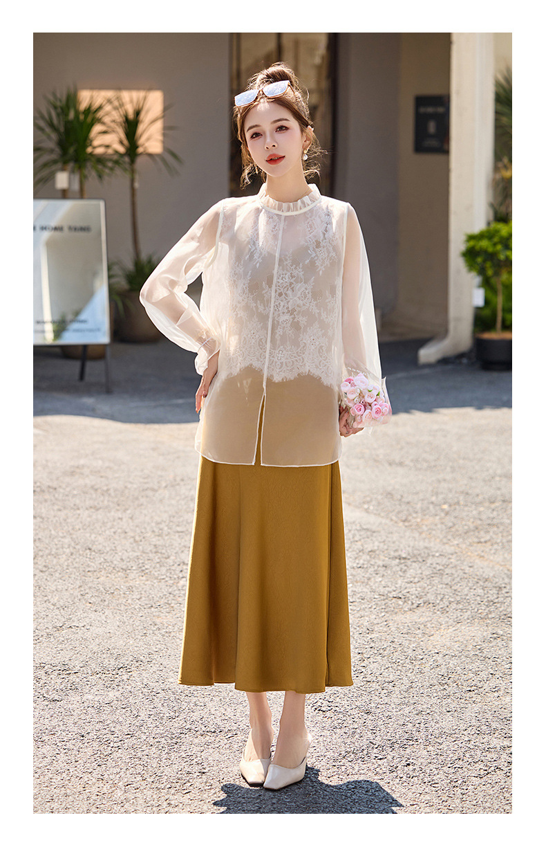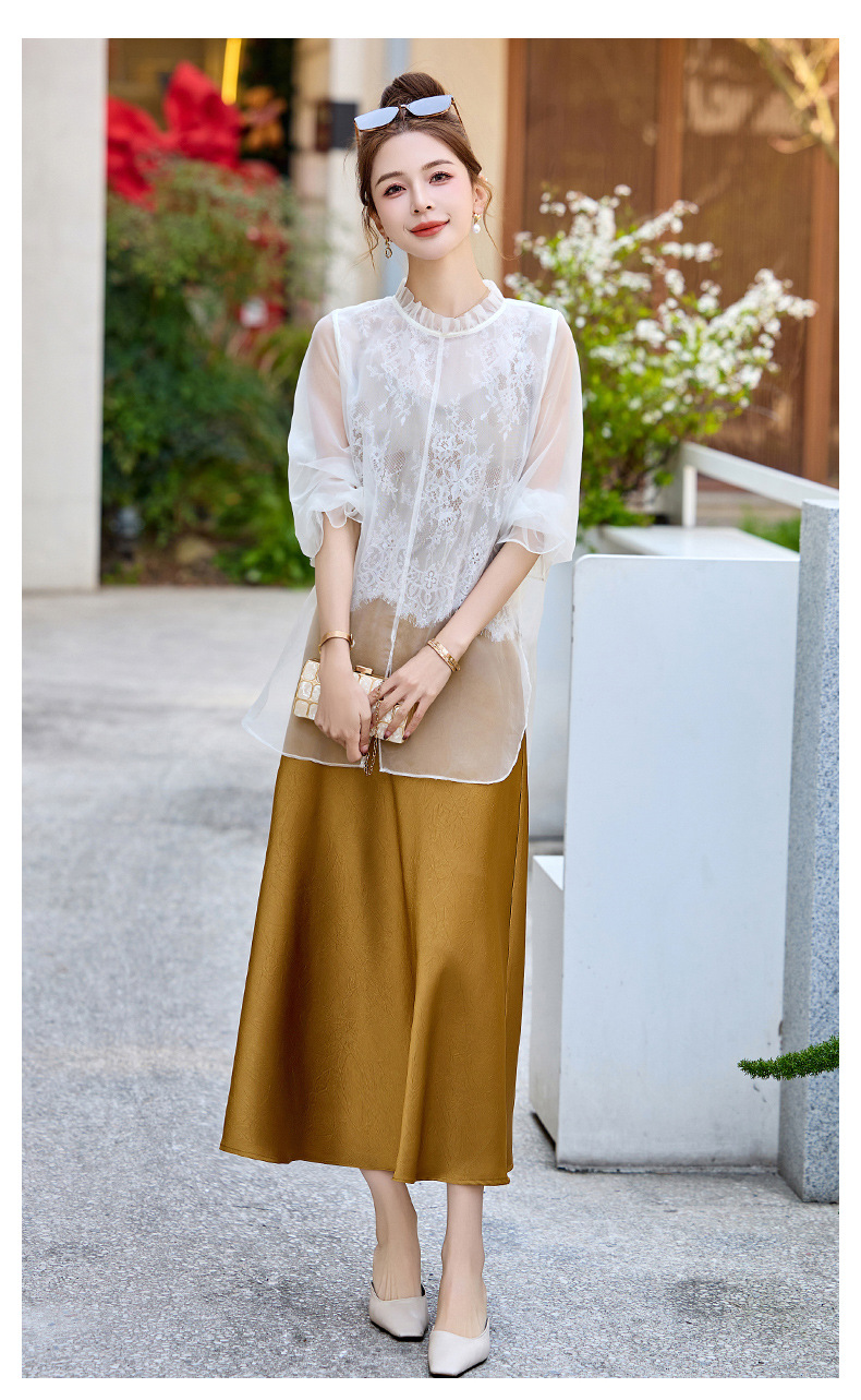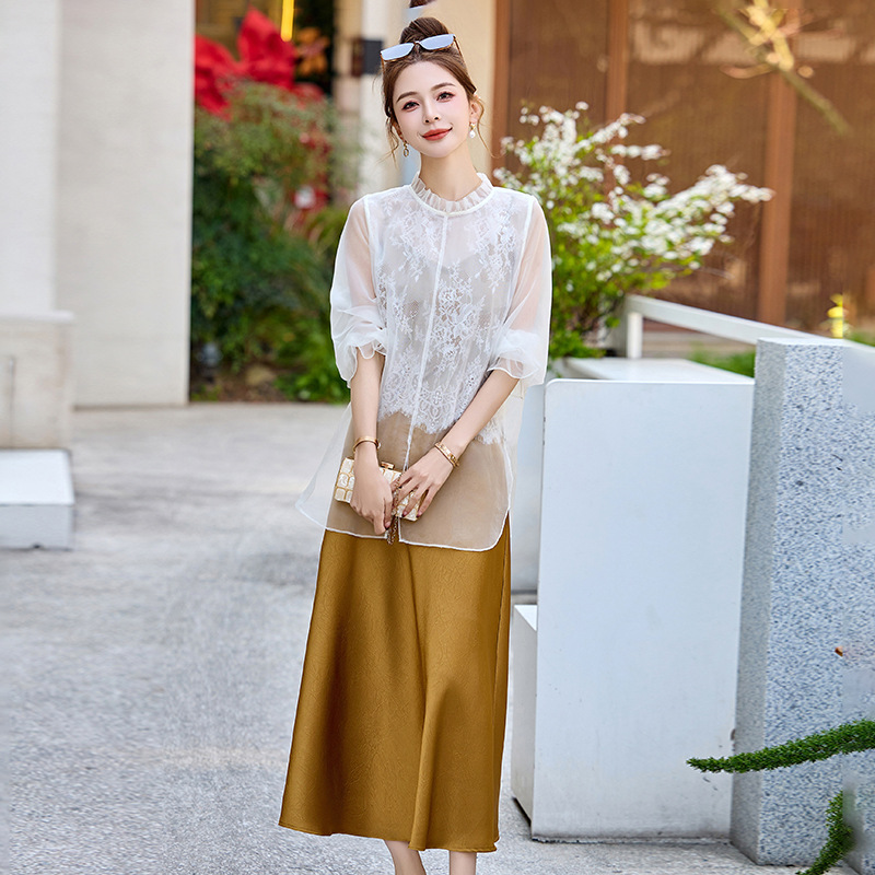 여성을위한 정장 2025 새로운 스타일 중국 스타일 복고풍 기질 메쉬 디자인 레이스 스탠드 칼라 자외선 차단 셔츠 정장 스커트